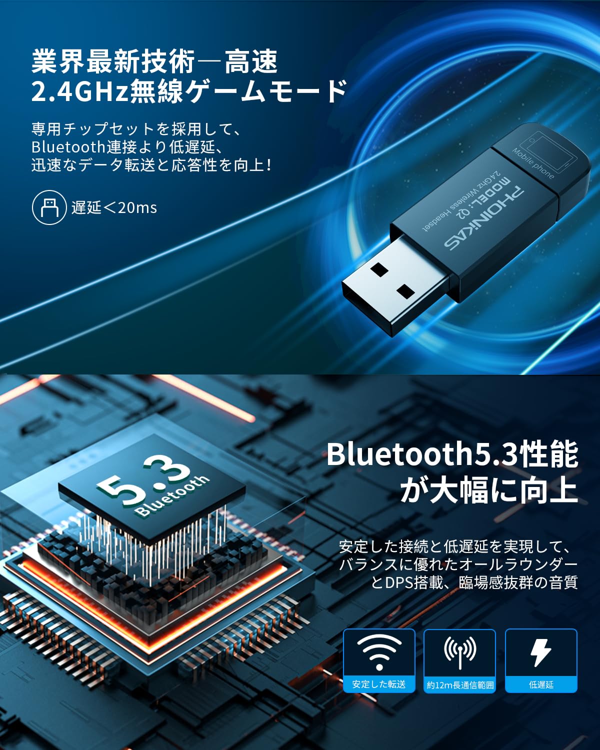 ゲーミングヘッドセット 有線 無線両用 低遅延 USB 2.4GHz Bluetooth 5.3 有線3WAY接続 ゲーミングヘッドホン 着脱式ノイズキャンセルマイク 45時間連続再生 重低音強化ヘッドセット pc ps5 ps4 スマホxboxone switch 対応ワイヤレスヘッドフォン ブルー