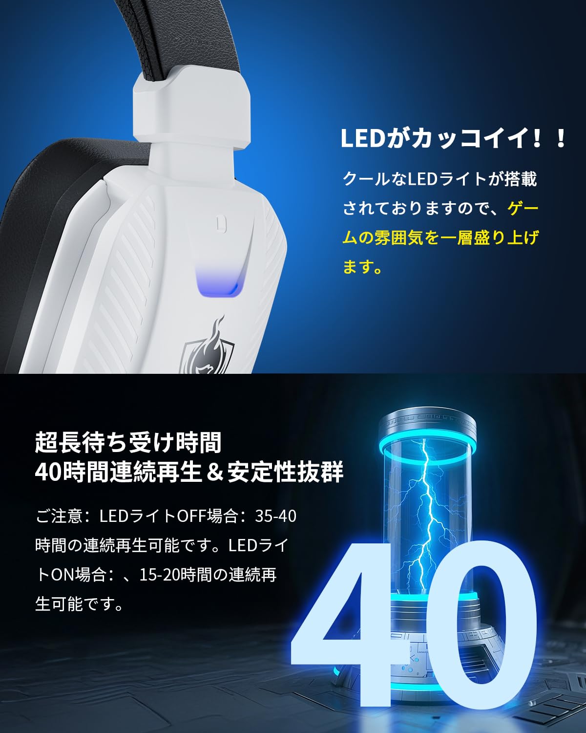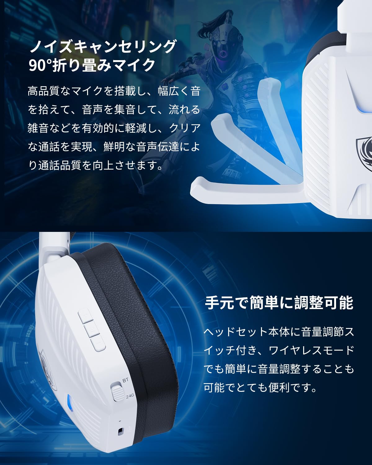 ゲーミングヘッドセット 有線 無線両用 低遅延 USB 2.4GHz Bluetooth 5.3 有線3WAY接続 ゲーミングヘッドホン 着脱式ノイズキャンセルマイク 45時間連続再生 重低音強化ヘッドセット pc ps5 ps4 スマホxboxone switch 対応ワイヤレスヘッドフォン 白