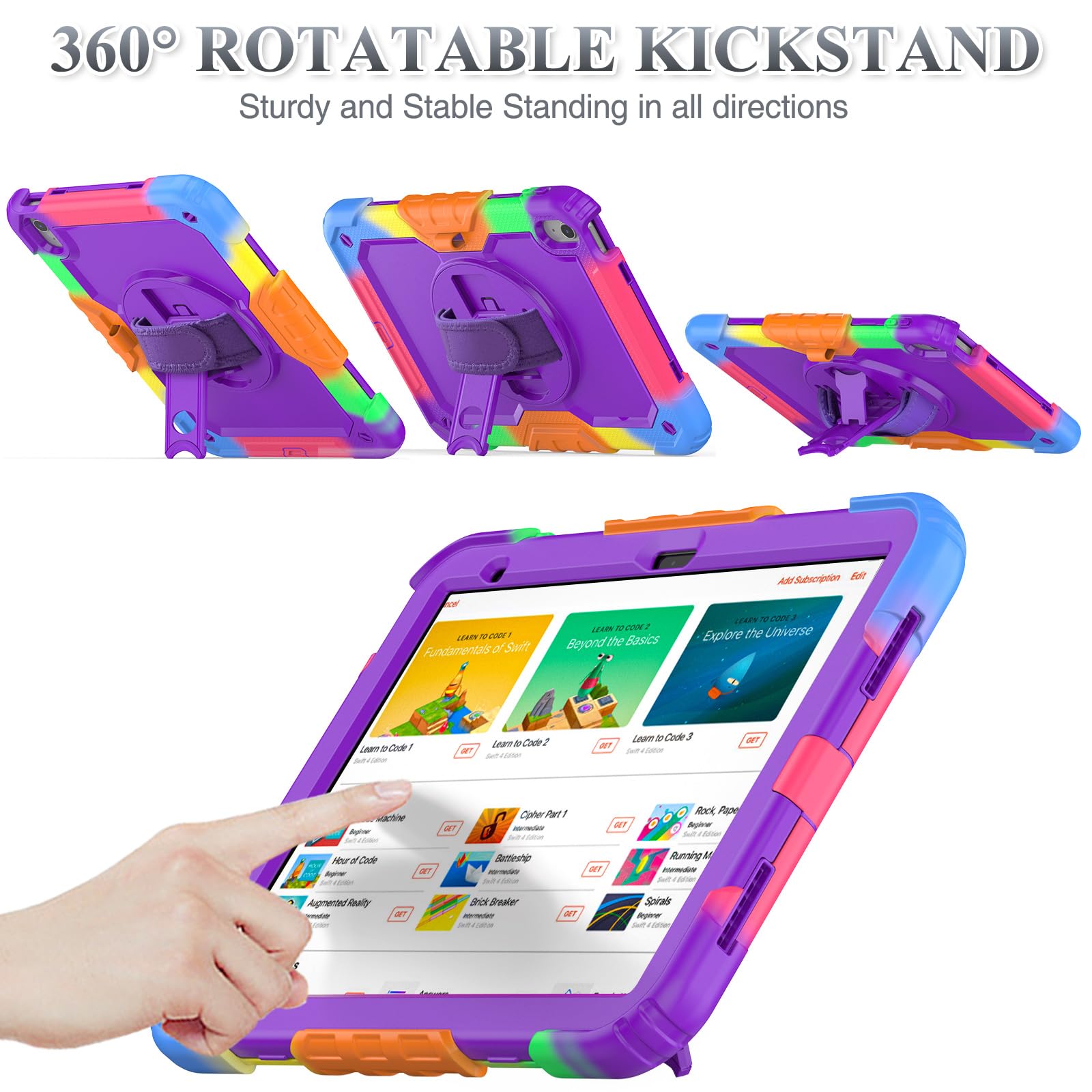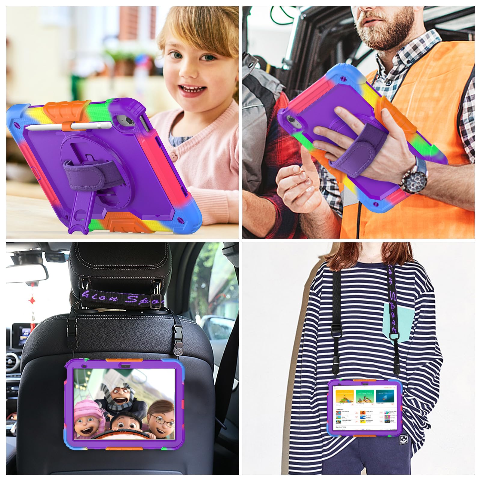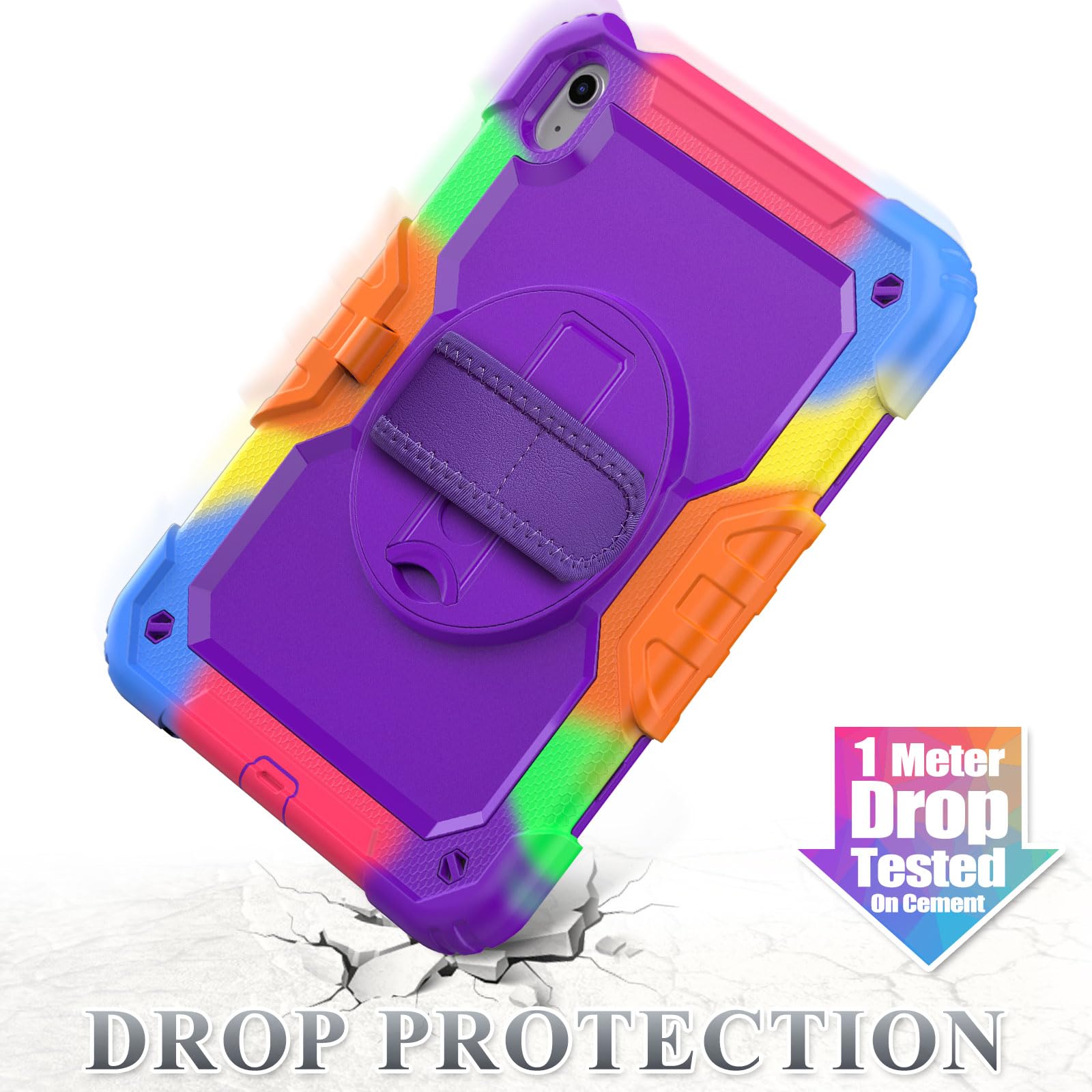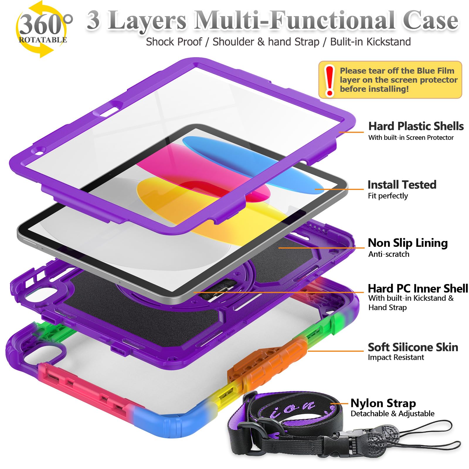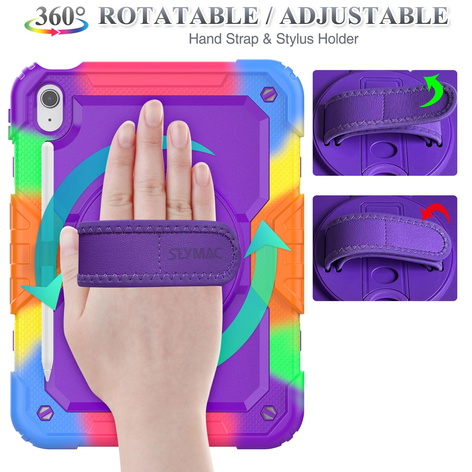 SEYMAC stock iPad(A16) 第11世代/第10世代専用ケース 耐衝撃 ペンホルダー フィルム付き前面カバー 横置き縦置きスタンド 360度回転ハンドストラップ ショルダーストラップ付き(色とりどりパープル)
