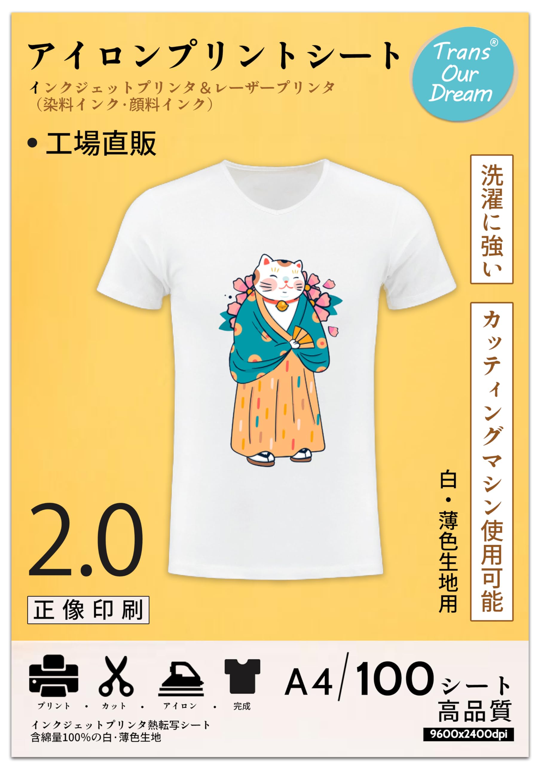 TransOurDream 真正の転写シート アイロンプリントシート2.0 正像印刷 A4 100枚 白·薄色生地用 転写紙 熱転写シート アイロン転写紙 アイロンプリント用紙 インクジェット・レーザー両方使用可能 JP-2-100