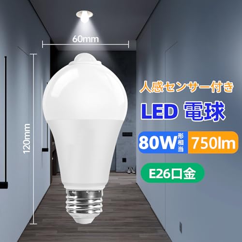 Pispoer LED電球、光センサーと人体センサー付き、E26口金、ハロゲン電球80 Wに相当し、色温度6000K、1個装