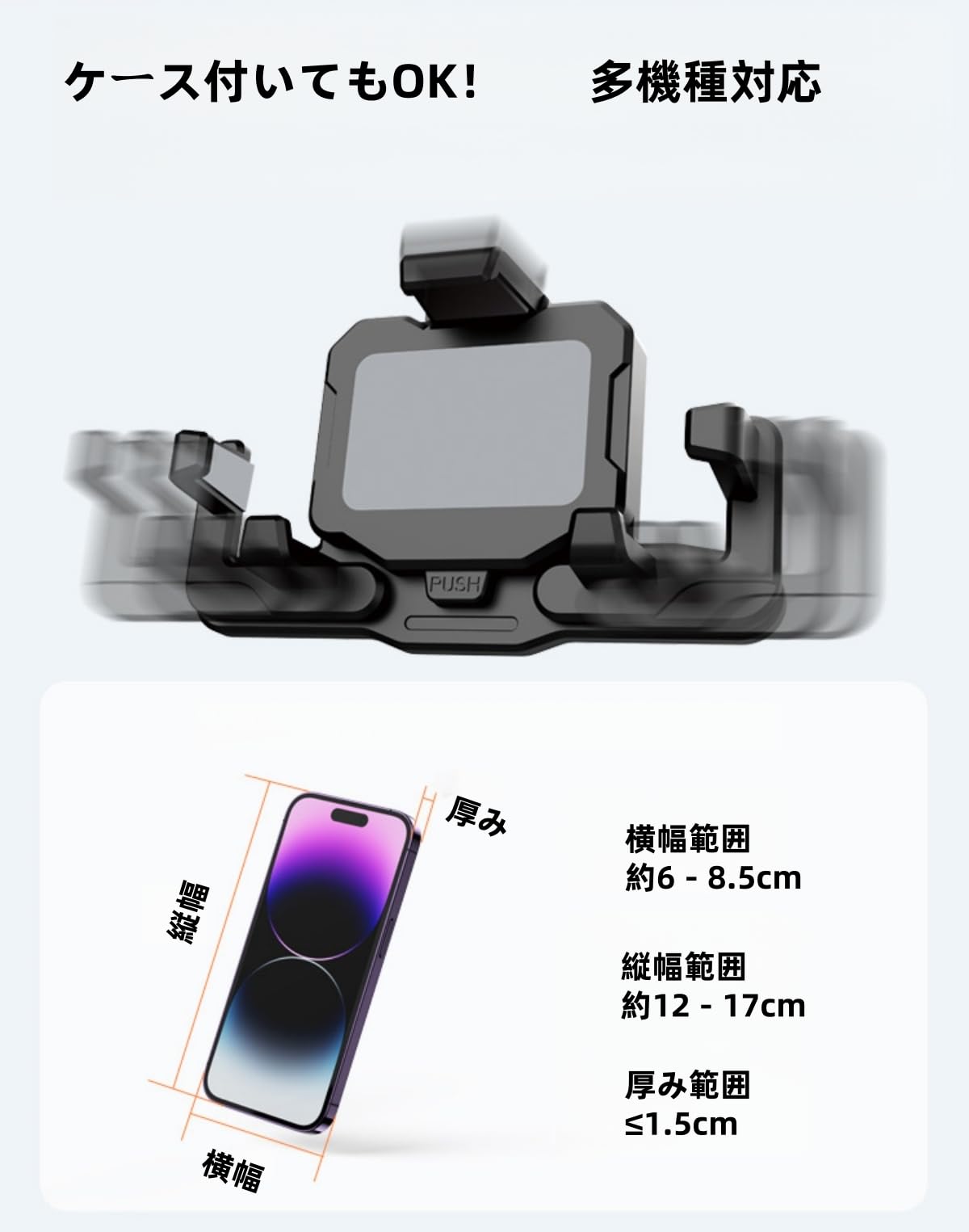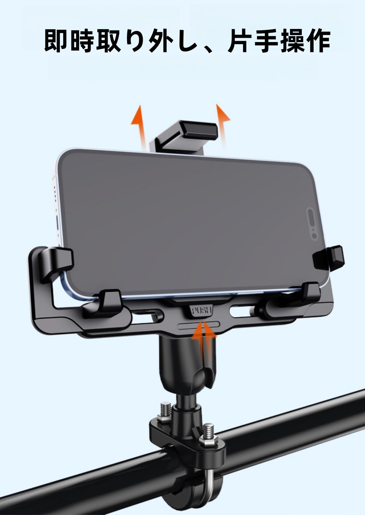 バイクやスクーター、自転車のハンドルバー/ミラーに簡単に取り付けられる、使いやすいスマートフォンホルダーです。360度回転機能を備え、縦向き・横向きなど、最適な視認角度に自由に調整可能。堅牢な黒色の本体は、走行時の振動や衝撃からスマートフォンをしっかりと保護します。ワンタッチで簡単に着脱できるプッシュボタン式を採用し、急な雨や停車時にもスピーディーな取り外しが可能。様々なサイズのスマートフォンに対応する汎用性の高い設計で、ナビゲーションアプリの使用時やツーリング中の携帯電話の固定に最適です。取り付け用のクランプは、一般的なハンドルバーのサイズに適合するよう設計されており、工具を使用して確実に固定できます。耐久性のある素材を使用し、長期間の使用に耐える信頼性の高い製品です。