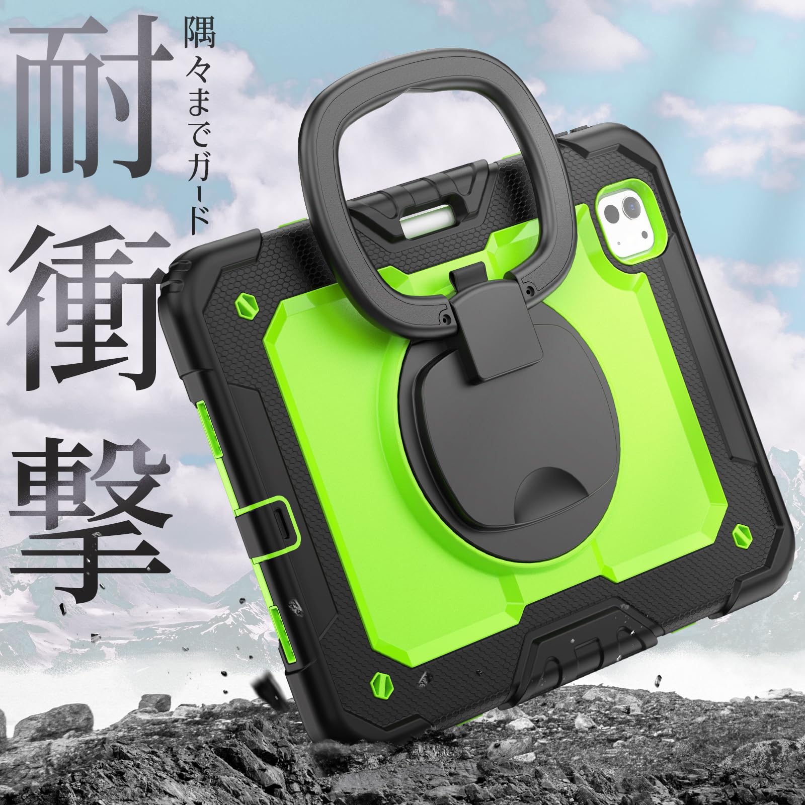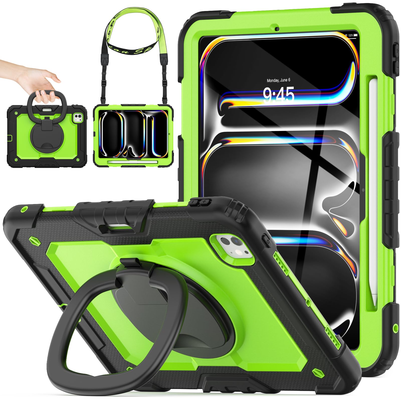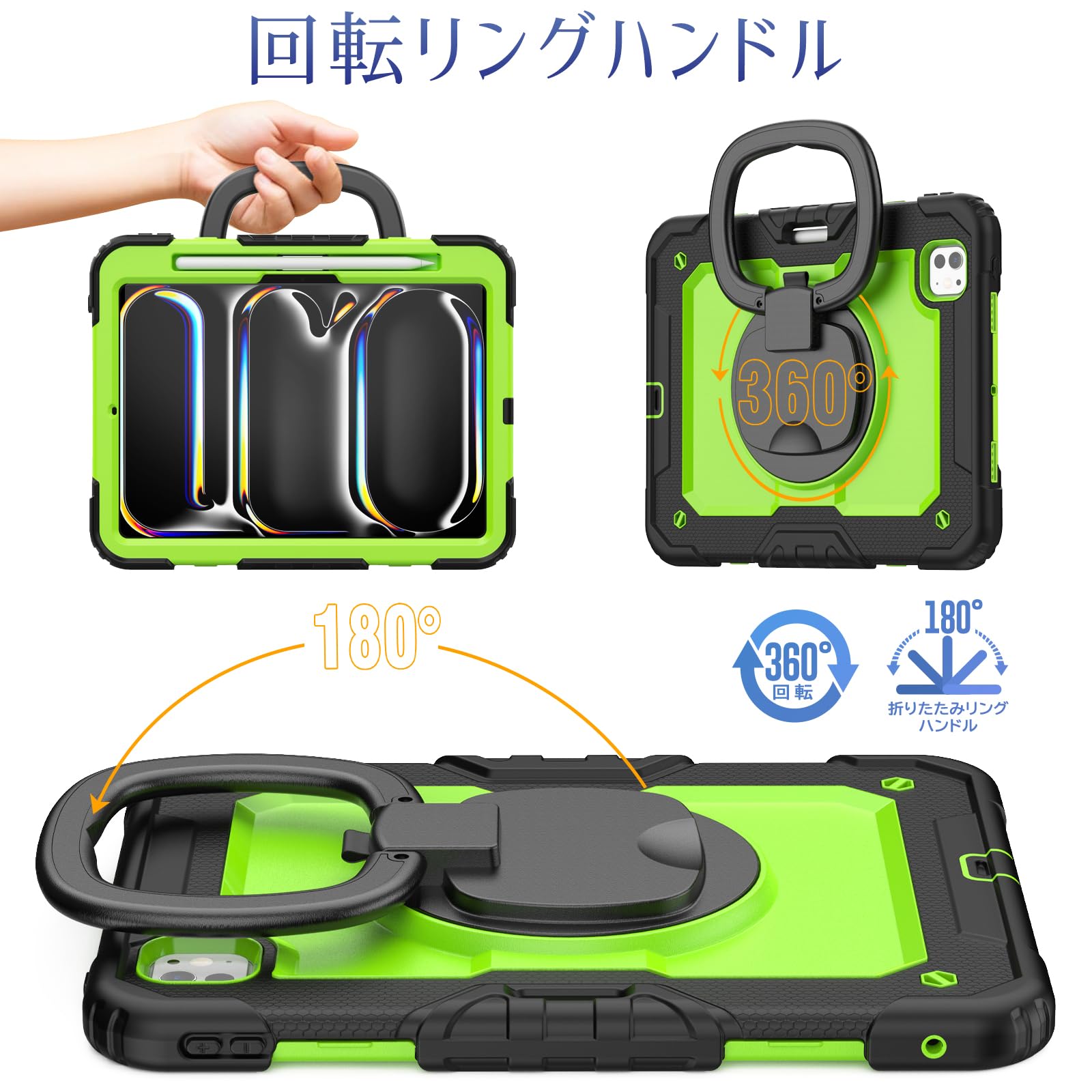 SEYMAC stock 2024年 iPad Pro 11インチ(M4)リングハンドル耐衝撃ケース 保護フィルム付き前面カバー ペン収納 360°回転リングハンドルスタンド ショルダーストラップ iPad Pro 11 第5世代専用型(グリーン)