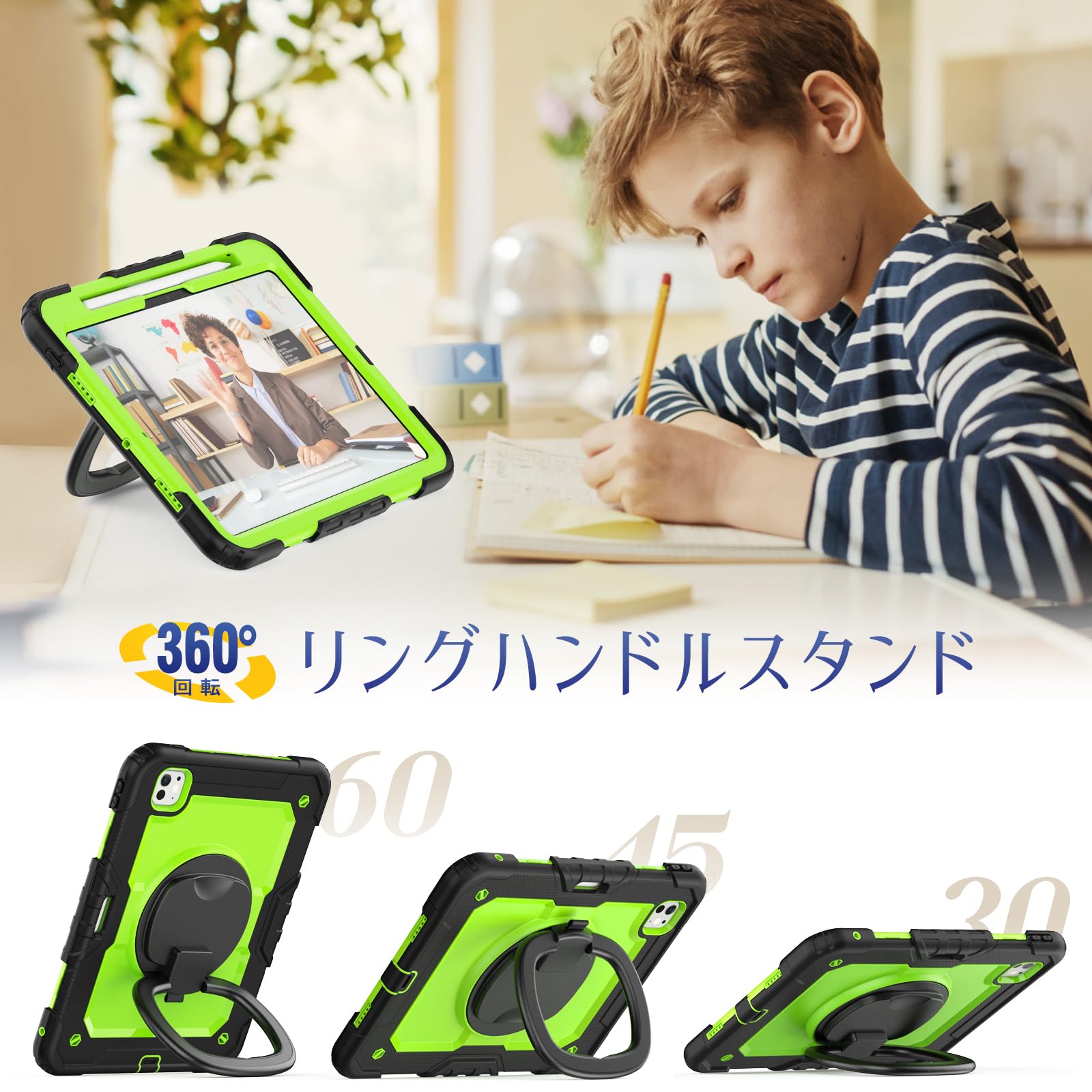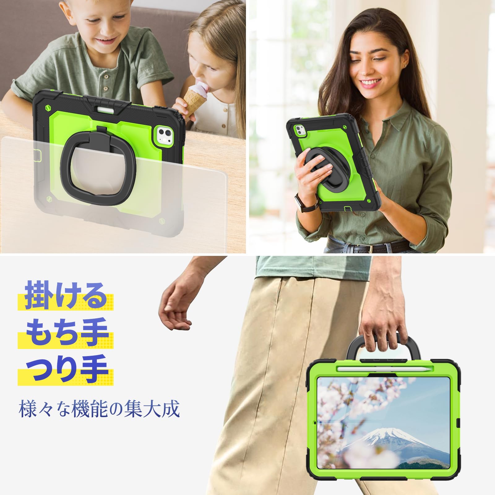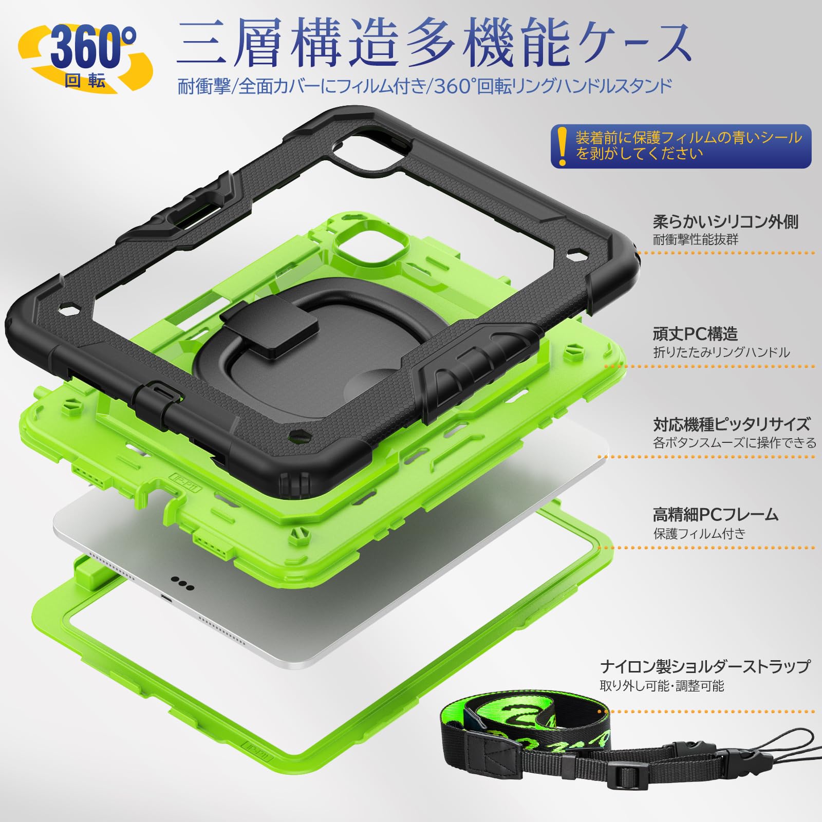 SEYMAC stock 2024年 iPad Pro 11インチ(M4)リングハンドル耐衝撃ケース 保護フィルム付き前面カバー ペン収納 360°回転リングハンドルスタンド ショルダーストラップ iPad Pro 11 第5世代専用型(グリーン)