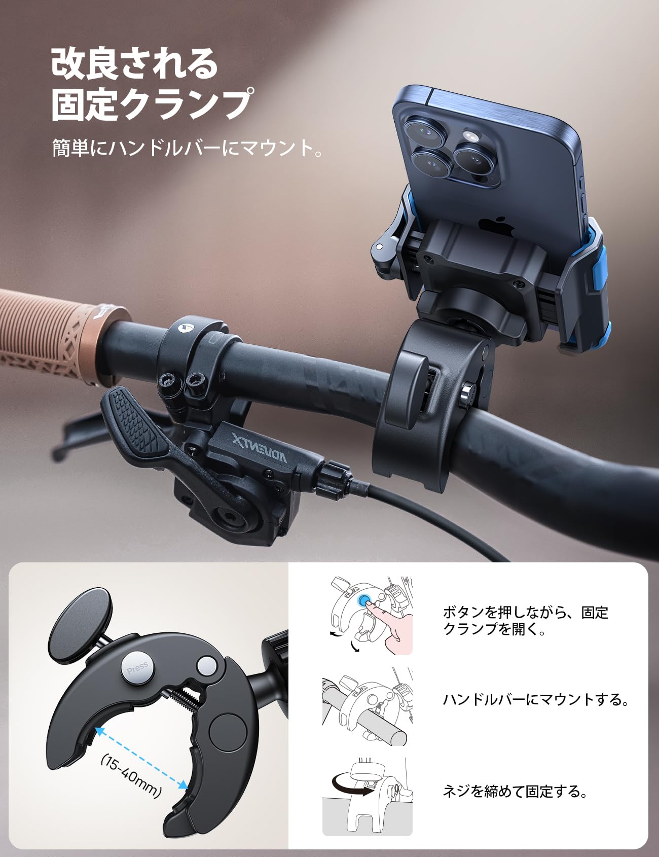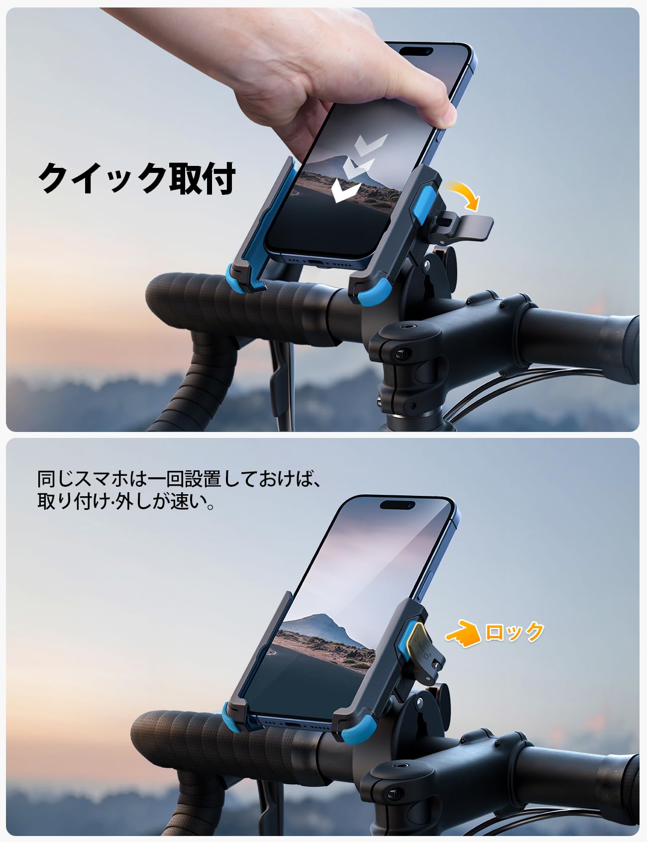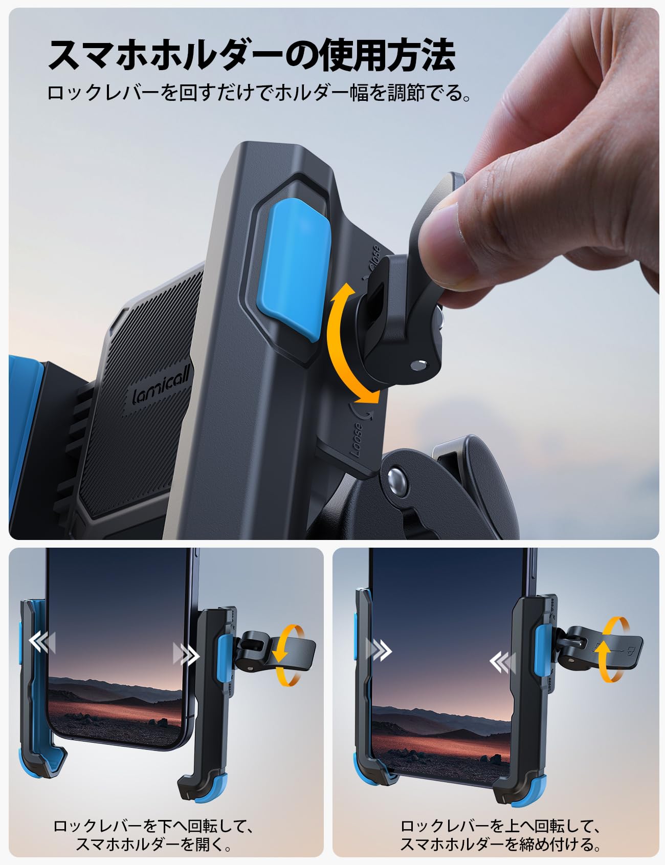 Lamicall クイック取付 自転車 スマホ ホルダー : 自転車 携帯ホルダー ロードバイク iphone bike mount 落下防止 360度回転 簡単取付 iPhone 17 17 pro 17 pro max 17 Air iPhone 16e 16 Plus max 15/14/13/12/11 android 4.7-7インチに対応 ブルー