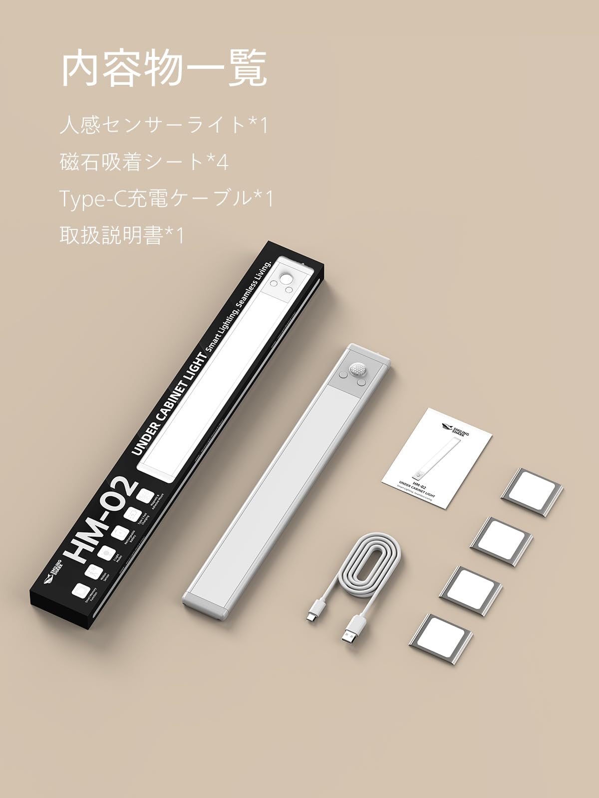 Smiling Shark 人感センサーライト HM01【2025新設計・1-3m高精度感知・無段階調節】高輝度室内照明 キッチンライト 無段階調節 20CM 暖 ・白・自然光 3~6000K 充電式 自動点灯消灯 1200mAh 8時間連続使用 耐久性 マグネット式 簡単設置 LEDバーライト 手元・足元・玄関灯 多場面適用 クローゼット/キッチン/廊下/寝室用 日本語取扱説明書 1個入