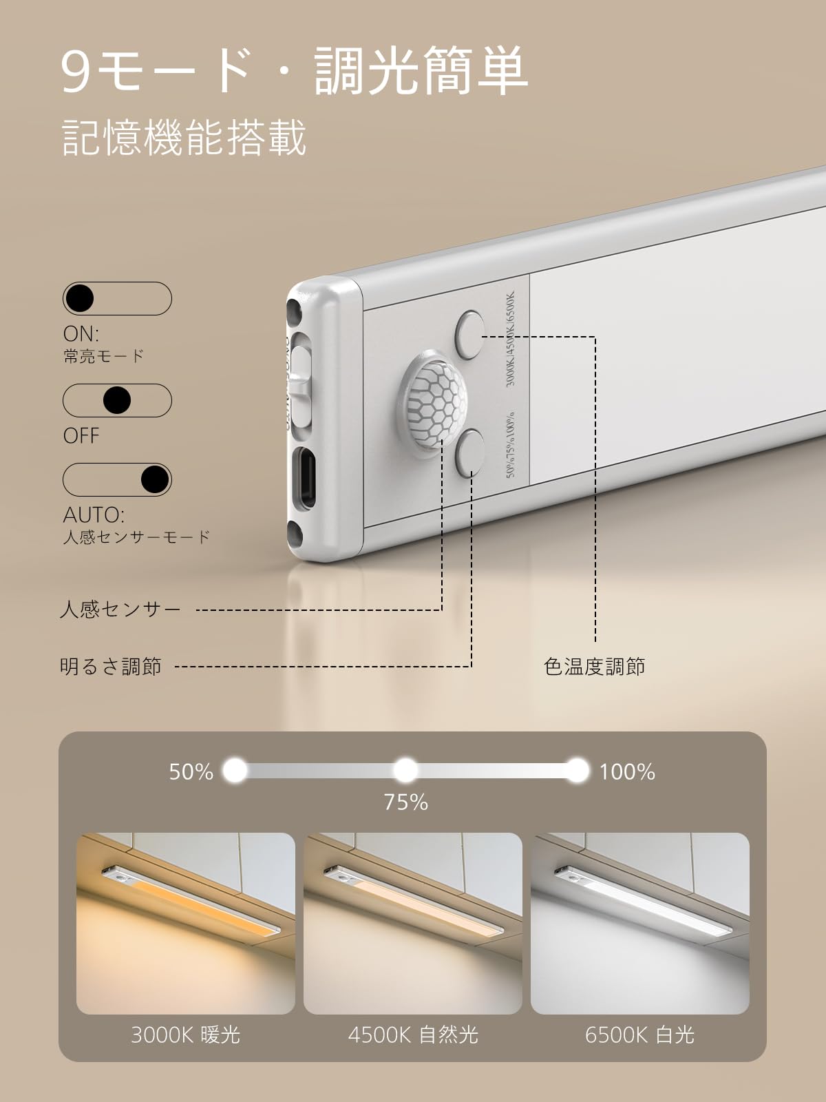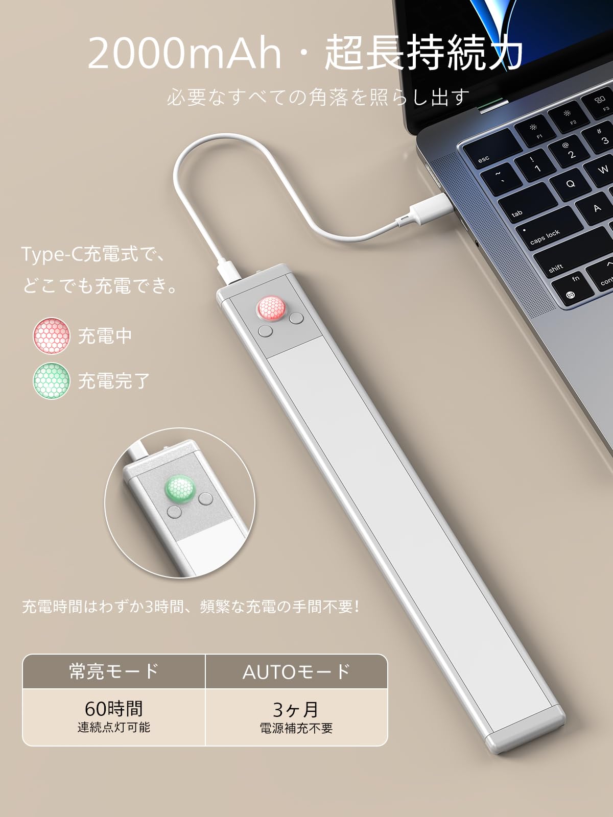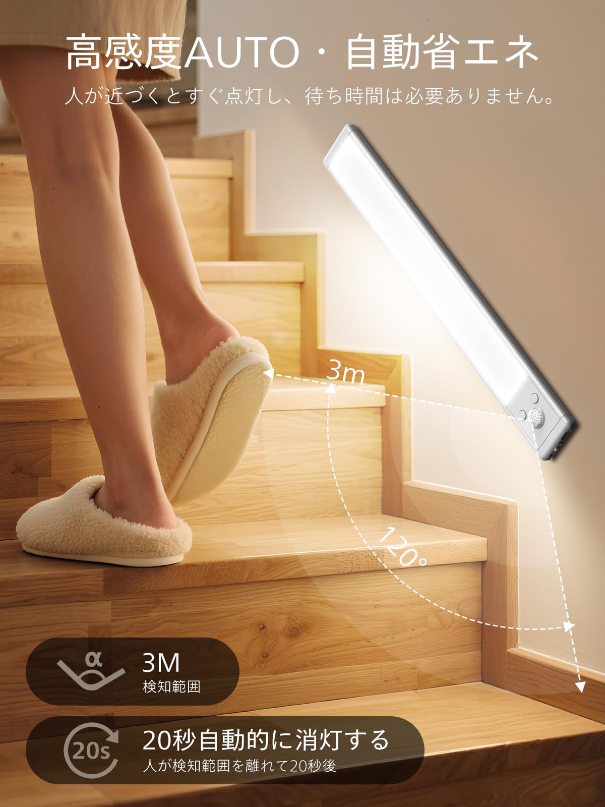 【連続点灯60時間可】人感センサーライト 充電式 室内 マグネット ライト ledライトバー LEDバーライト 読書灯 棚下ライト Type-C 充電式 無段階調光 キッチン用 屋内 寝室 廊下 階段 玄関 階段 3000K/4500K/6000K 電球色 昼白色 昼光色調整 30cm 2本