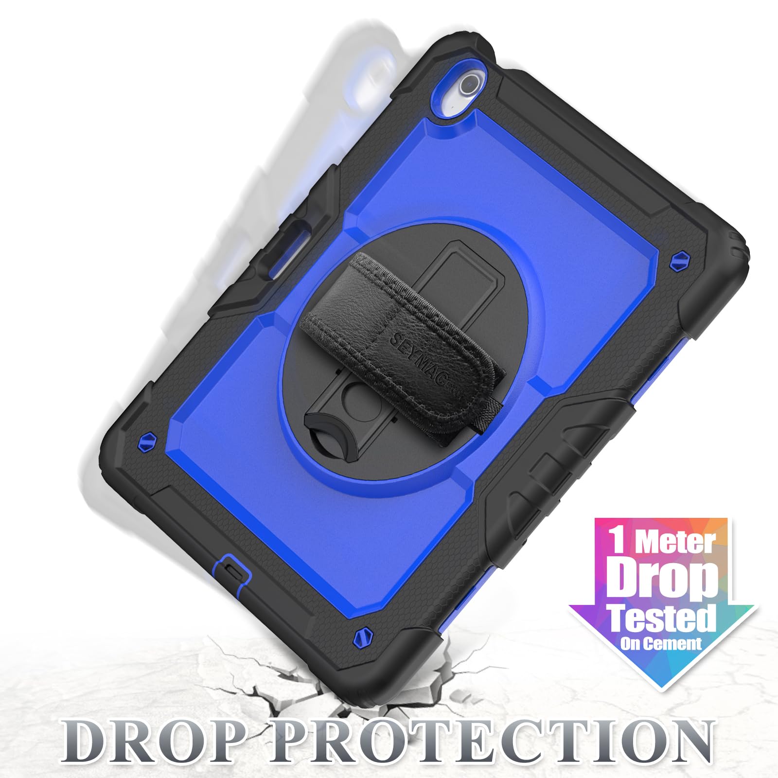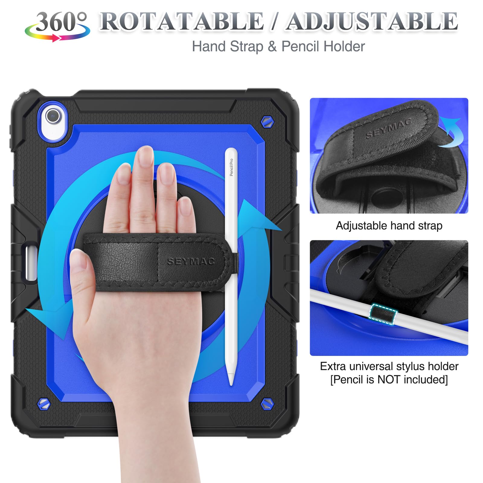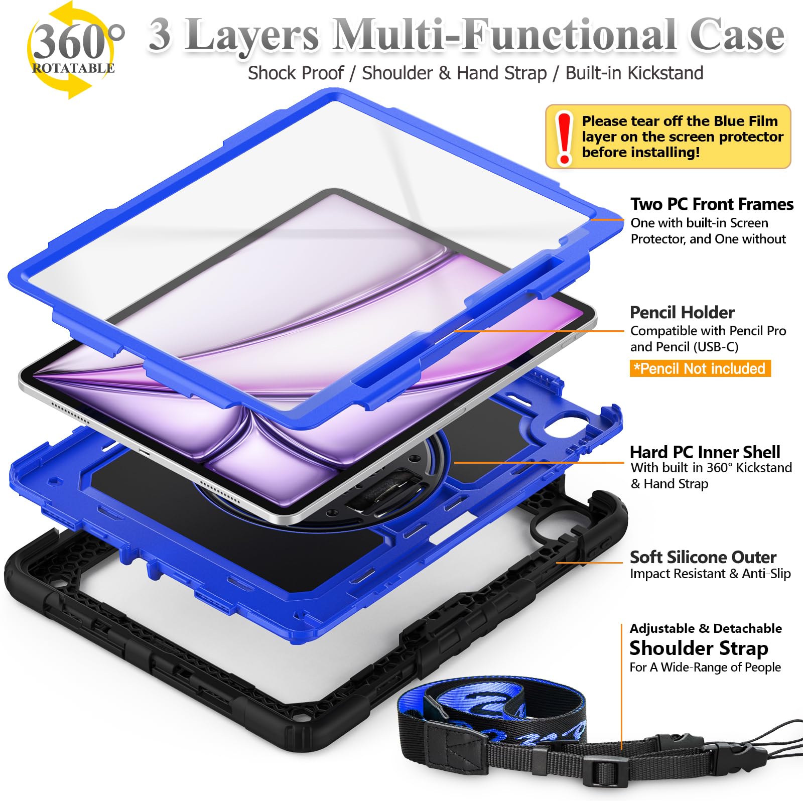 SEYMAC stock 2025年/2024年 13インチiPad Air(M3/M2)耐衝撃ケース 保護フィルム付き ペン収納 360°回転スタンド ハンドストラップ ショルダーストラップ 全面保護カバー iPad Air 13 2025/2024専用型(ブルー)