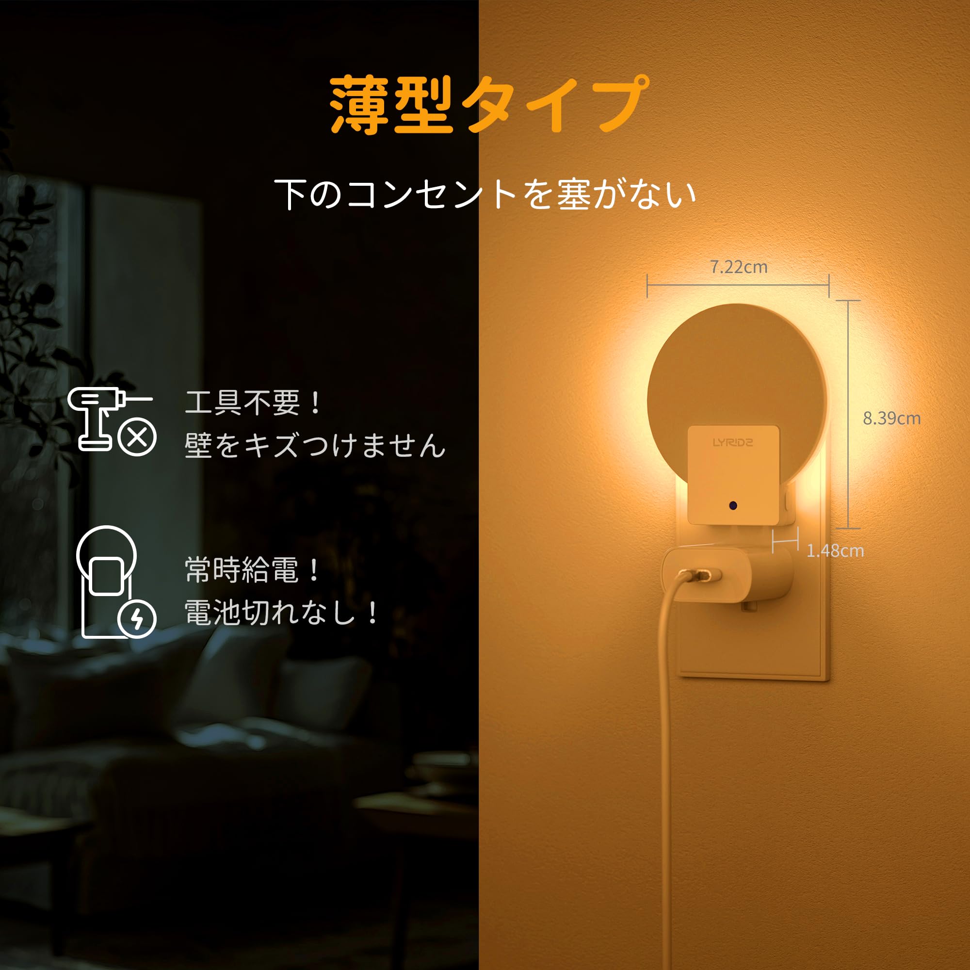 Lyridz LEDセンサーライト 足元灯 コンセント 人感センサーライト 室内 常夜灯 無段階調光 3モード フットライト 省エネ 廊下 寝室 玄関 階段 電球色 【2個セット·PSE取得済·日本語説明書付】
