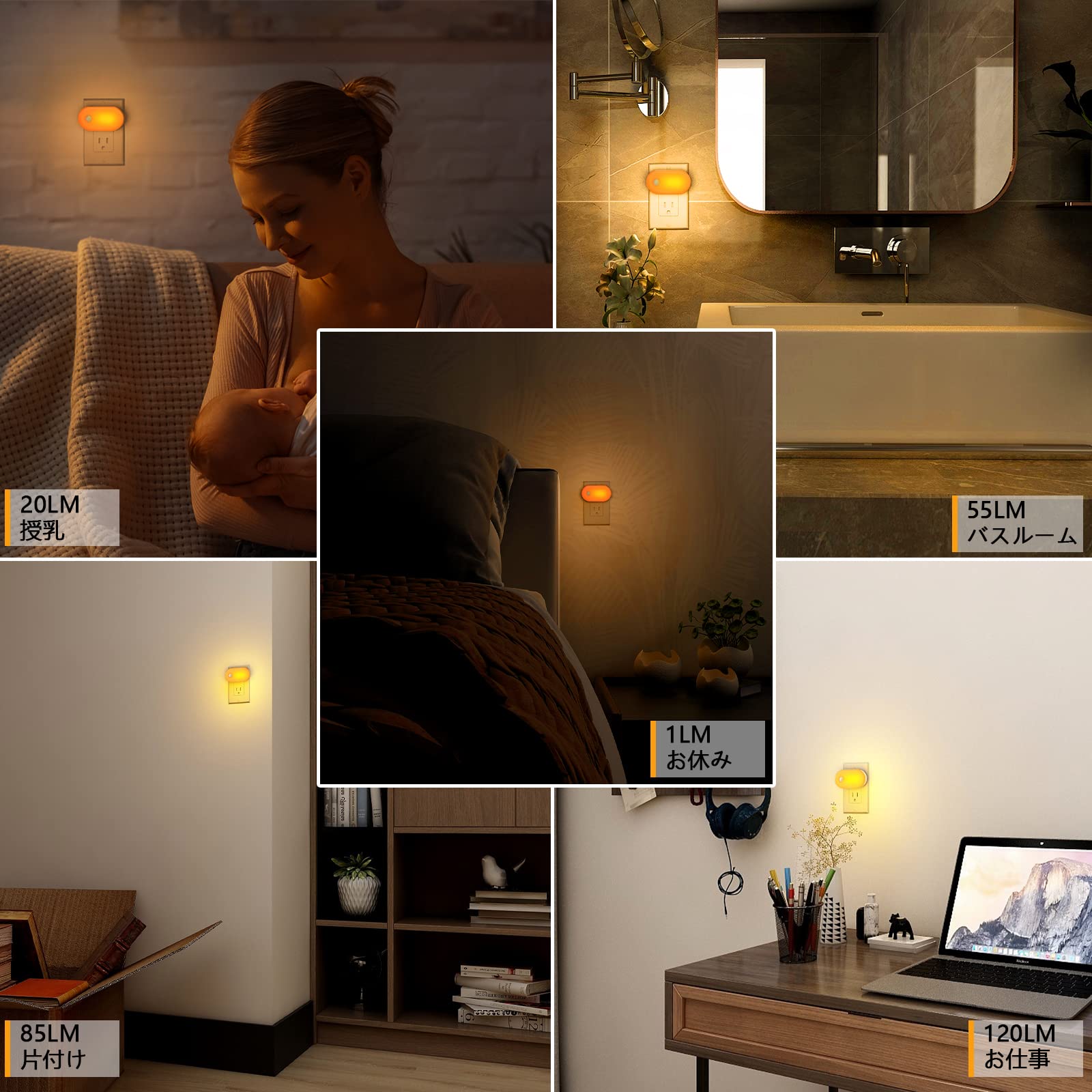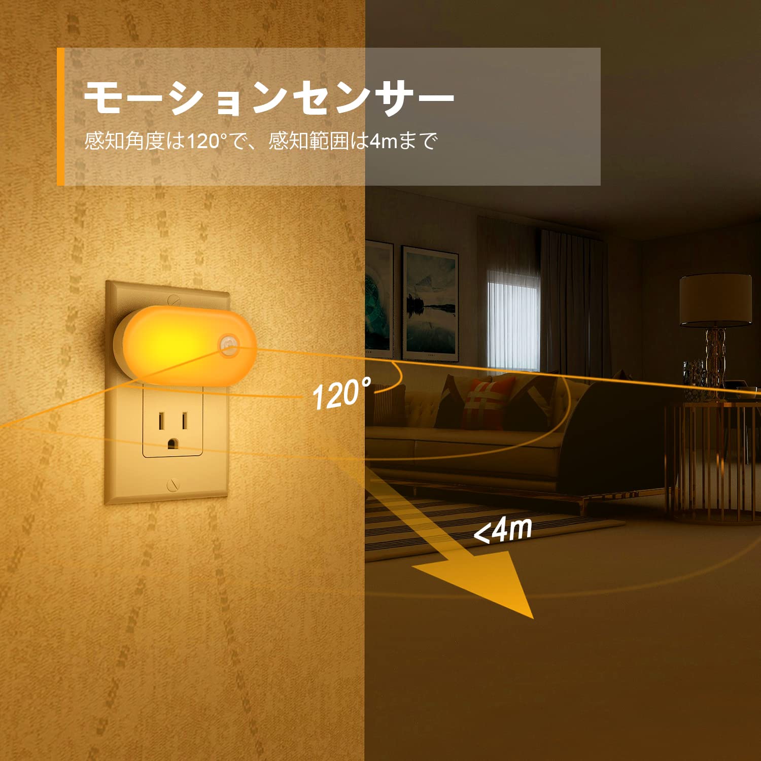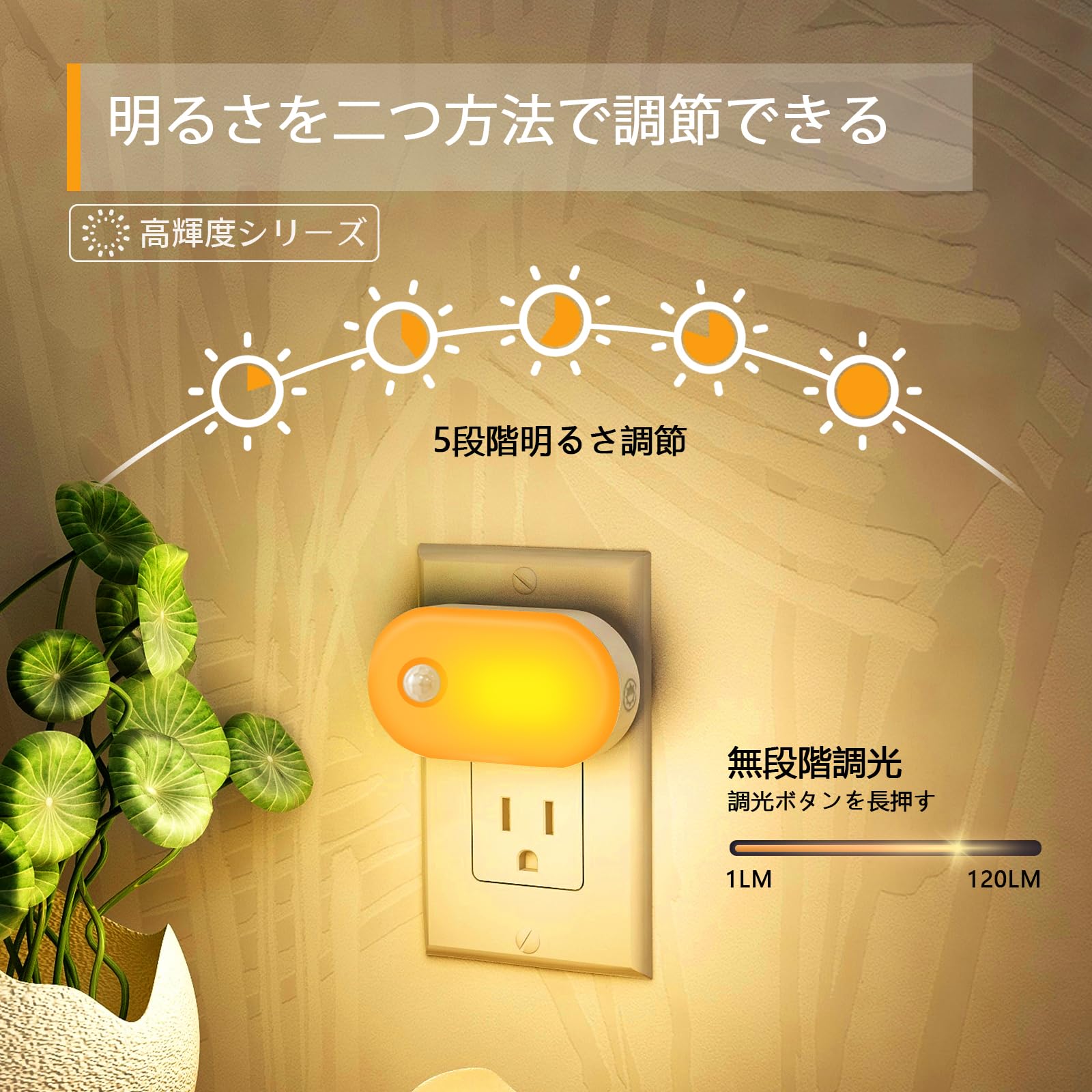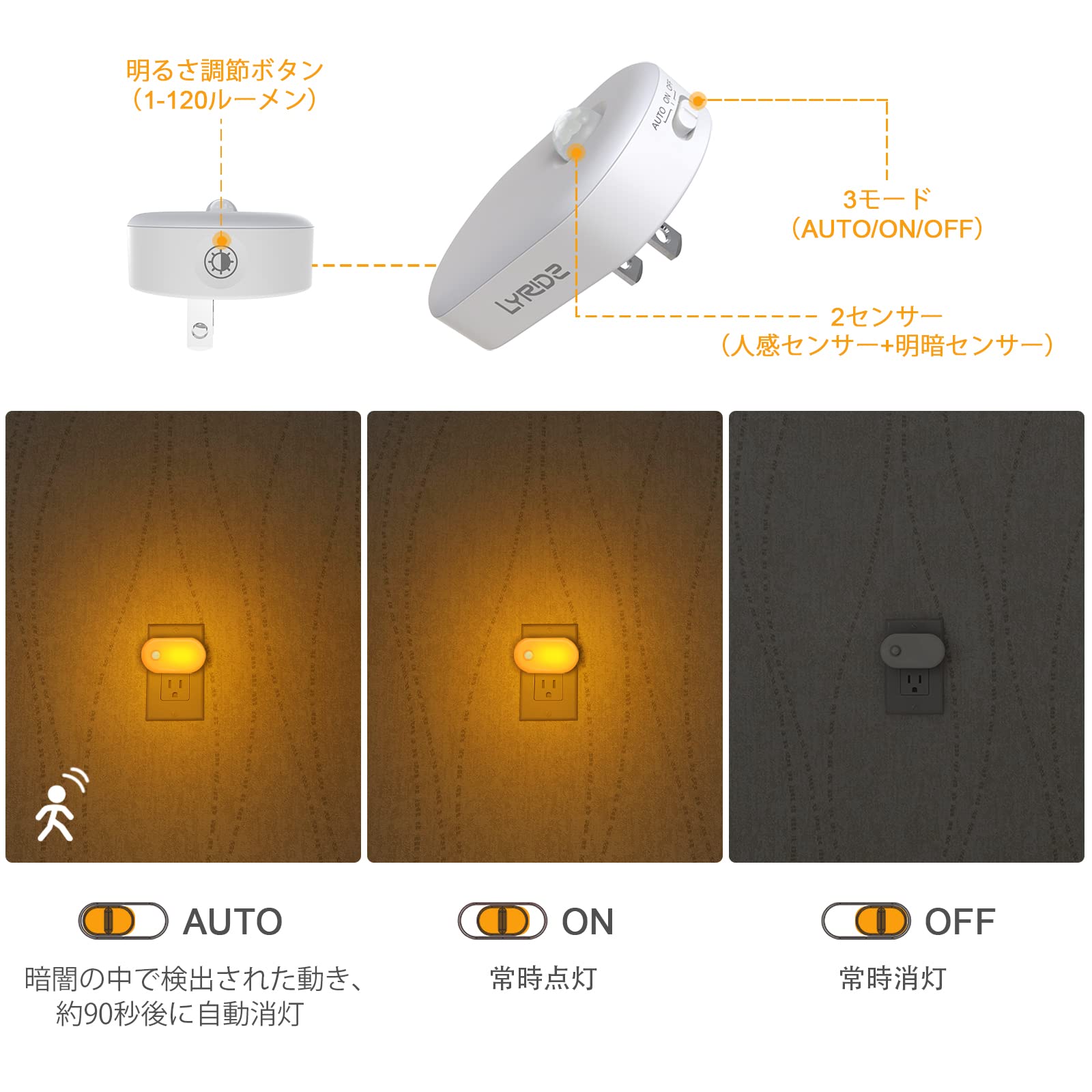 Lyridz 人感センサーライト 室内 コンセント 足元灯 1〜120ルーメン調光可 フットライト 常夜灯 ledセンサーライト 省エネ 琥珀色 廊下 玄関 階段 寝室 【2個セット·PSE取得済·日本語取説】