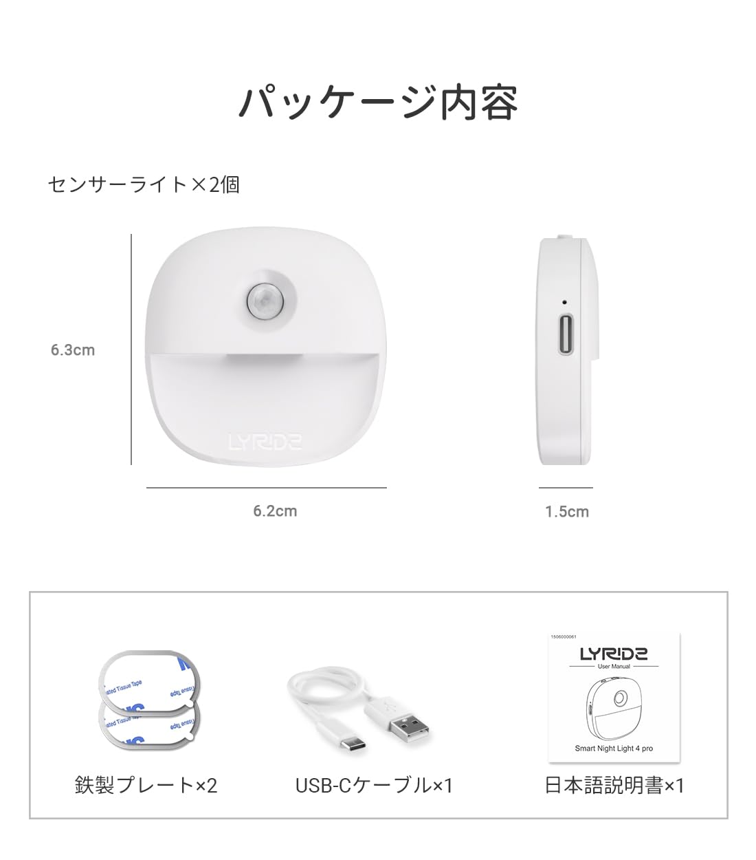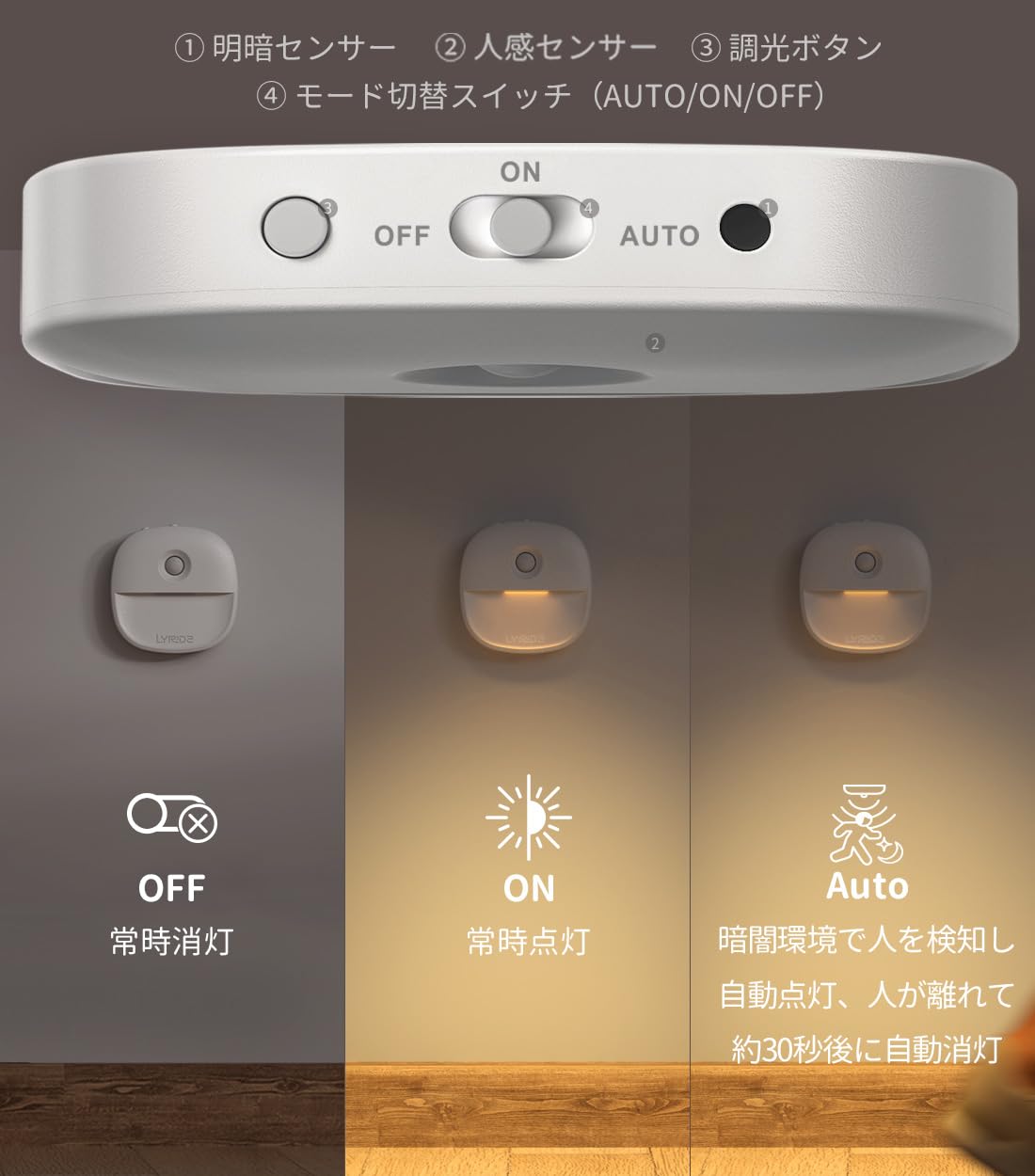 Lyridz センサーライト usb充電式 足元灯 人感センサーライト 室内 足元ライト 無段階調光 常夜灯 led フットライト 3モード ナイトライト 電球色 省エネ 薄型 廊下 寝室 玄関 階段 納戸 【2個入り·日本語取説】