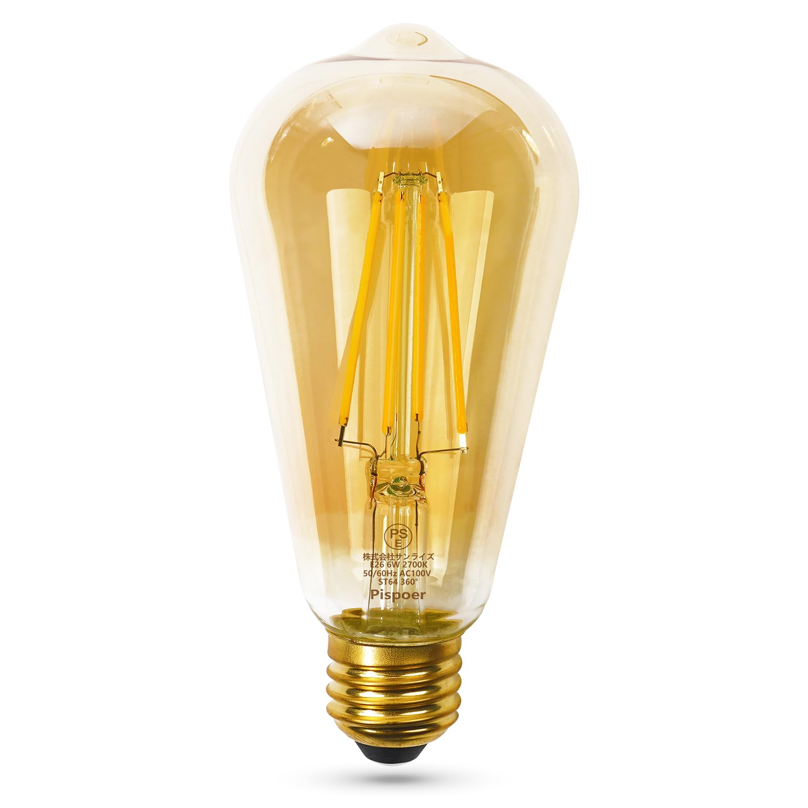 Pispoer|フィラメント LED電球| エジソン電球6W E26口金 60W形相当|電球色|820LM エジソンランプ ST64 広配光|琥珀色|シャンデリア用 レトロ電球|調光器非対応| 1個入り
