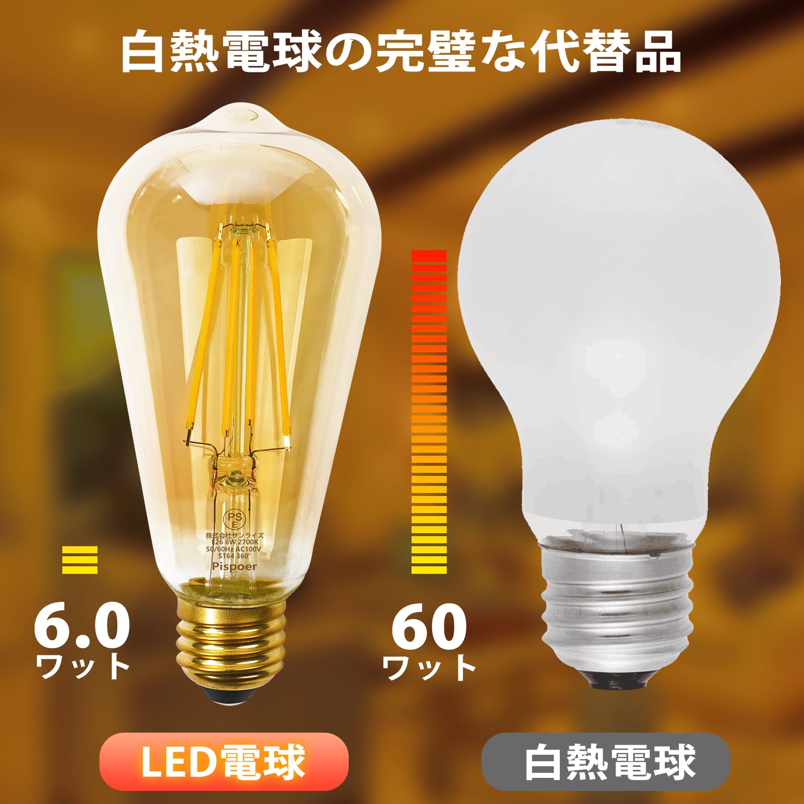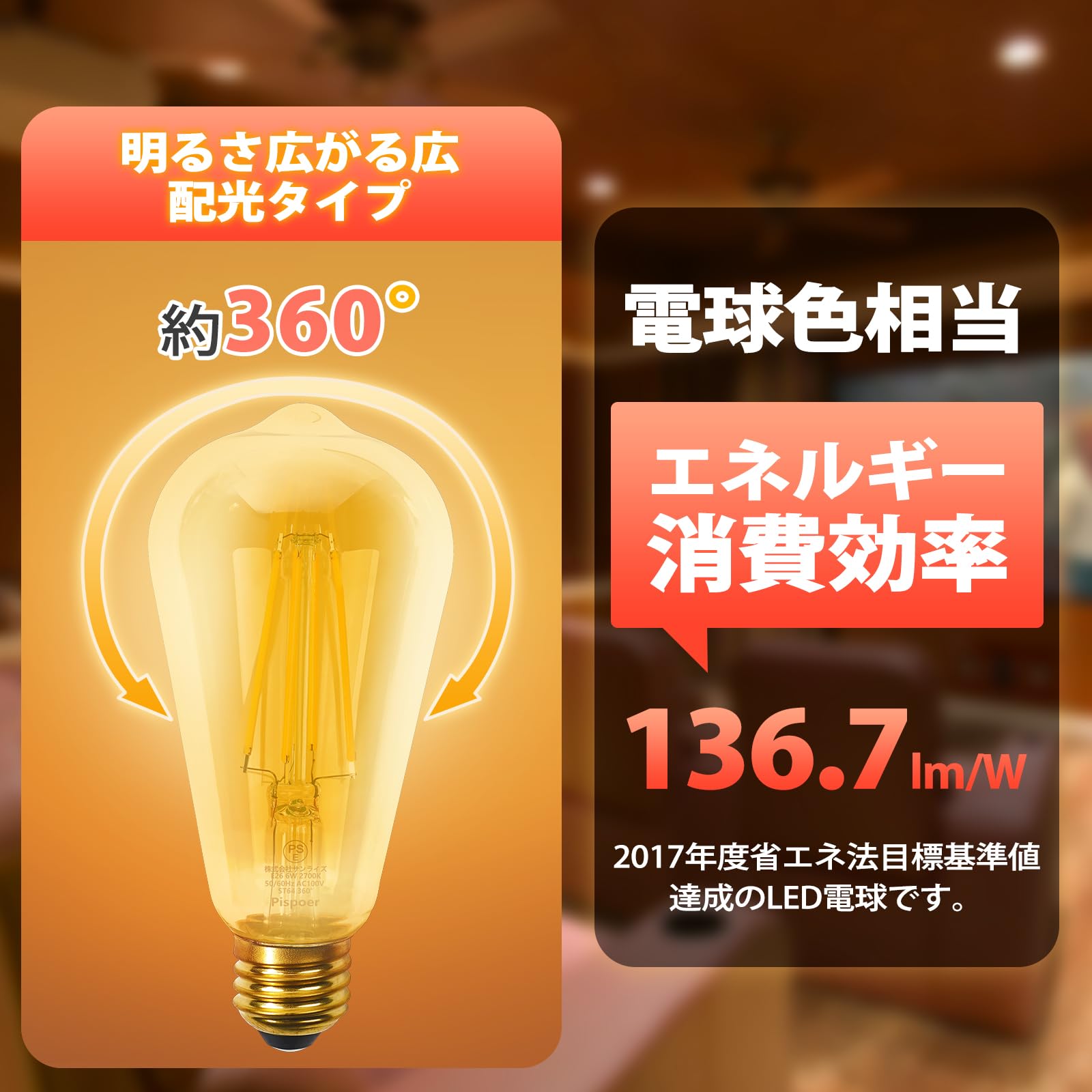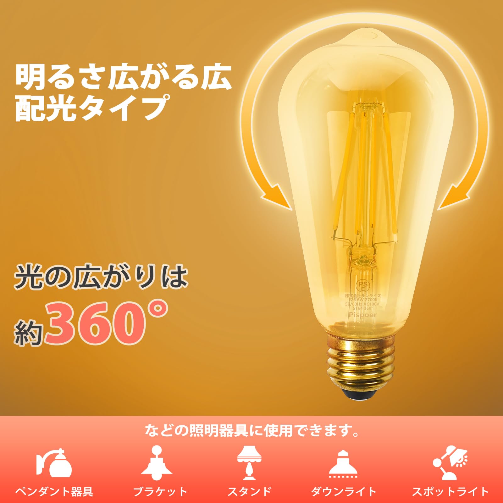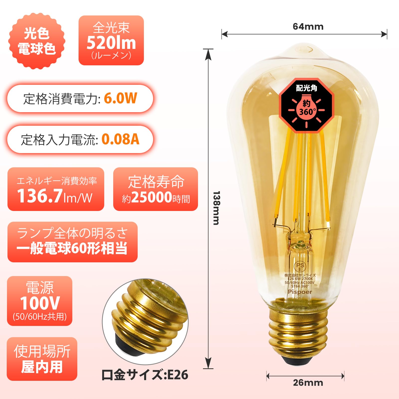 Pispoer|フィラメント LED電球| エジソン電球6W E26口金 60W形相当|電球色|820LM エジソンランプ ST64 広配光|琥珀色|シャンデリア用 レトロ電球|調光器非対応| 2個入り