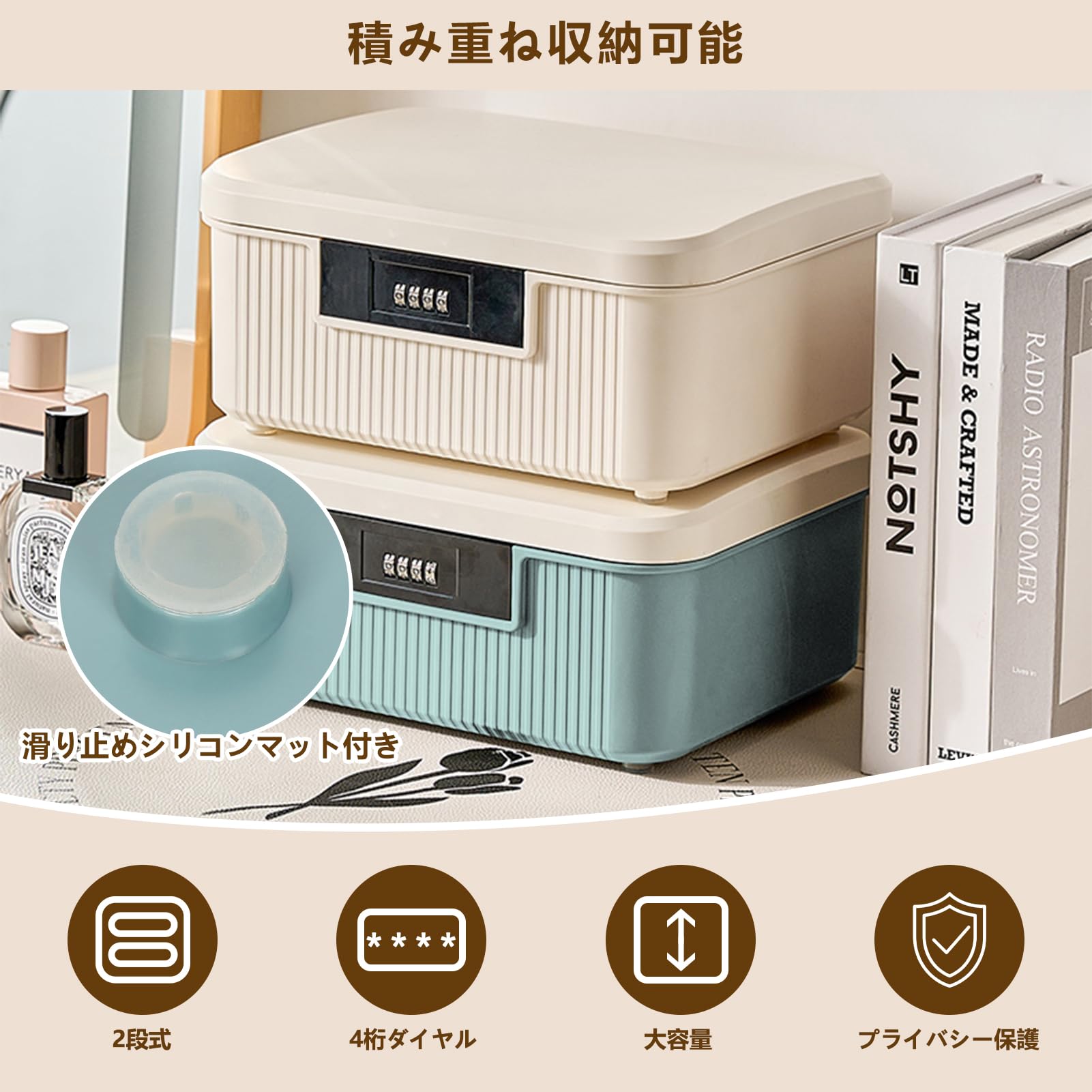 yazi 金庫 家庭用 小型 ダイヤル式 コンビネーションロック 収納ボックス 大容量2段式 16L ミニ金庫 プラスチック製 貯金箱 キャッシュ・重要書類・銀行カード 貴重品入れ (ベージュ, L)