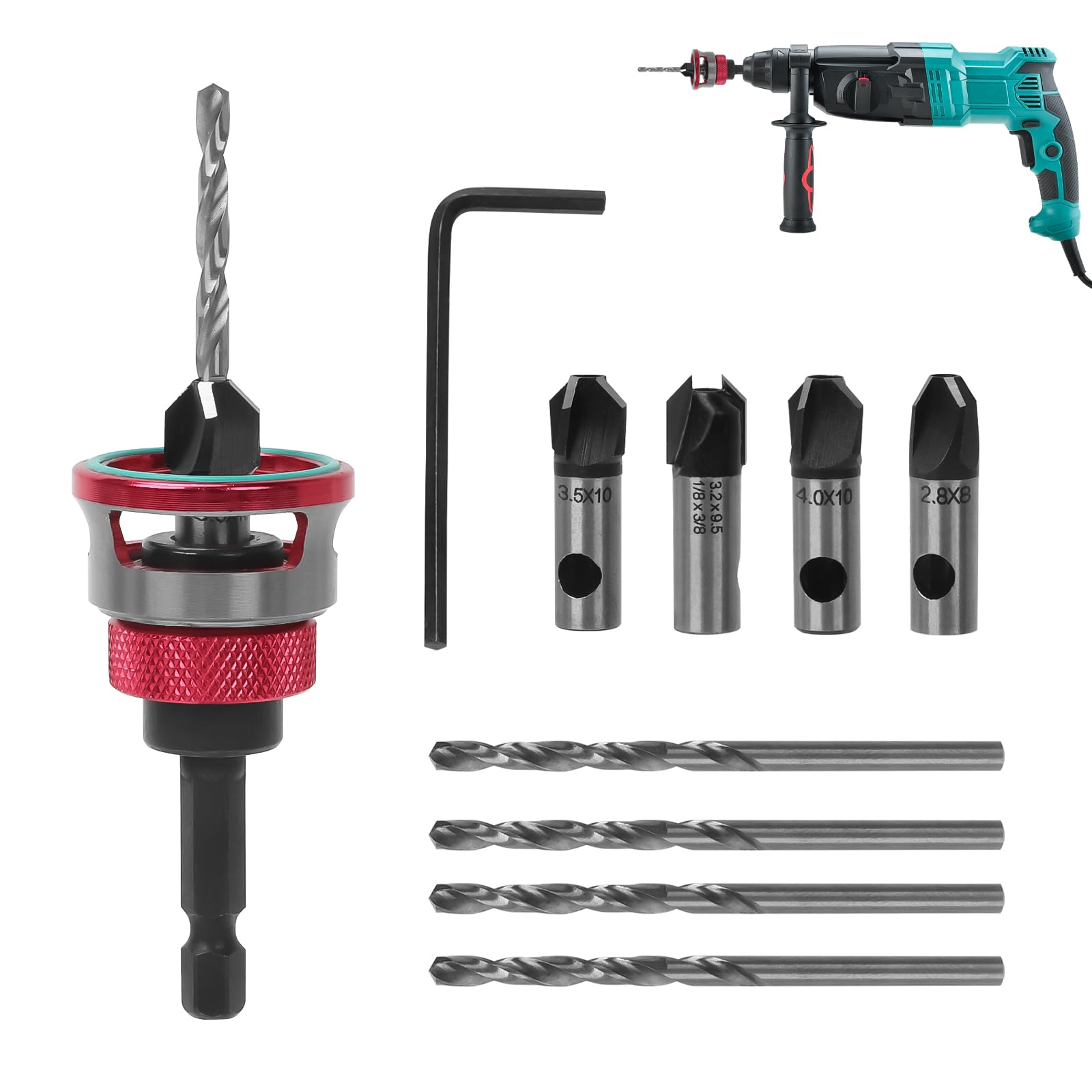 皿取り錐ドリル ビット 4本入り 埋木錐 下穴・皿取錐 レンチ付き 六角軸 高速度鋼製 木工用ドリルビット 穴あけトリマー 面取りカッター バリ取り セット 竹/木/硬質ゴムなどの穴開け Countersink Drill Bit Set (レッド)
