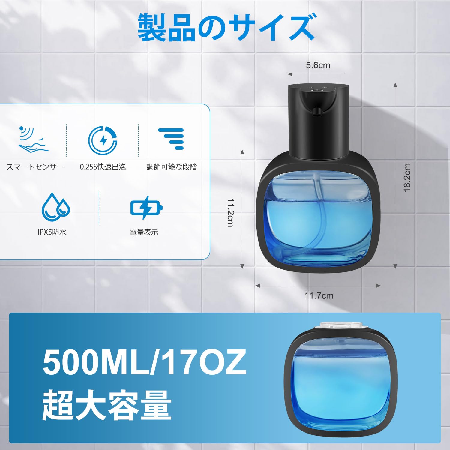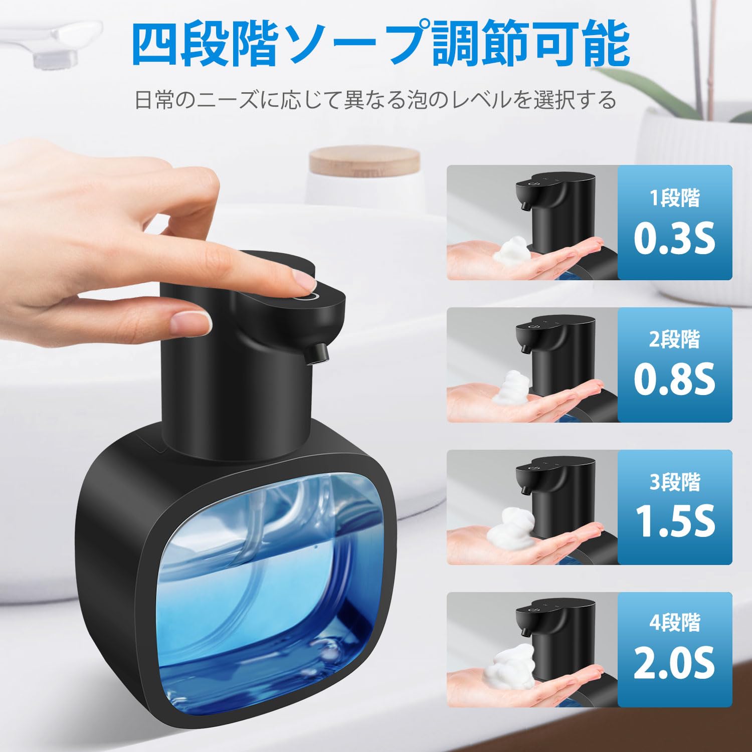 Gotofine ソープディスペンサー 泡 自動 ハンドソープディスペンサー 充電式 吐出量4段階調 420ml 非接触式 壁掛け 高感度センサー オートディスペンサー 食器洗剤 ディスペンサー キッチン 洗面所などに適用 透明ボトル 日本語説明書付き (泡タイプ, ブラック·500ml)