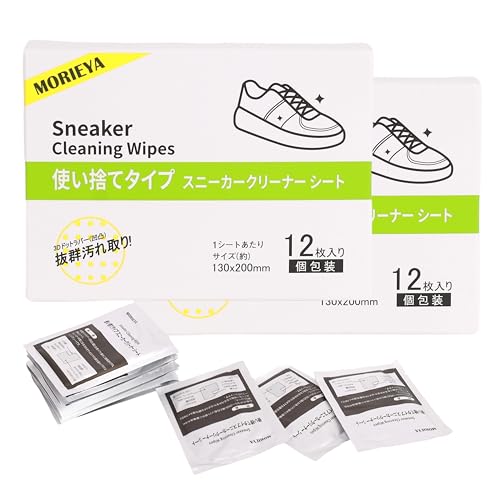 [MORIEYA] スニーカークリーナーシート 3Dドトラバ-(凹凸) で の汚れ落とし 携帯用 使い捨て 洗剤不要 微香タイプ 肌に優しい 白いドットラバーとソフト面の二面構造 12 枚入り 個包装