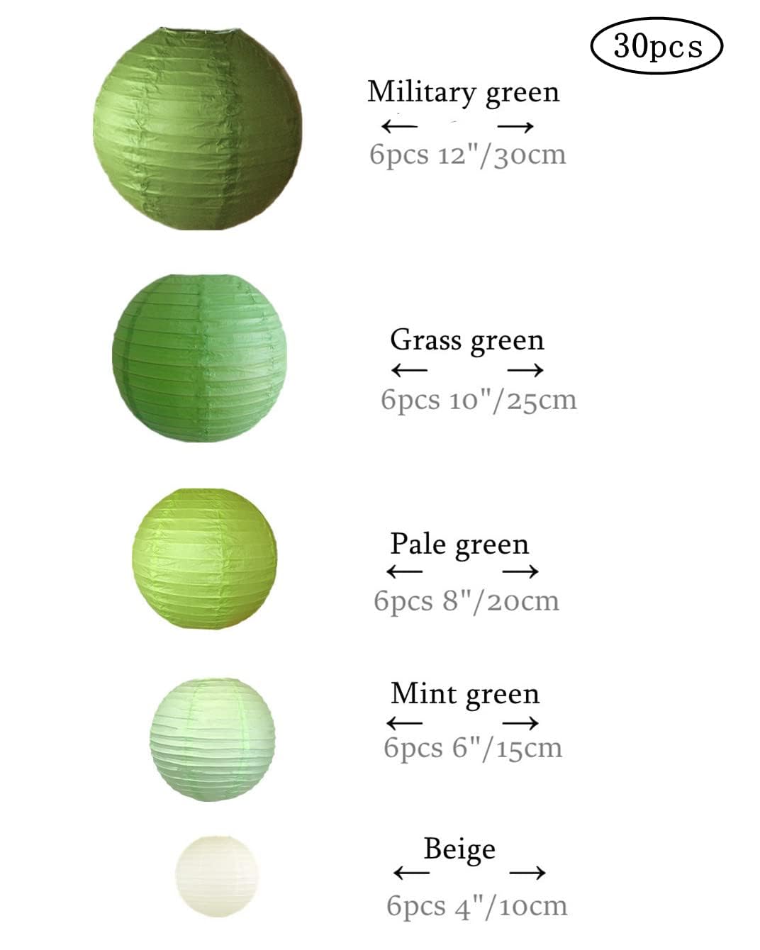 30個セットの紙提灯セット:10cm、15cm、20cm、25cm、30cm。5種直径各6個。