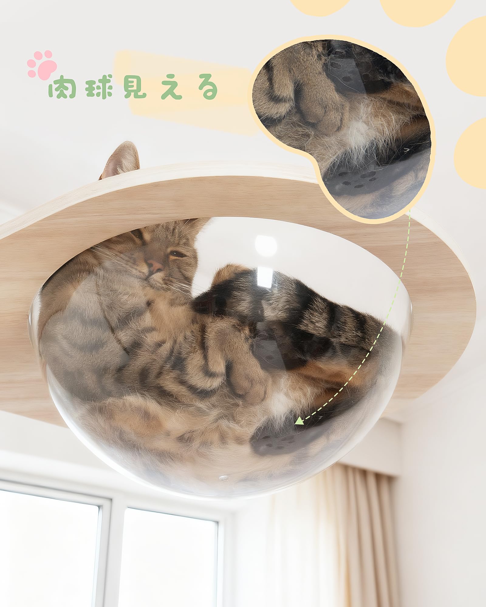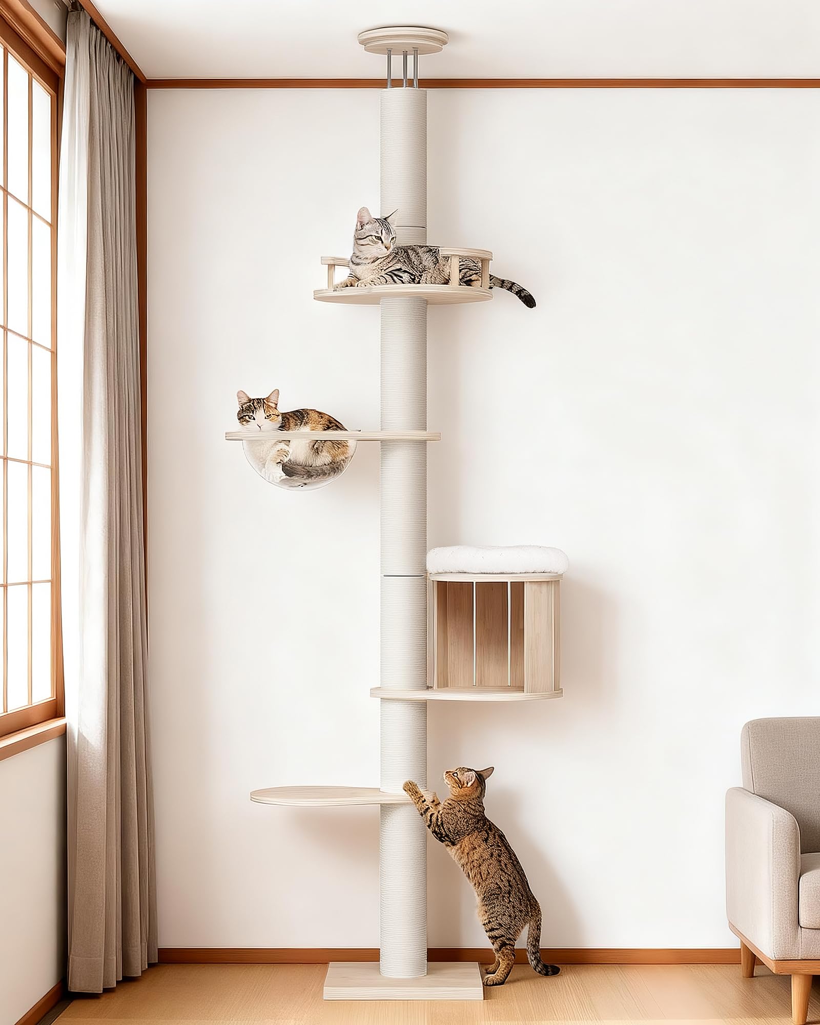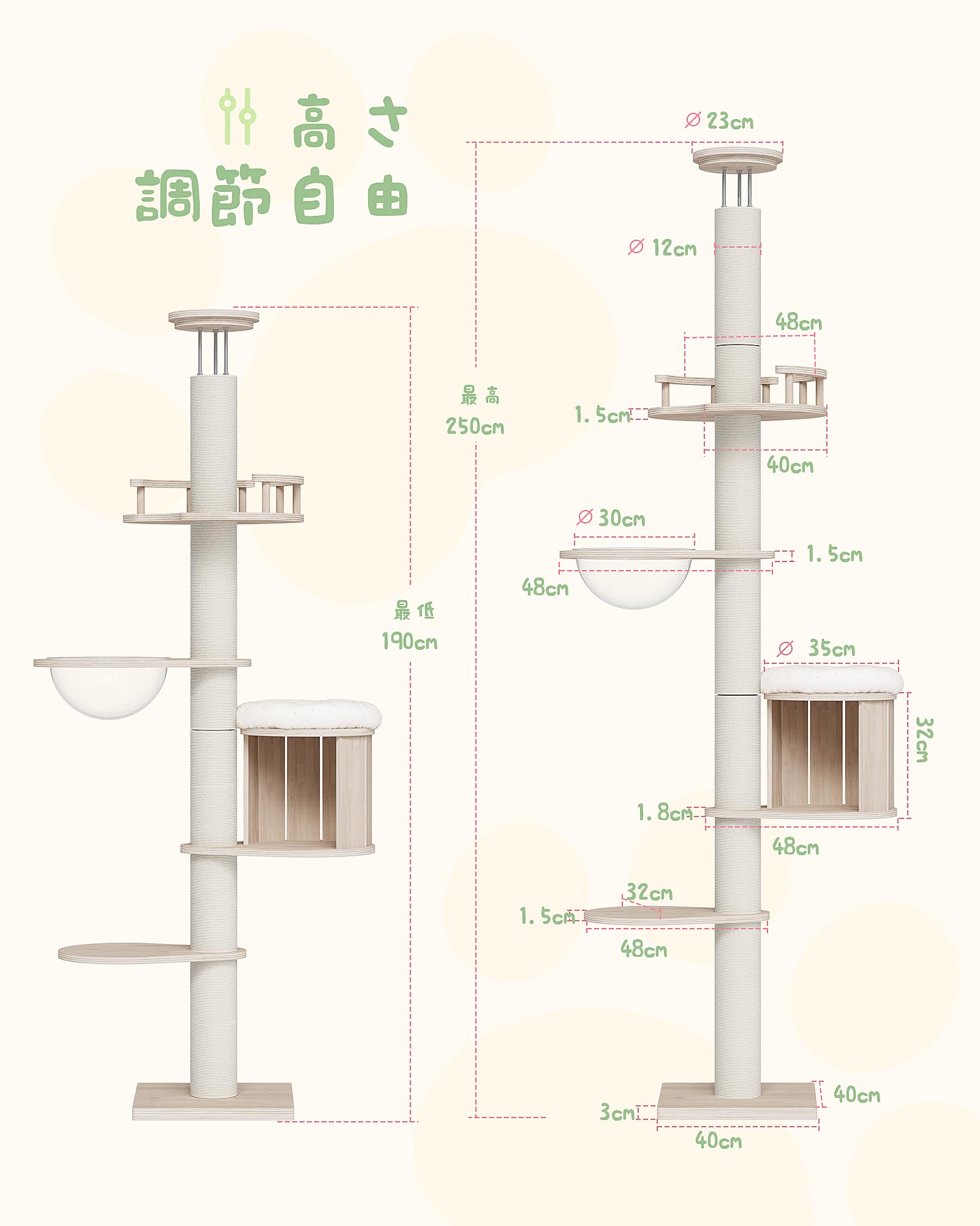 OROPY キャットタワー 突っ張り 木製 スリム 宇宙船ハンモック付き 多頭飼い 猫タワー 省スペース 運動不足解消 隠れ家 爪とぎポスト 全綿縄巻き キャットツリー 193-250cm調整