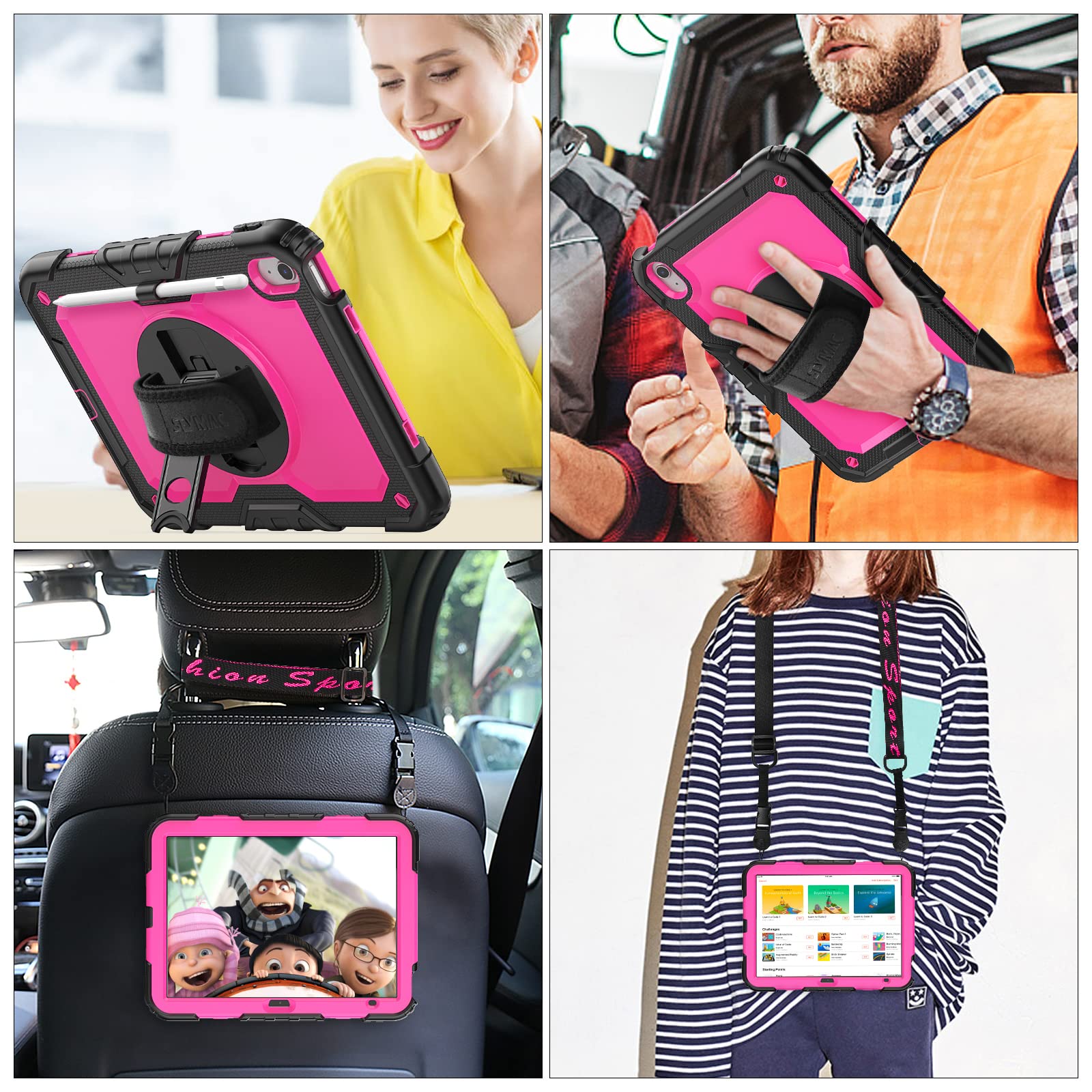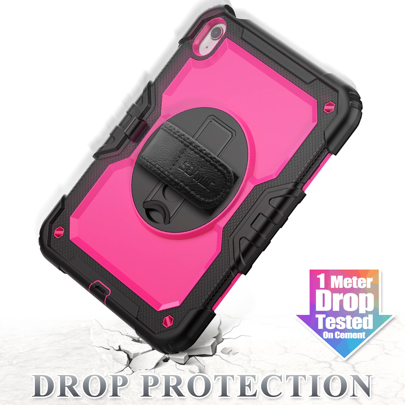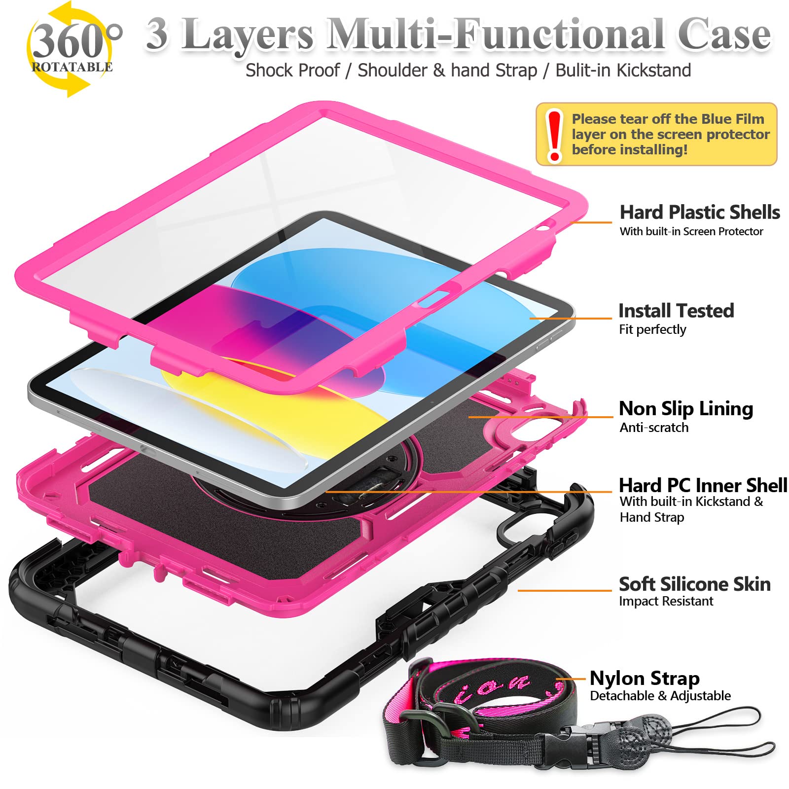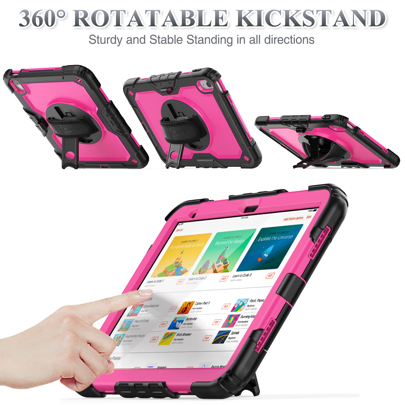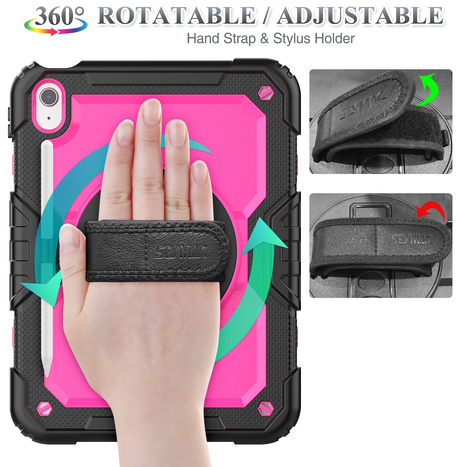 SEYMAC stock iPad(A16) 第11世代/第10世代専用ケース 耐衝撃 ペンホルダー フィルム付き前面カバー 横置き縦置きスタンド 360度回転ハンドストラップ ショルダーストラップ付き(ローズレッド)