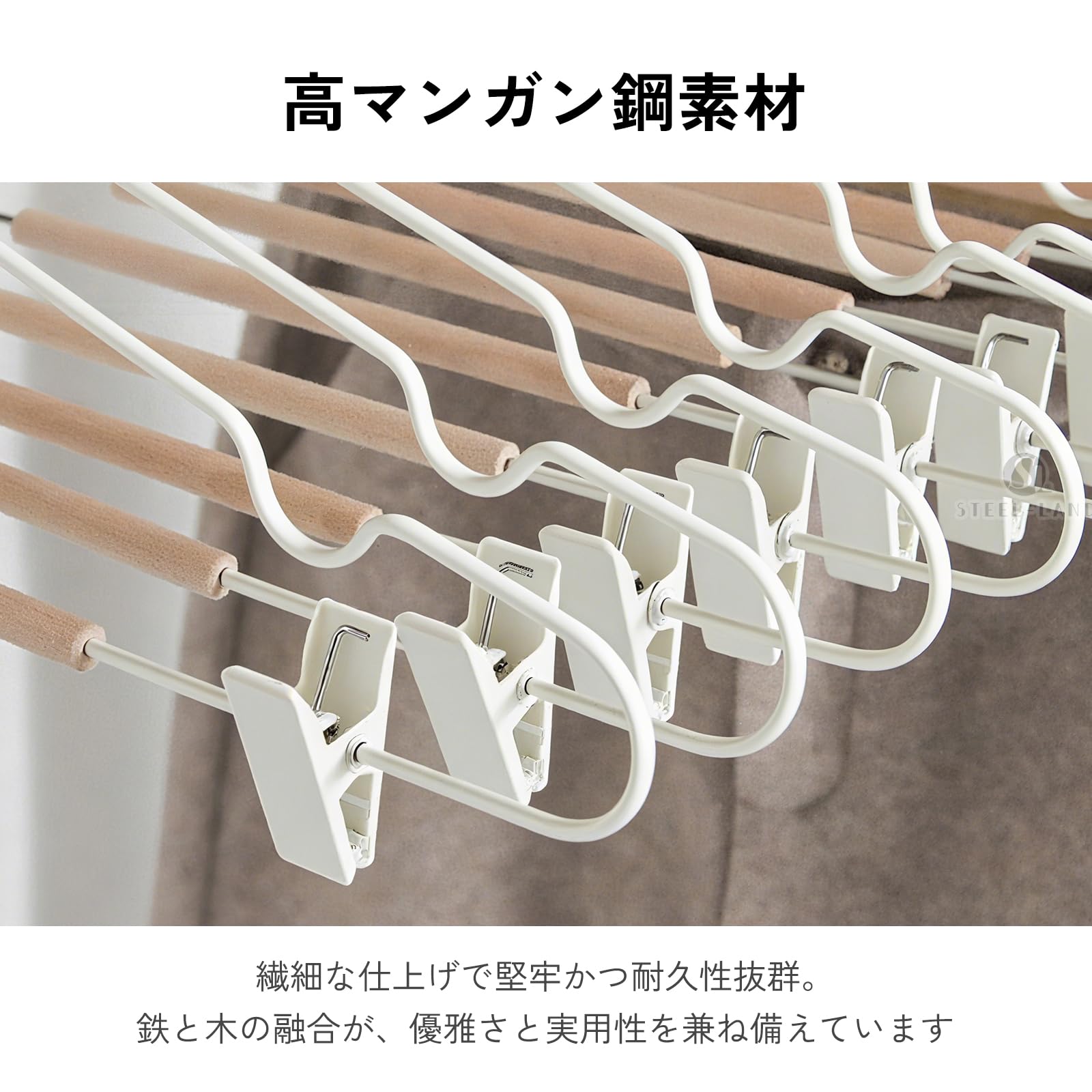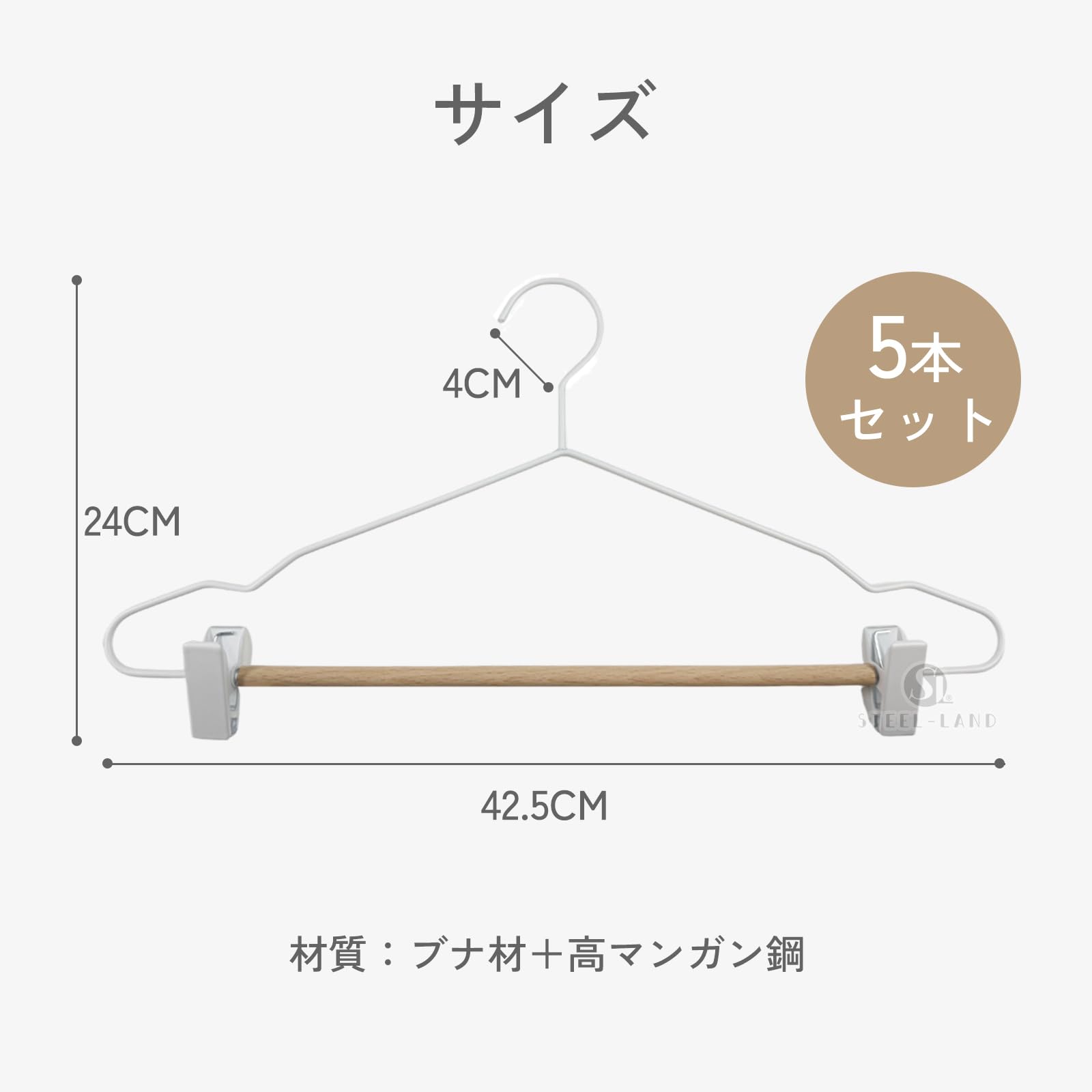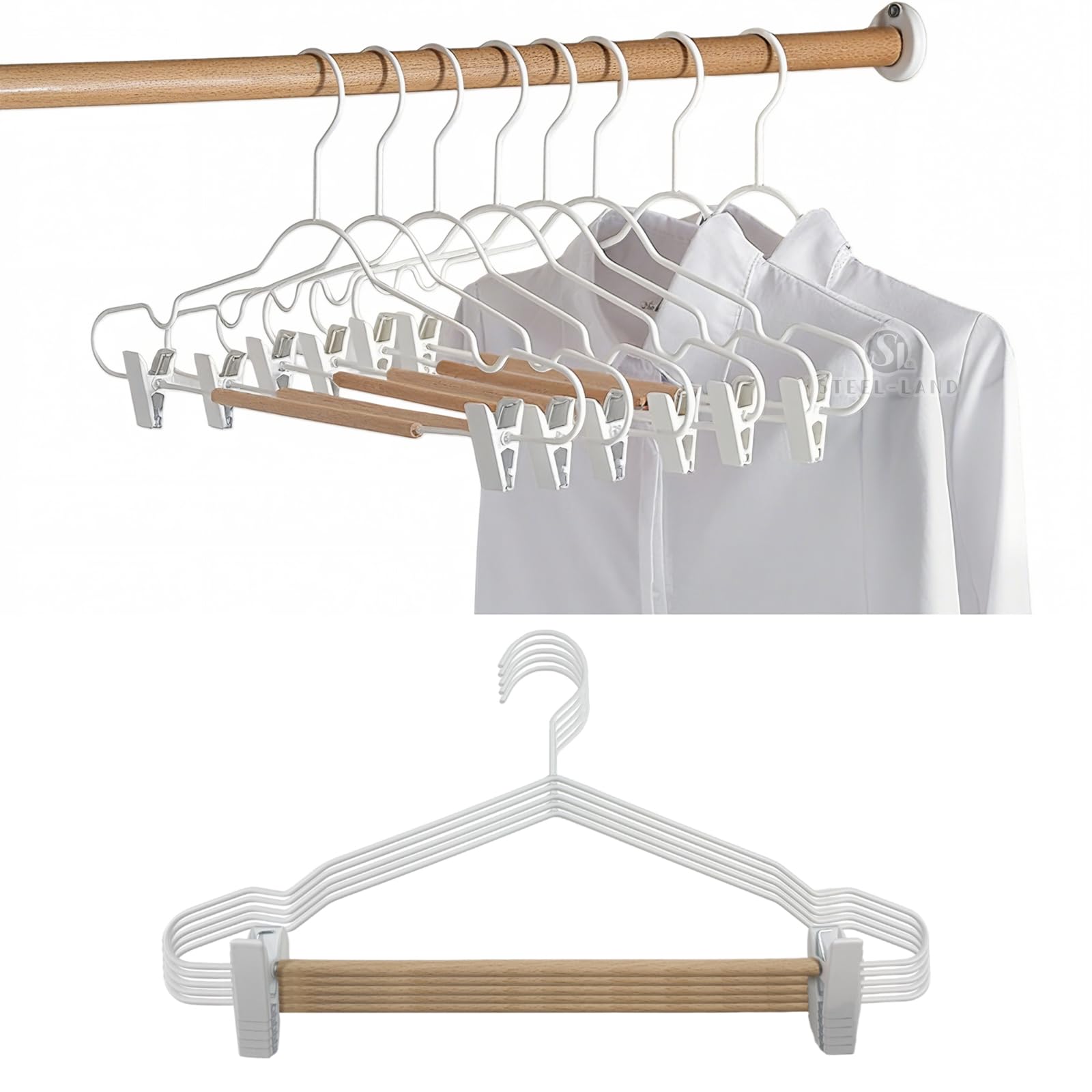 [STEEL-LAND]クリップハンガー 木製バー付き 強力クリップ 防錆 調節可能 5本組 頑丈金属製 乾湿両用 スカート・ズボン兼用 型崩れ防止 北欧風 省スペース 衣類整理 上品 滑り止め [並行輸入品]