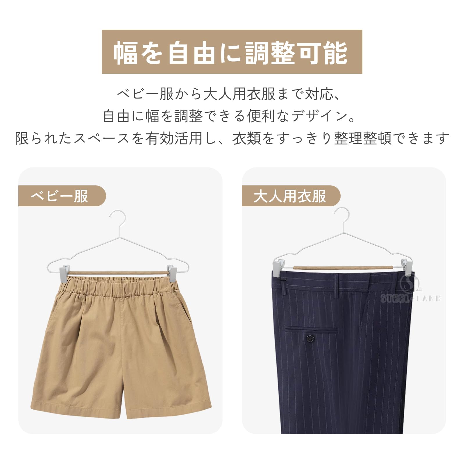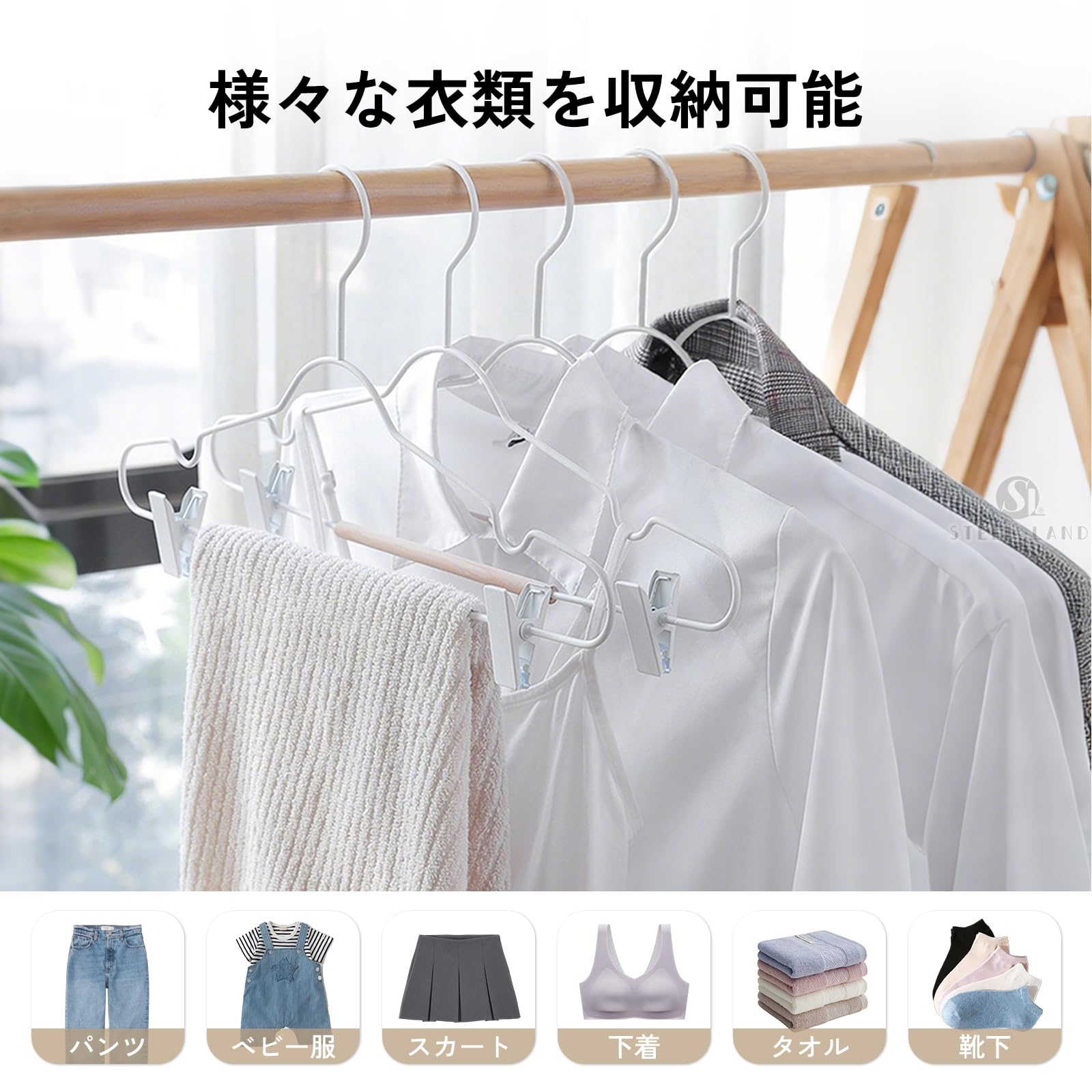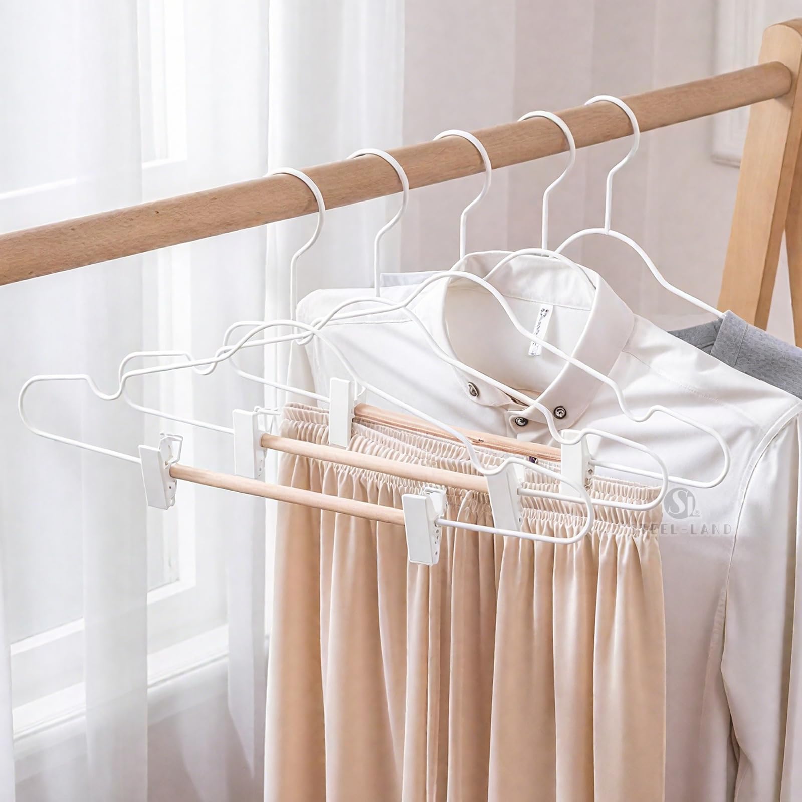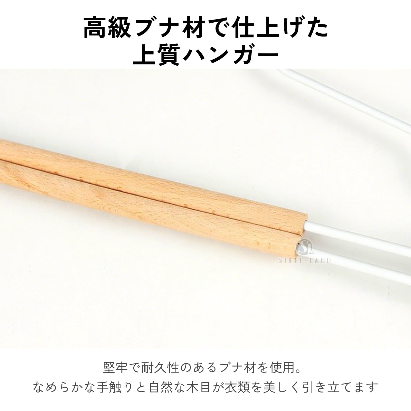 [STEEL-LAND]クリップハンガー 木製バー付き 強力クリップ 防錆 調節可能 5本組 頑丈金属製 乾湿両用 スカート・ズボン兼用 型崩れ防止 北欧風 省スペース 衣類整理 上品 滑り止め [並行輸入品]