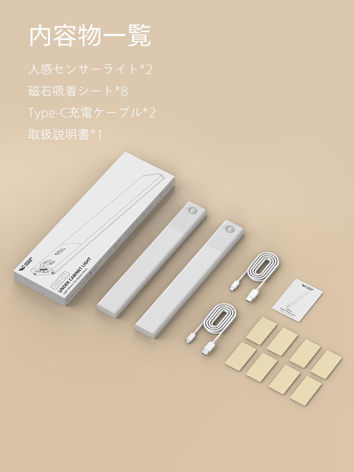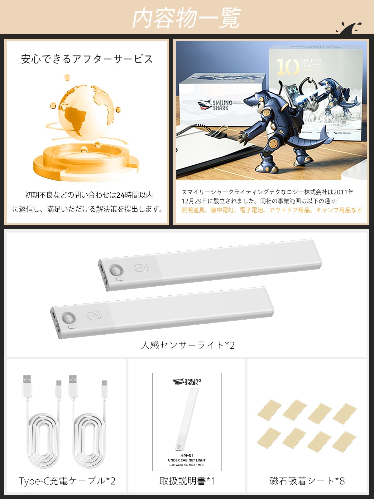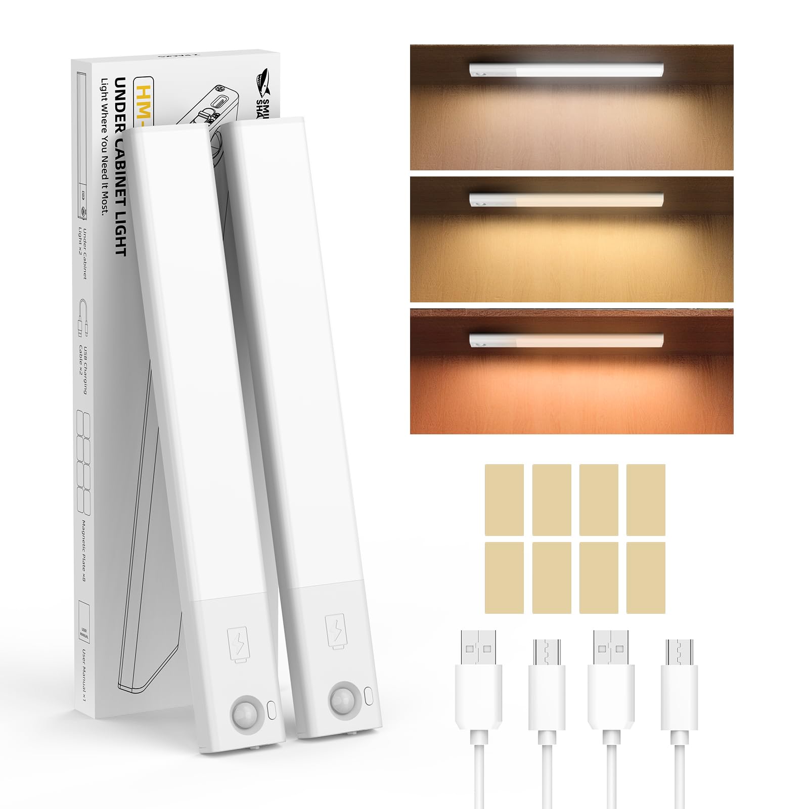 Smiling Shark 人感センサーライト HM01【2025新設計・1-3m高精度感知・無段階調節】高輝度室内照明 バーライト 無段階調節 20CM 暖 ・白・自然光 3~6000K 充電式省電力 自動点灯消灯 1200mAh 8時間連続使用 耐久性 マグネット式 簡単設置 手元灯 足元灯 フットライト 玄関灯 多場面適用 クローゼット/キッチン/廊下/寝室用 日本語取扱説明書 2個入