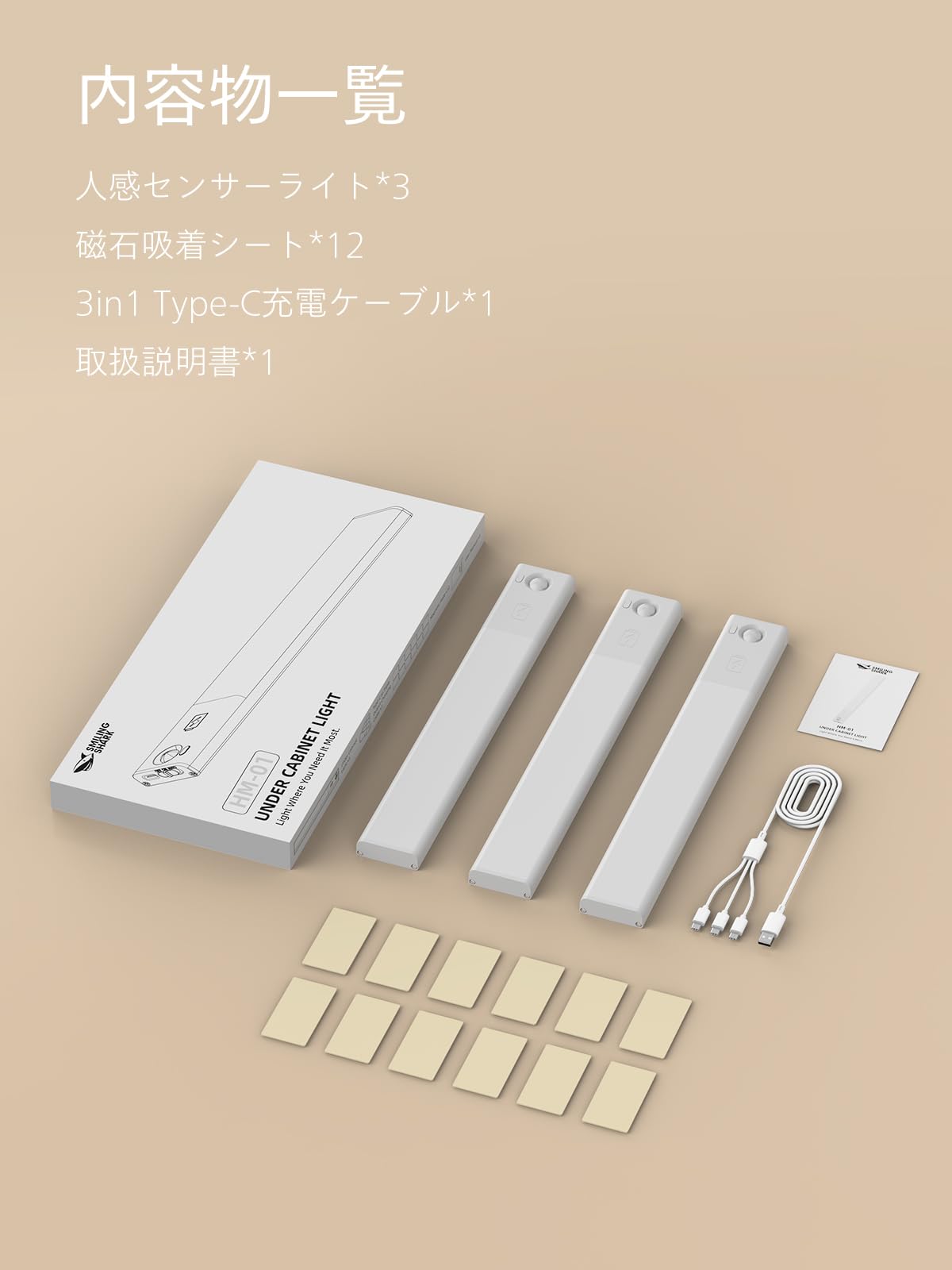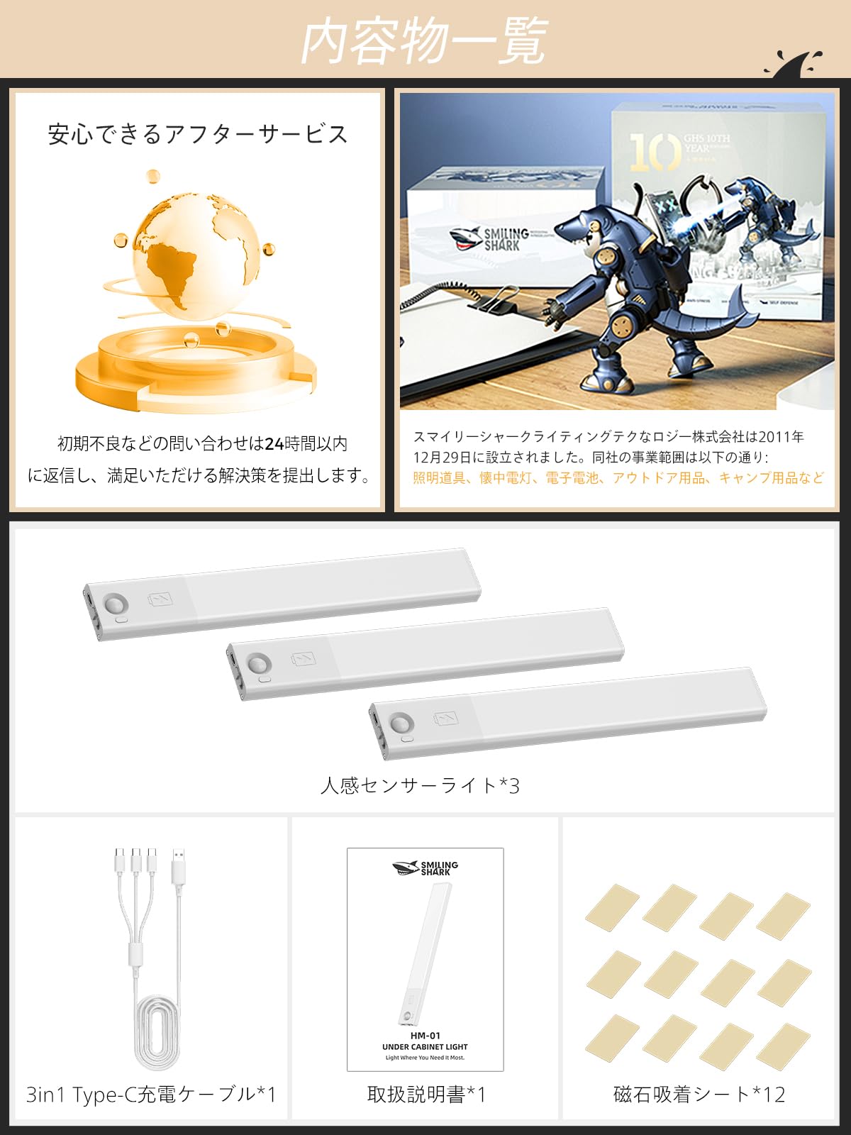 Smiling Shark 人感センサーライト HM01【1-3m高精度感知・多口充電ケーブル付き・無段階調節】高輝度室内照明 キッチンライト 3台同時充電可能 充電式省電力 20CM 暖・白・自然光 3~6000K 自動点灯消灯 1200mAh 8時間連続使用 耐久性 マグネット式 簡単設置 手元灯 足元灯 バーライト 多場面適用 クローゼット/廊下/寝室用 日本語取扱説明書 3個入
