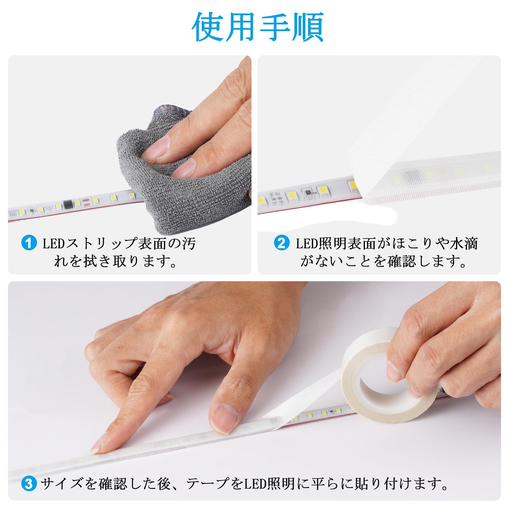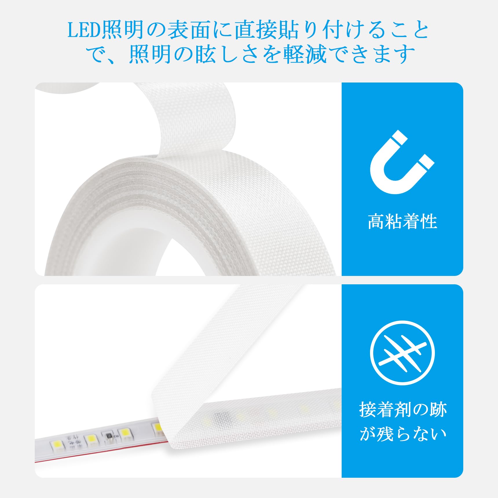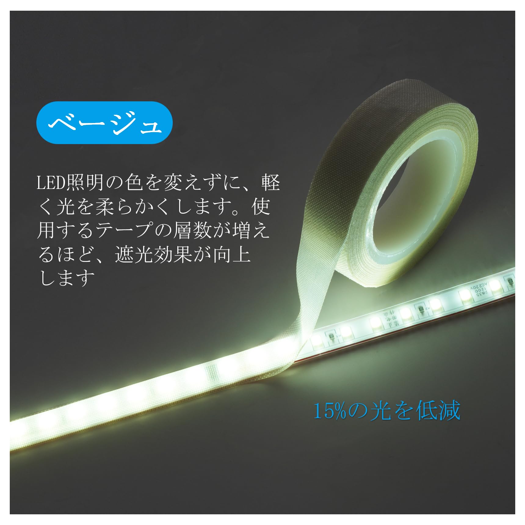 照明のまぶしさや眩しさが気になる方におすすめの遮光耐高温テープです。LED照明の光を柔らかく拡散させることで、目の疲れを軽減し、和室やリビング、書房など、あらゆる空間で快適な光環境を実現します。茶色調光テープは白色のLED照明に貼り付けると光が黄色になり、電球色のようになります。ベージュテープはLED照明の色を変えません。ただ、色を柔らかくするだけです。化粧鏡・クローゼット・ショーケースに最適。化粧鏡周りのLED照明を柔らかく拡散(過曝光防止)クロゼット内蔵LEDのまぶしさ軽減(減光テープで白色家具との調和)ショーケースの反射防止(展示物の自然な見え方を実現)