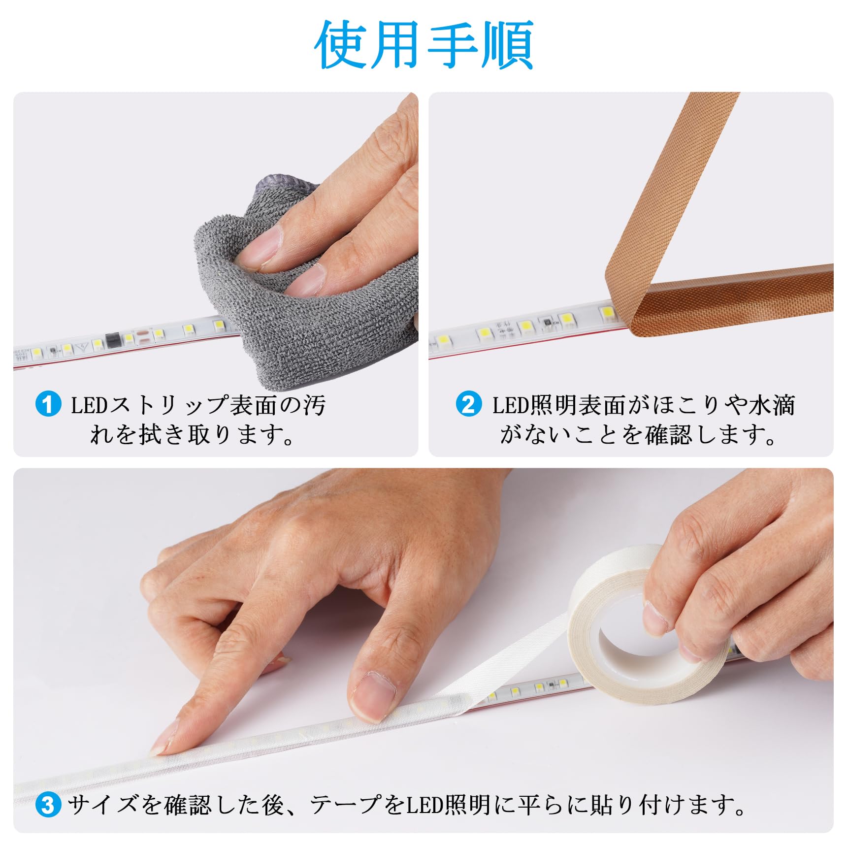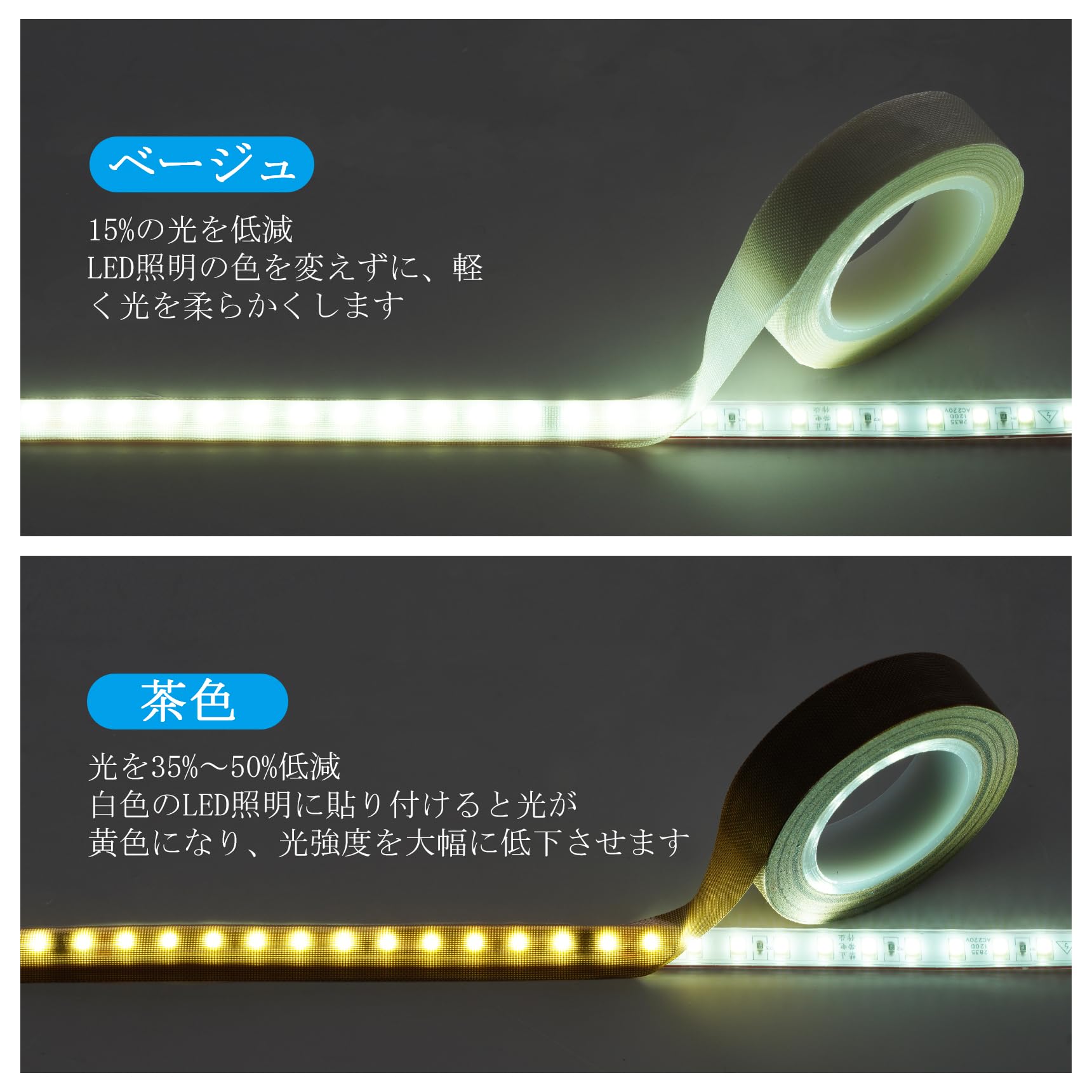 照明のまぶしさや眩しさが気になる方におすすめの遮光耐高温テープです。LED照明の光を柔らかく拡散させることで、目の疲れを軽減し、和室やリビング、書房など、あらゆる空間で快適な光環境を実現します。茶色調光テープは白色のLED照明に貼り付けると光が黄色になり、電球色のようになります。ベージュテープはLED照明の色を変えません。ただ、色を柔らかくするだけです。化粧鏡・クローゼット・ショーケースに最適。化粧鏡周りのLED照明を柔らかく拡散(過曝光防止)クロゼット内蔵LEDのまぶしさ軽減(減光テープで白色家具との調和)ショーケースの反射防止(展示物の自然な見え方を実現)