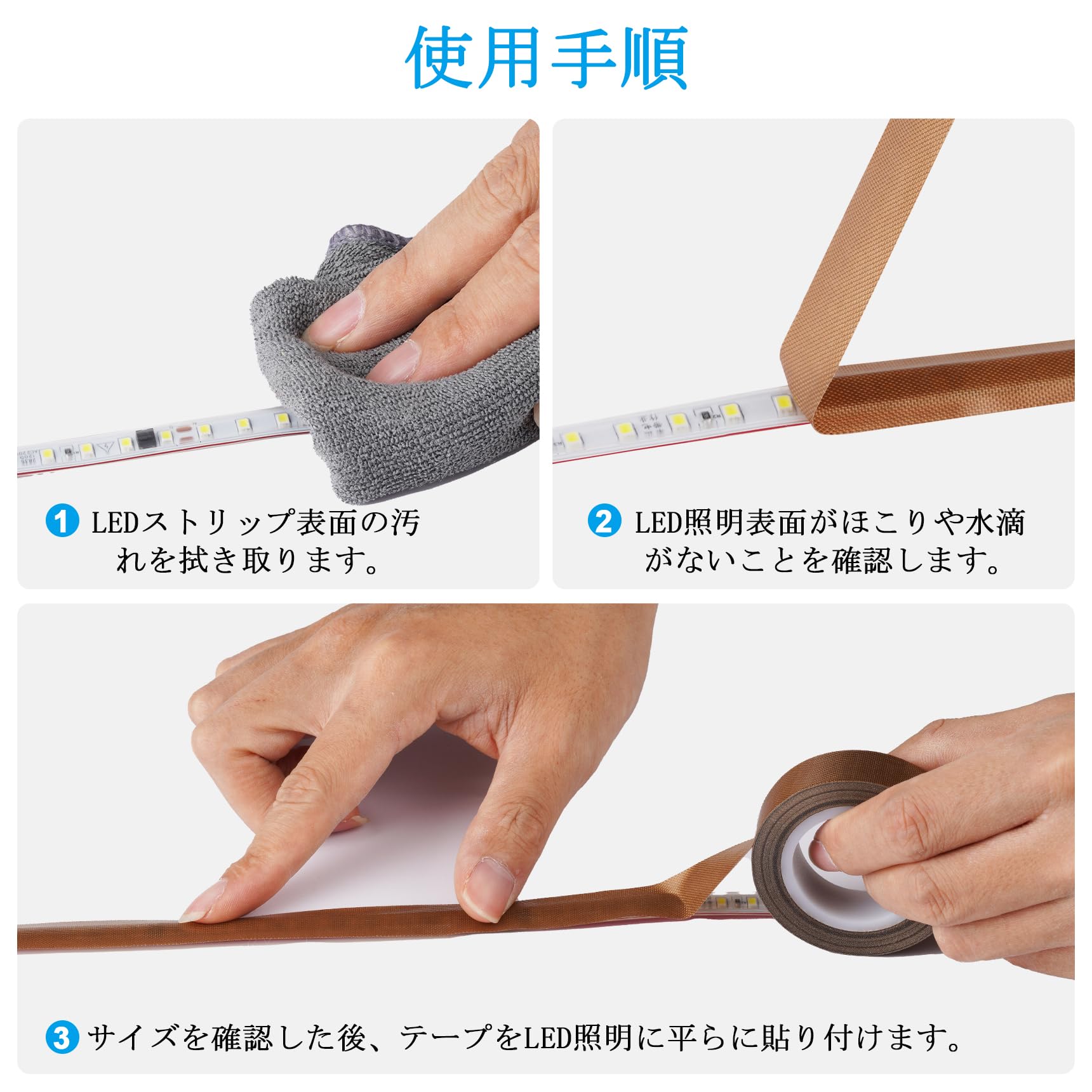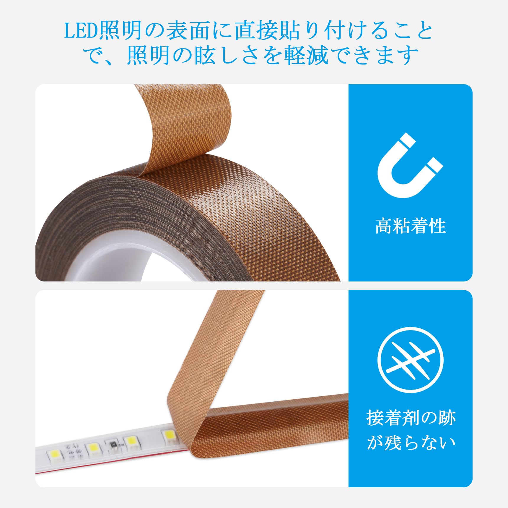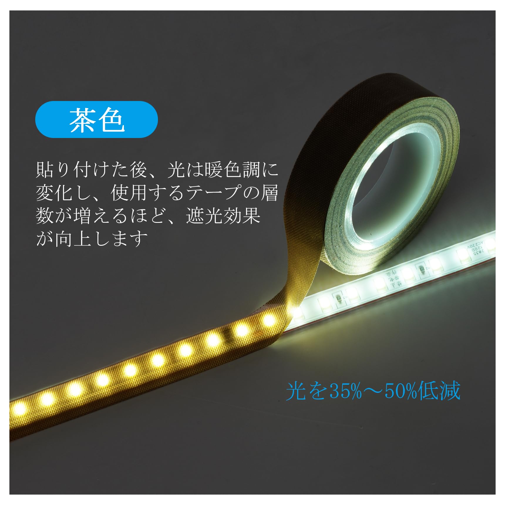 照明のまぶしさや眩しさが気になる方におすすめの遮光耐高温テープです。LED照明の光を柔らかく拡散させることで、目の疲れを軽減し、和室やリビング、書房など、あらゆる空間で快適な光環境を実現します。茶色調光テープは白色のLED照明に貼り付けると光が黄色になり、電球色のようになります。ベージュテープはLED照明の色を変えません。ただ、色を柔らかくするだけです。化粧鏡・クローゼット・ショーケースに最適。化粧鏡周りのLED照明を柔らかく拡散(過曝光防止)クロゼット内蔵LEDのまぶしさ軽減(減光テープで白色家具との調和)ショーケースの反射防止(展示物の自然な見え方を実現)