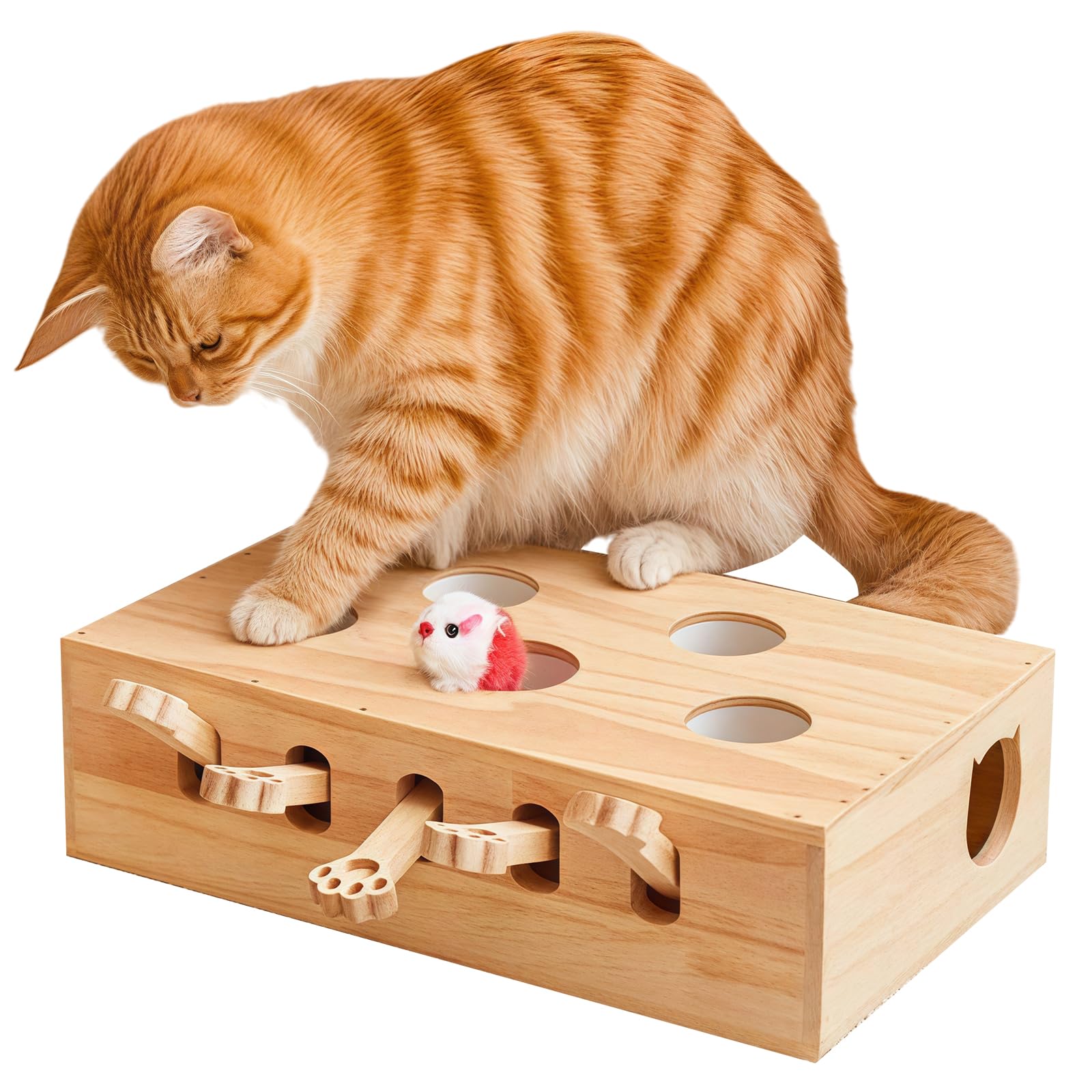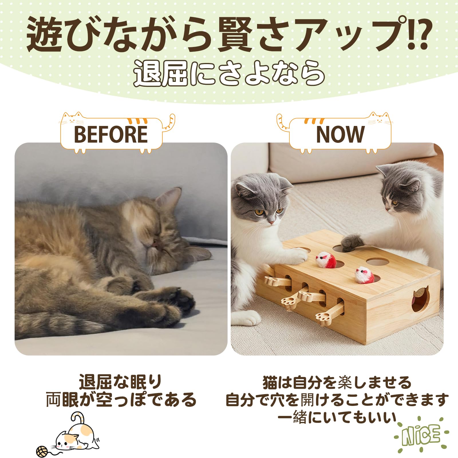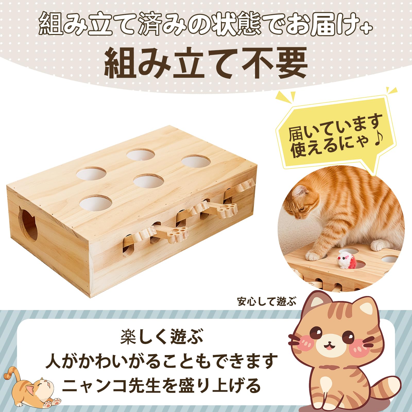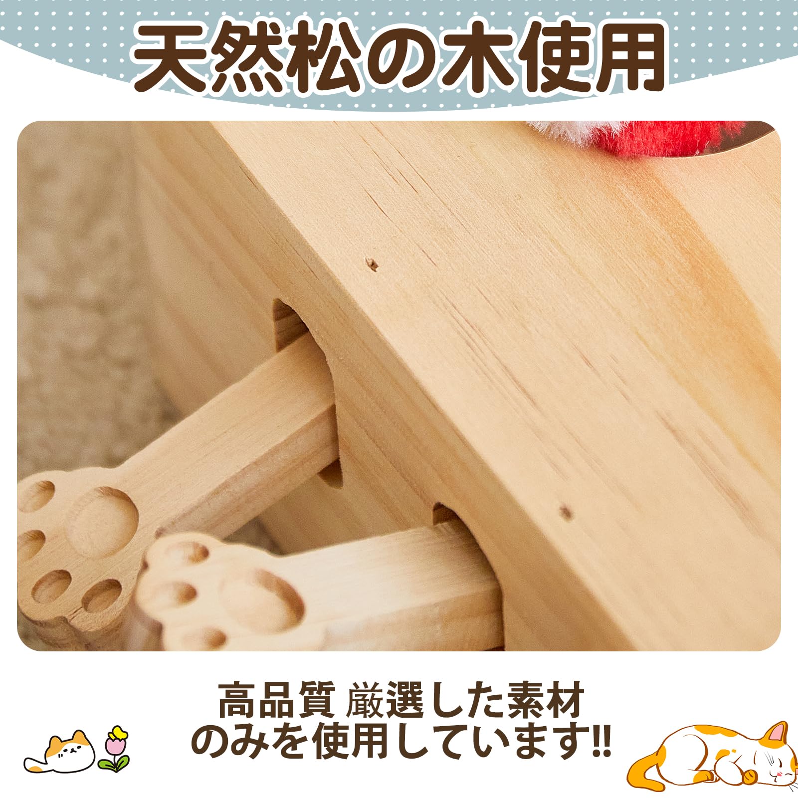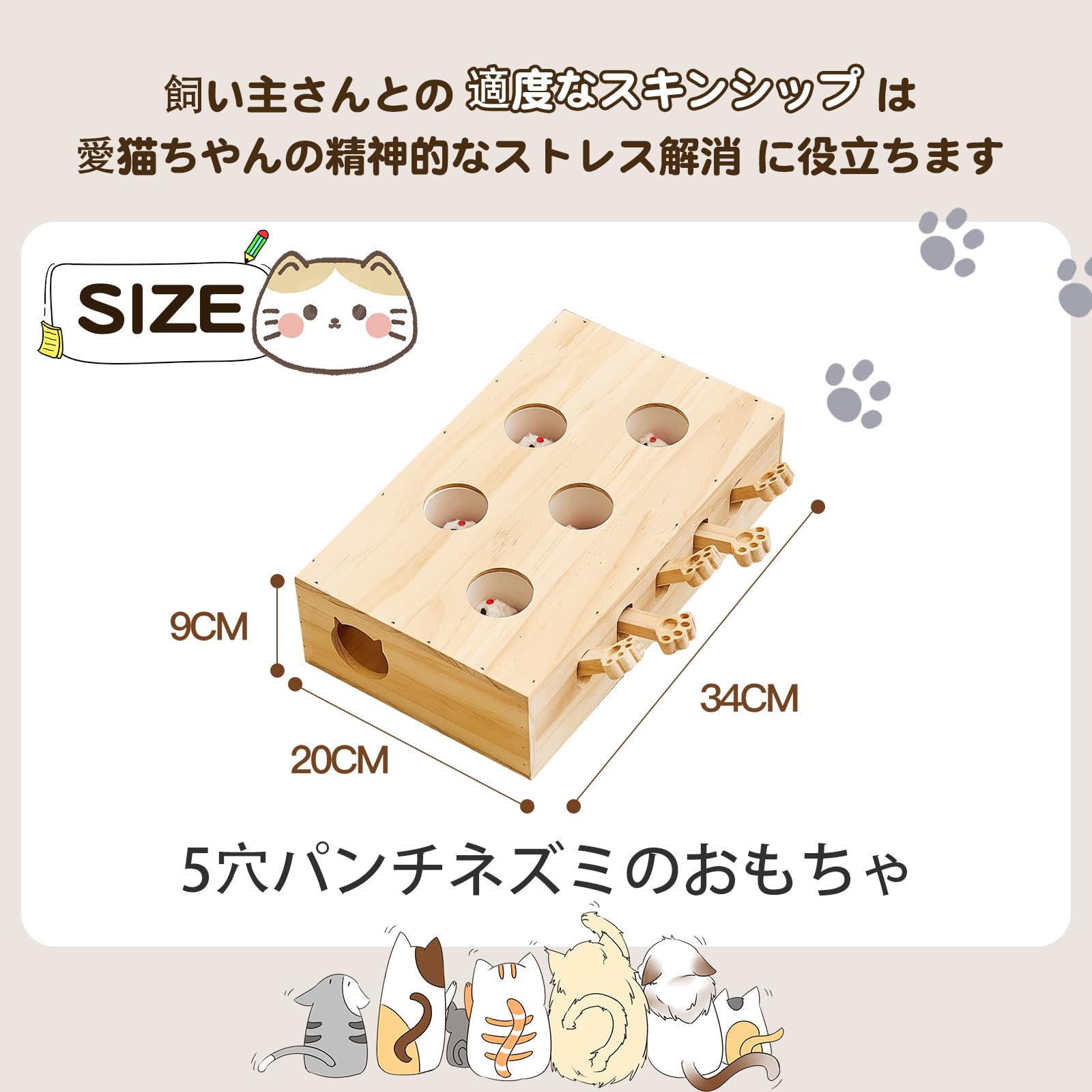 猫ひとり遊びおもちゃ 木製おもちゃ 押すとおやつが出てくる自動猫おもちゃ 丸い穴付き爪跡付き拨片付き ぬいぐるみネズミ付き もぐらたたきゲーム対応 子猫向け高齢猫向け元野良猫チャチャ 知育機能付き猫用おもちゃ