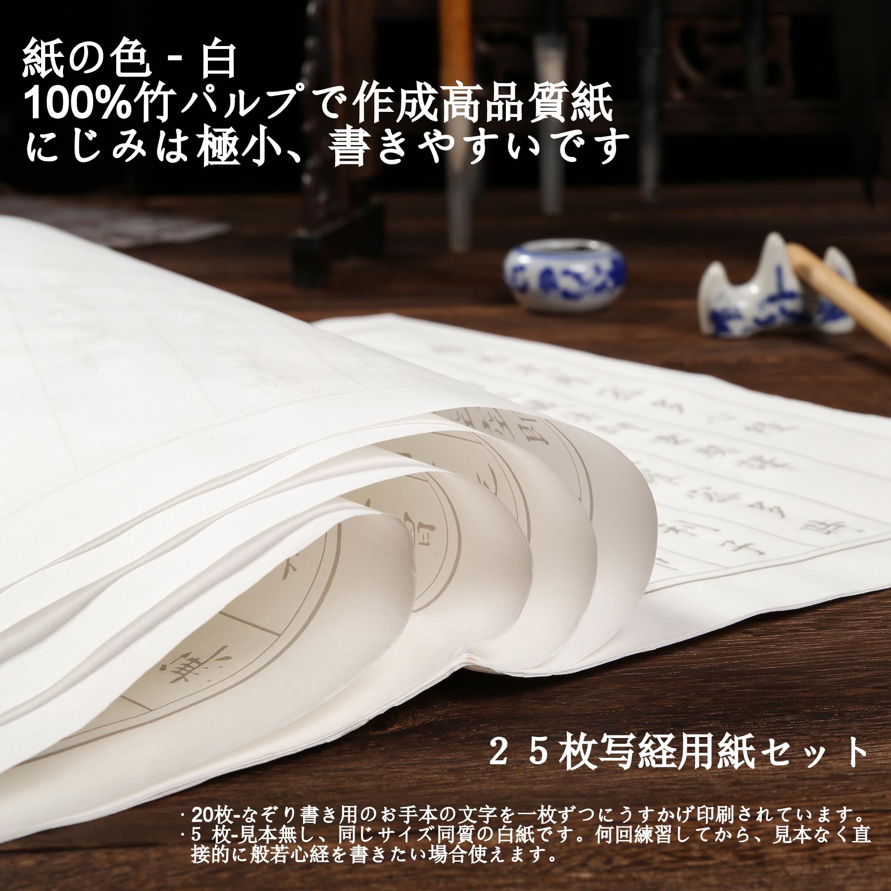 般若心経 写経用紙セット(25枚入り写経紙+筆ペン) なぞり書き 手本付き 大きいサイズ67cm×35cm 行幅ー⒉5cm (練習20枚+白紙写経用紙5枚) 初心者向け 老眼に優しい