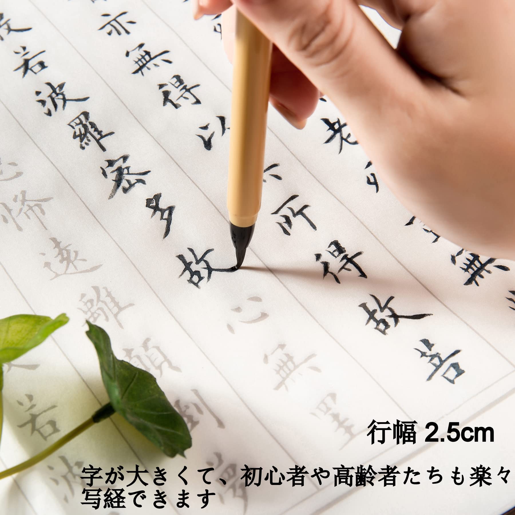 般若心経 写経用紙セット(20枚入り写経紙+筆ペン) なぞり書き 手本付き 大きいサイズ67cm×35cm 行幅ー⒉5cm (練習用)