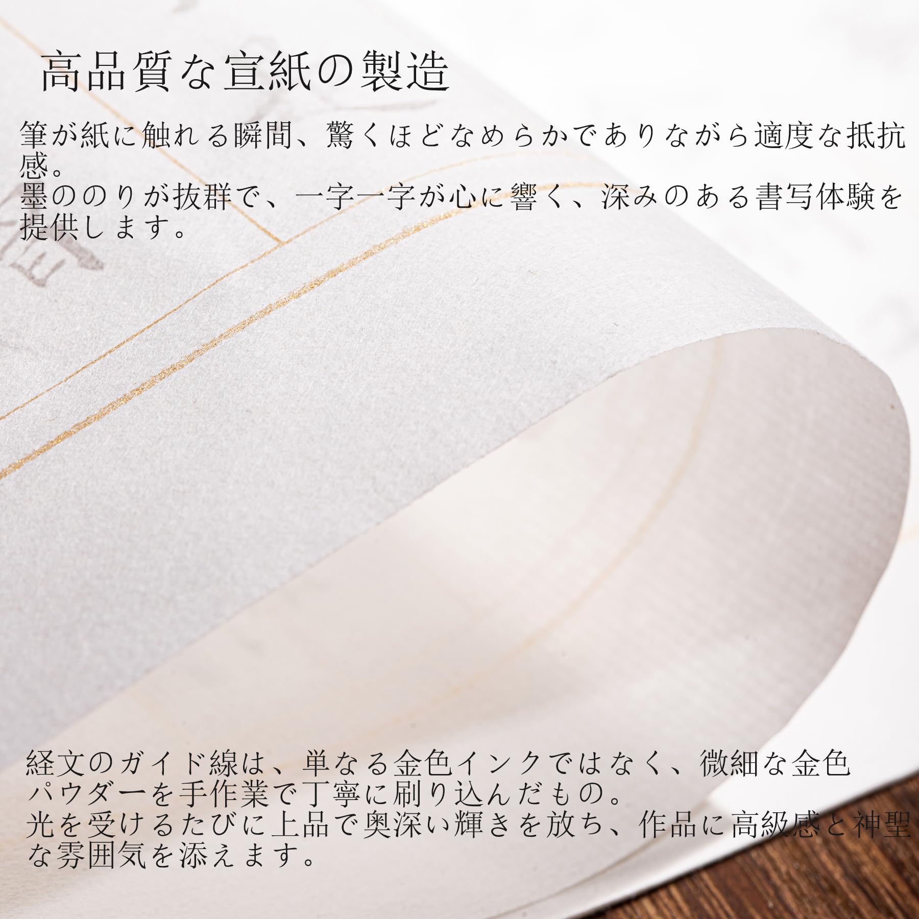 静謐なひとときを、最高の紙とともに。大字楷体 心経写経練習紙。 目が疲れやすい方、お写経を始めてみたい方に最適な、大きな楷書体でデザインされた般若心経の写経用紙です。単なる「大きい文字」ではなく、老眼の方の負担を軽減し、初心者の方でも無理なく、心を込めて一文字一文字に向き合えるよう配慮しました。 高品質宣紙画仙紙、手に取ればすぐにわかる、上質で繊細な手漉きの風合い。滑らかでありながらも、筆に程よい「馴染み」と「抵抗感」を与え、墨が美しく滲みます。書くたびに感じる、自然の素材がもたらす温もりと、筆と紙との対話、深く豊かな書写体験です。 そして、その美しさをさらに引き立てるのが、微細な金粉を手作業で刷り上げた経文のガイドライン。金色のインクで印刷したものとは全く異なります。光の角度で奥行きのある、上品で静かな輝きを放ち、お写経の空間そのものを神聖で荘厃なものに変えます。この金粉のラインは、職人が一点一点、細心の注意を払って刷り上げた芸術品。その精巧さと高級感は、実物を手に取ってこそ実感できるものです。 丹精込めて作られたこの写経紙は、ご自身の修行や心の静寂を得る時間をより一層深いものにするのはもちろん、完成した作品そのものが極上の芸術品となります。そのため、御仏前・御供養・大切な方への贈り物としても大変ご好評をいただいております。贈られた方は、その素材の質感、金粉の輝き、そして何より贈る方の心のこもった想いを感じ取ってくださることでしょう。 「ただ写す」だけでない。自然の素材と匠の技が紡ぐ、至高の写経体験を。 大字楷体:老眼・初心者に最適 檀木宣紙:自然の風合い、最高の筆記感 金粉手刷り金線:上品で神聖な輝き、高級感抜群 職人の技:複雑な工程が生む芸術的な美しさ 贈答品に最適:心を込めた贈り物として喜ばれる