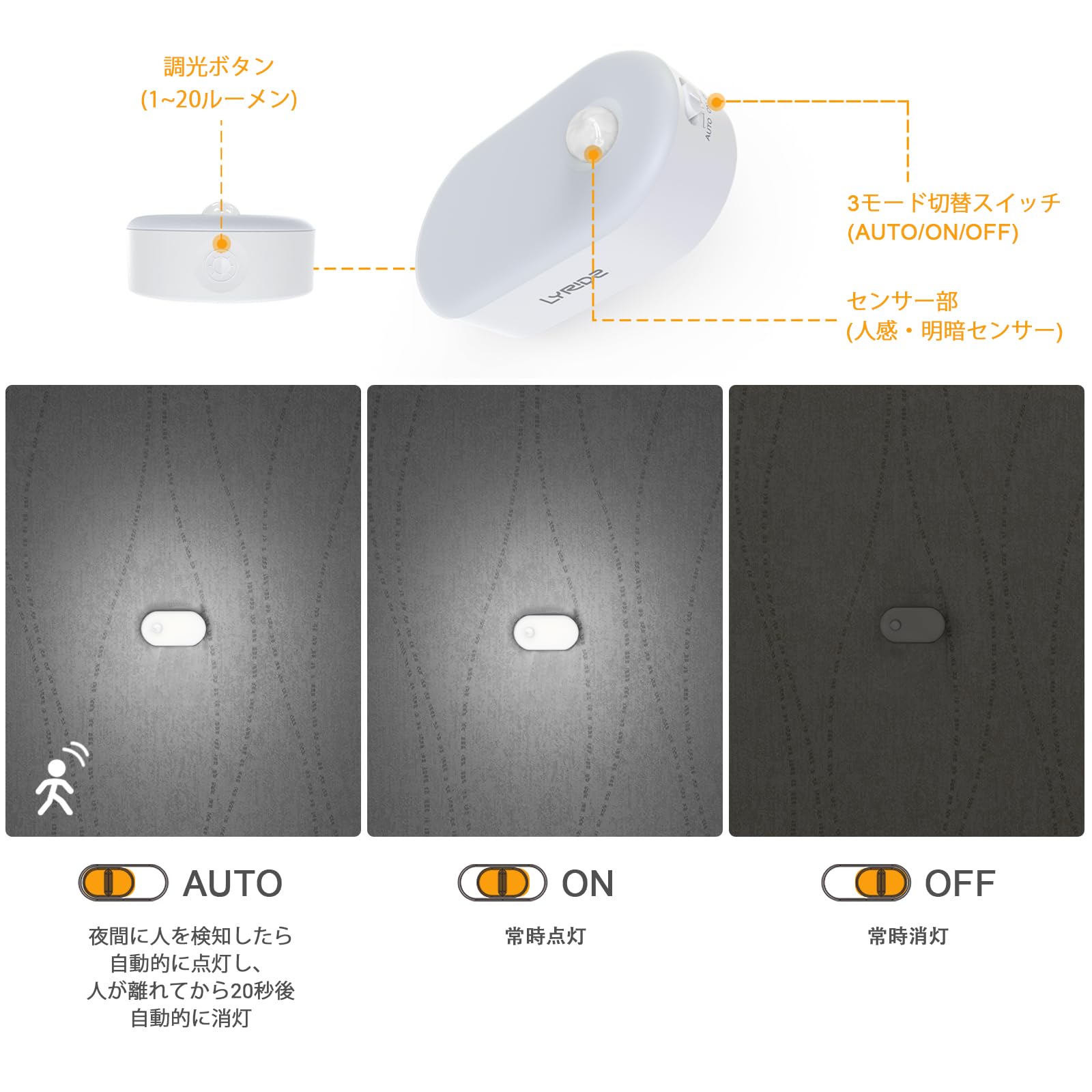 LYRIDZ 人感センサーライト usb充電式 足元灯 足元ライト 人感センサー 常夜灯 無段階明るさ調節 3つモード ナイトライト 昼光色 省エネ 廊下 寝室 玄関 階段 【2個セット·日本語取説】