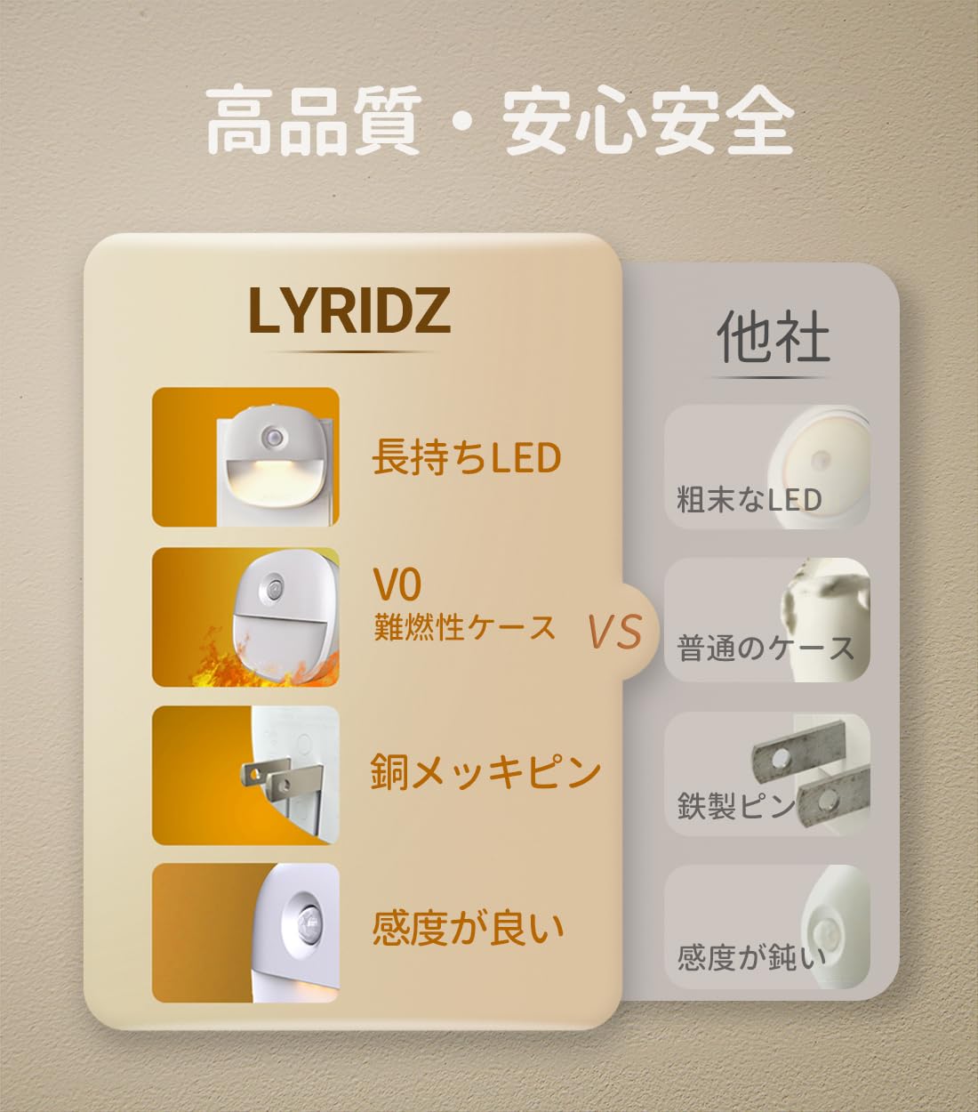 Lyridz センサーライト 室内 コンセント バックライト型 常夜灯 明るさ調節可 足元灯 明暗センサー 夜間常時点灯 省エネ 玄関 廊下 段階 洗面台 琥珀色