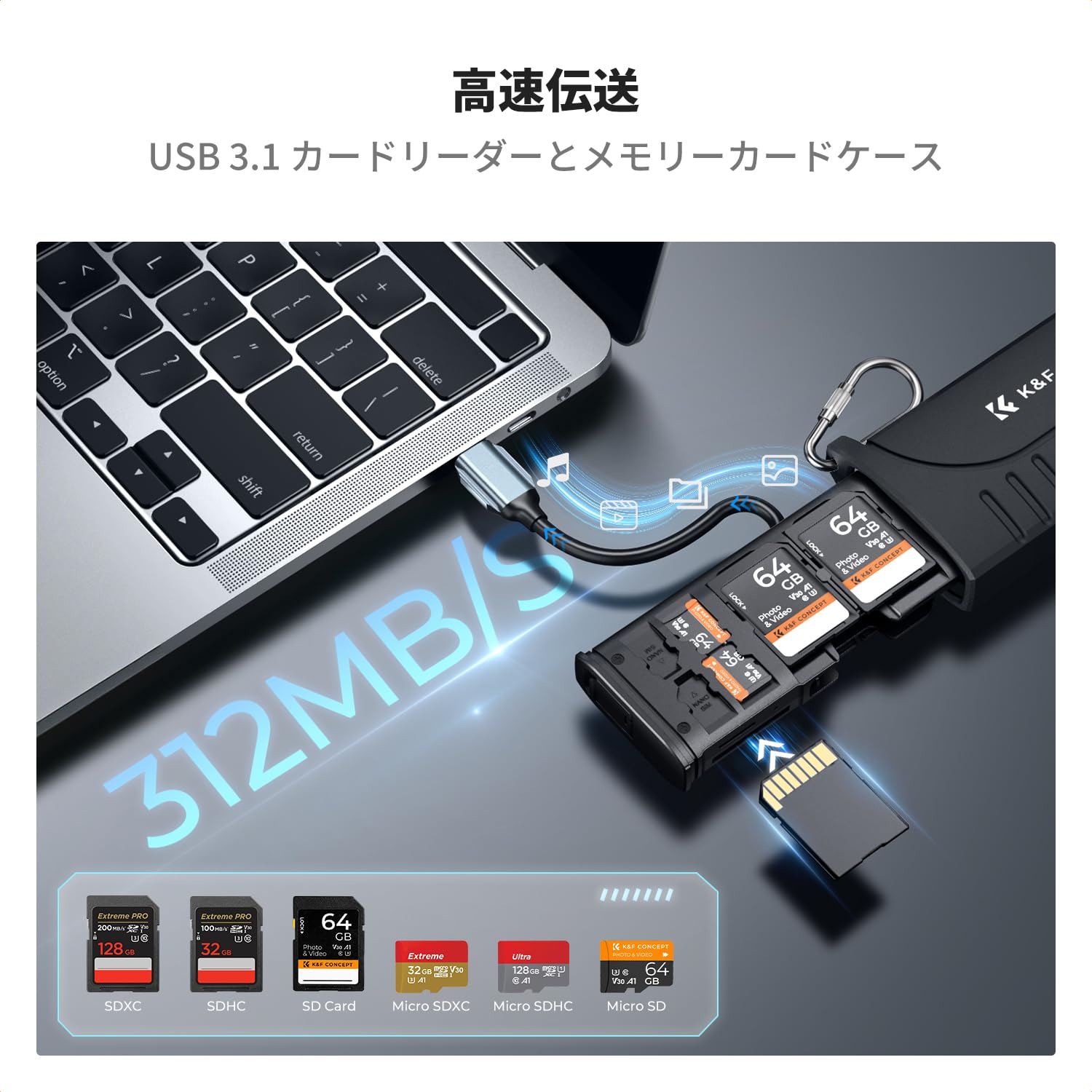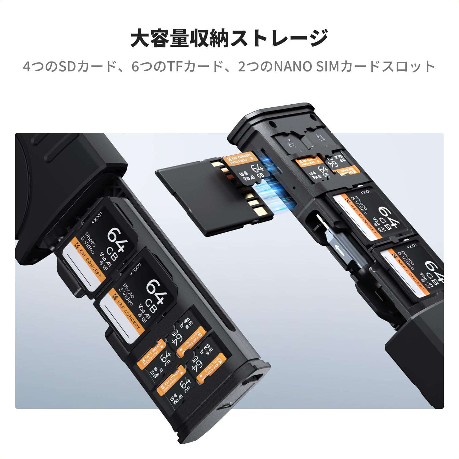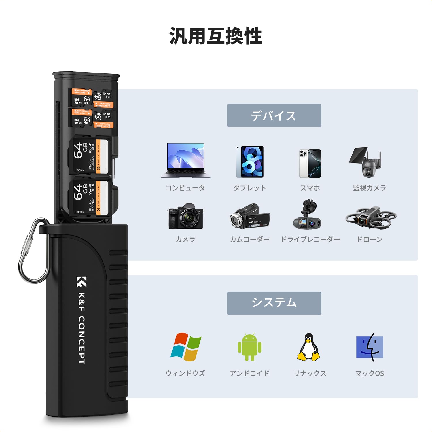 K&F Concept カードリーダーケース【USB3.1 Gen1 高速転送】SD/TFカードリーダー & 収納ケース 12スロット 二合一 一体型設計 IP54防水防塵 耐衝撃 アルミ合金内装 スマート収納 UHS-II対応 USB-C端子 変換アダプター付属