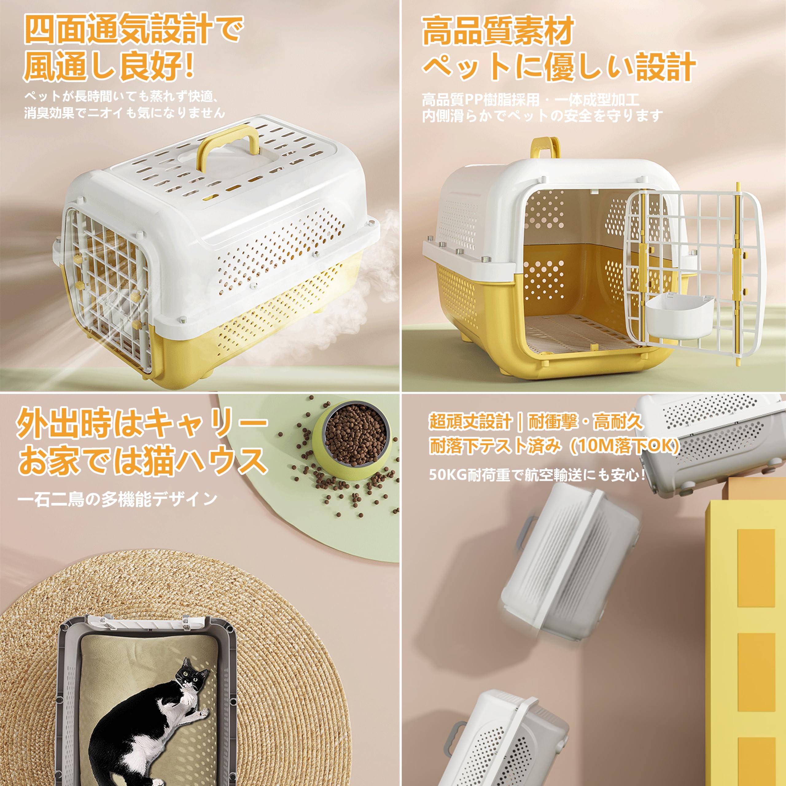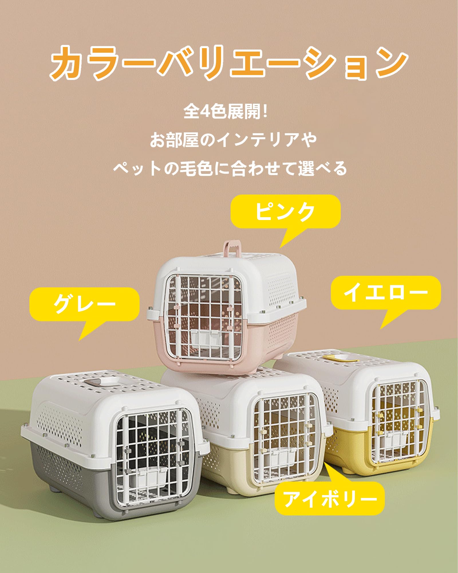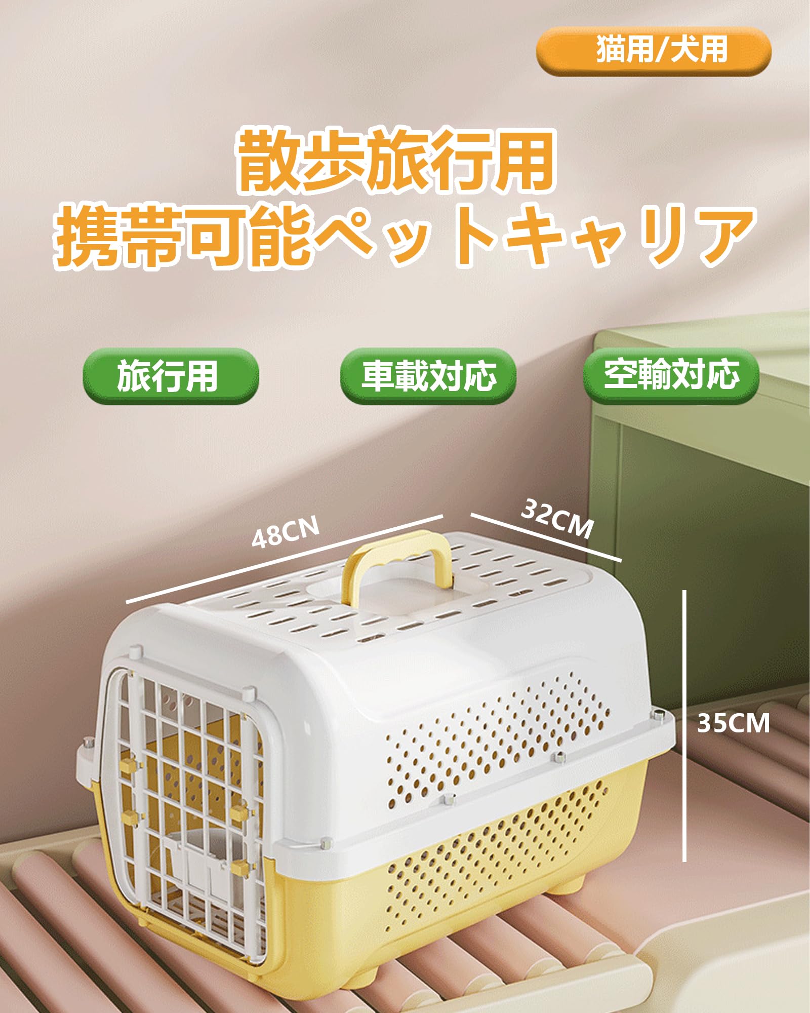 商品の説明快適な移動のための理想的なペットキャリーケースです。軽量なプラスチック製で持ち運びが簡単で、通気性を考慮した多数の通気孔を備えています。航空機での移動にも対応し、小型犬や猫の安全な輸送に最適です。ワンタッチで開閉できる扉は確実なロック機能付きで、ペットの脱走を防止します。上部には持ち運びに便利な取っ手が付いており、病院への通院や旅行、災害時の避難などさまざまな用途に対応します。白とベージュのツートンカラーで洗練された外観も特徴です。車での移動時も安定性が高く、内部は清潔に保ちやすい設計になっています。ペットの快適さと飼い主の使いやすさを両立した実用的なキャリーケースです。普段のお出かけから緊急時まで、大切なペットの移動をサポートする信頼性の高いアイテムです。使用方法無し