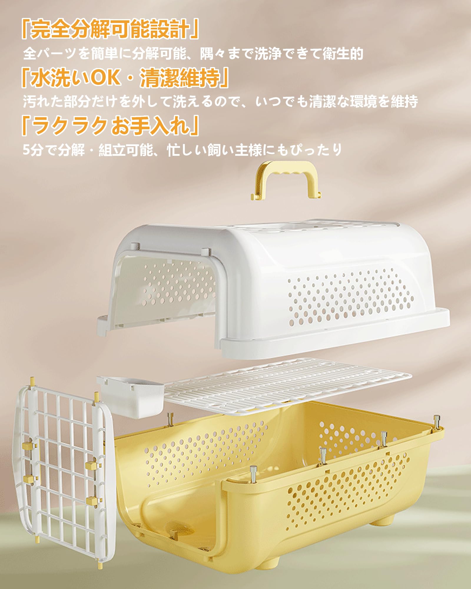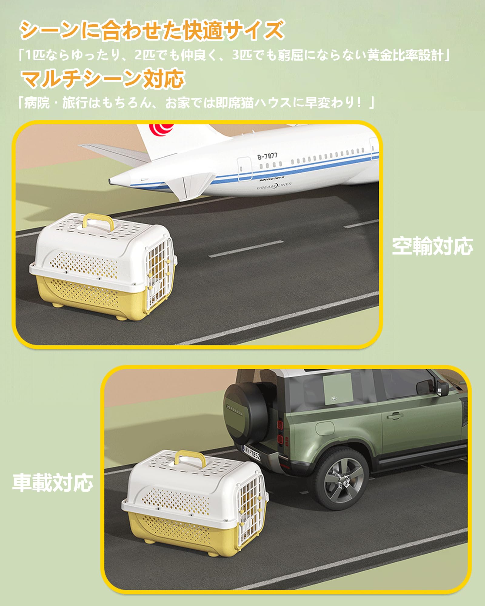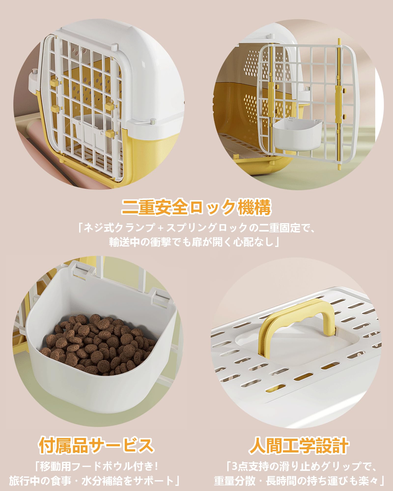 商品の説明快適な移動のための理想的なペットキャリーケースです。軽量なプラスチック製で持ち運びが簡単で、通気性を考慮した多数の通気孔を備えています。航空機での移動にも対応し、小型犬や猫の安全な輸送に最適です。ワンタッチで開閉できる扉は確実なロック機能付きで、ペットの脱走を防止します。上部には持ち運びに便利な取っ手が付いており、病院への通院や旅行、災害時の避難などさまざまな用途に対応します。白とベージュのツートンカラーで洗練された外観も特徴です。車での移動時も安定性が高く、内部は清潔に保ちやすい設計になっています。ペットの快適さと飼い主の使いやすさを両立した実用的なキャリーケースです。普段のお出かけから緊急時まで、大切なペットの移動をサポートする信頼性の高いアイテムです。使用方法無し