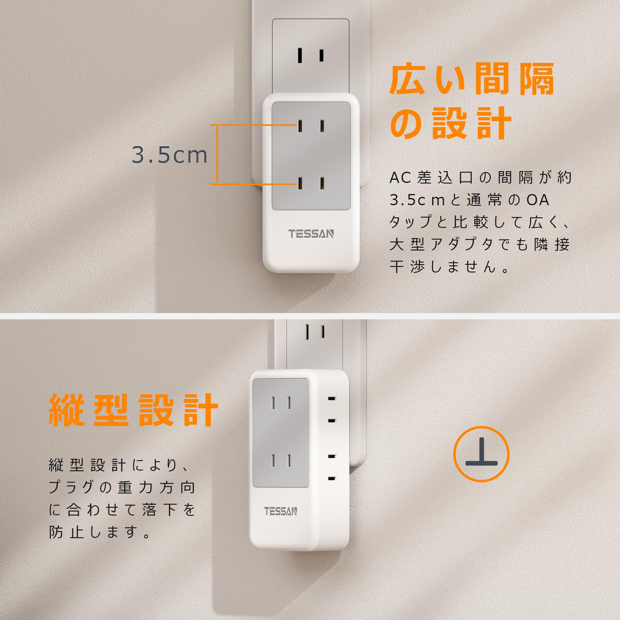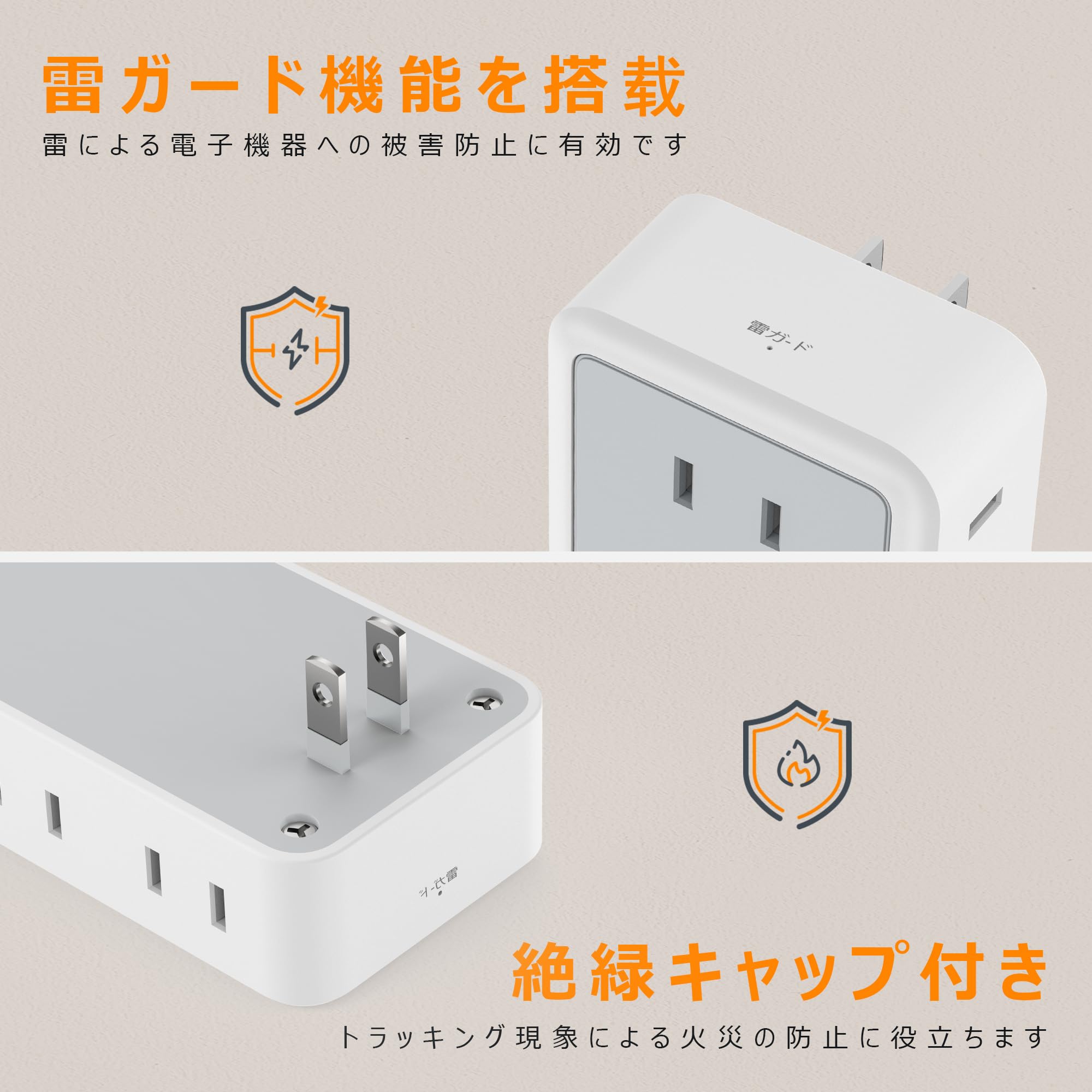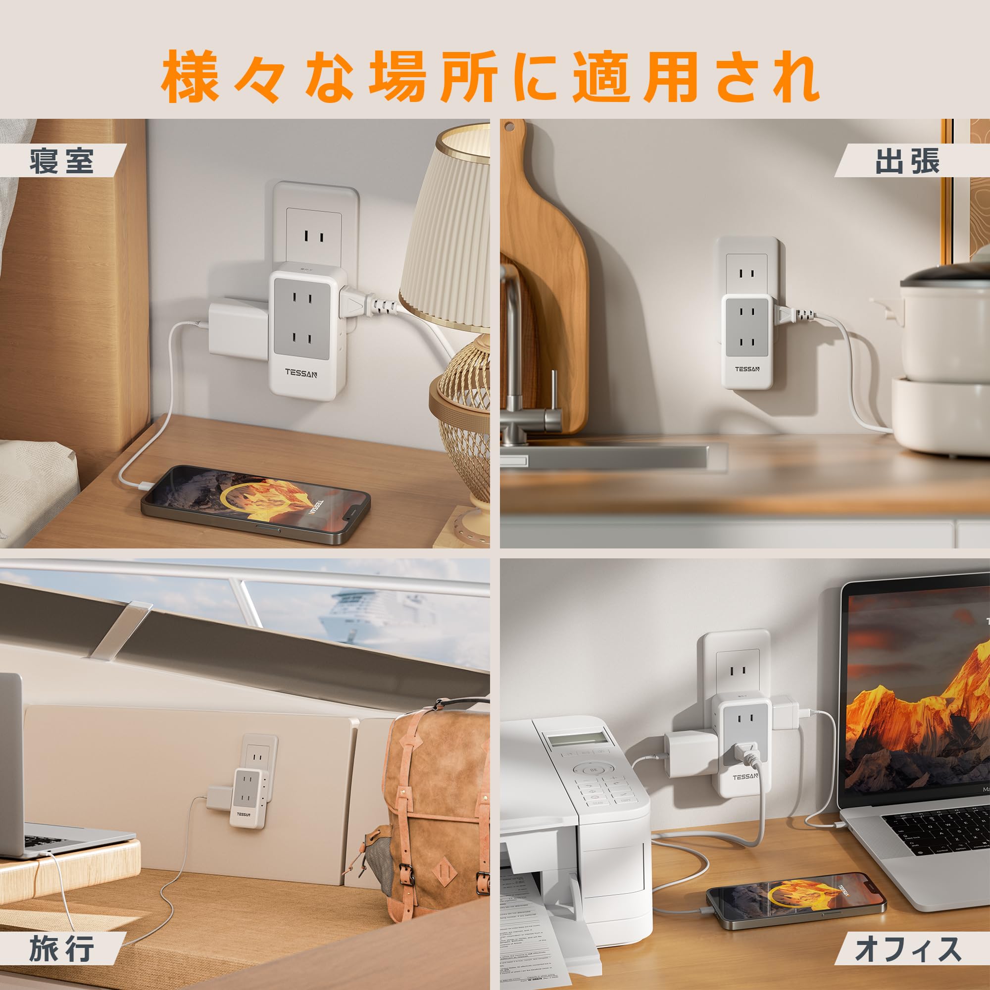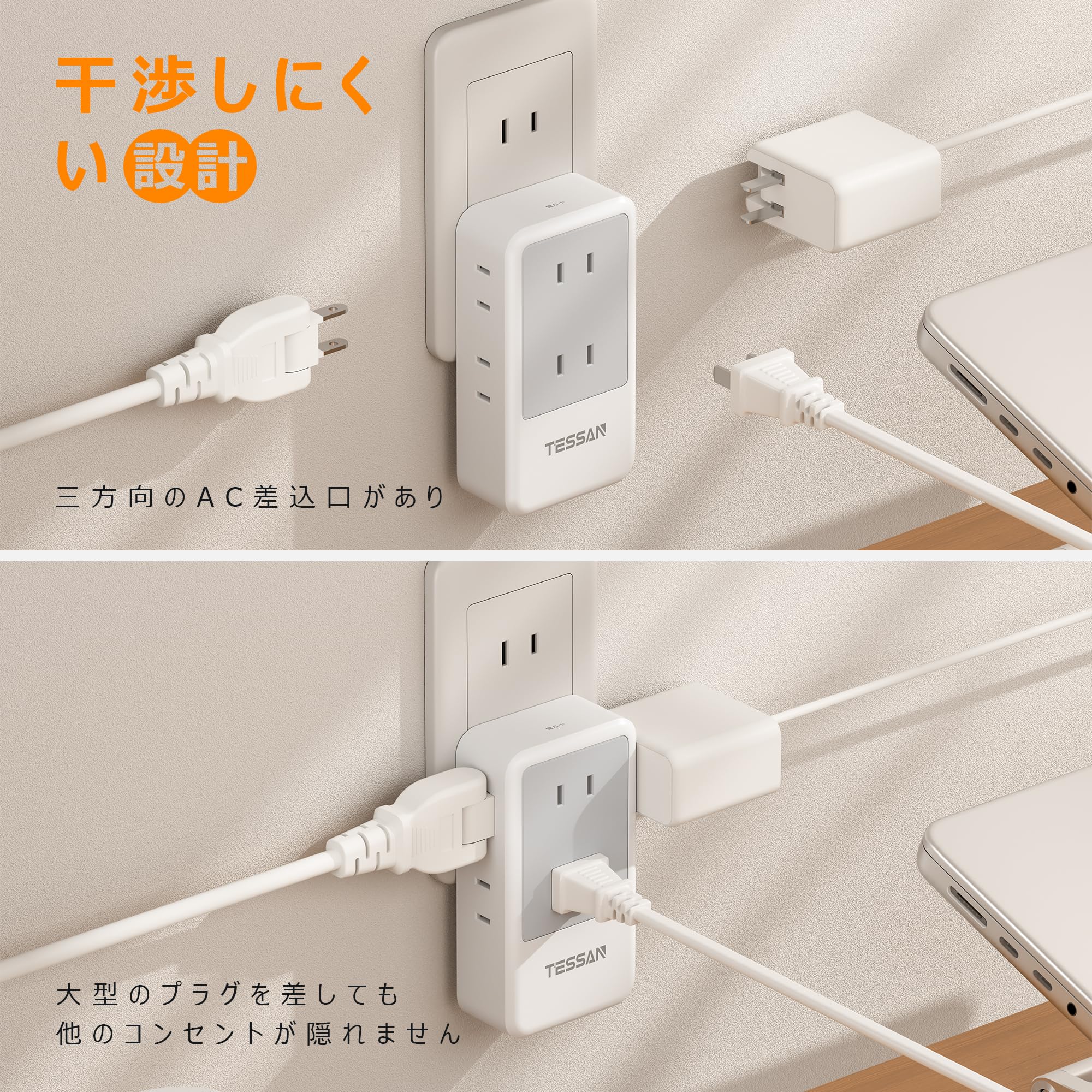 コンセントタップ 雷ガード 電源タップ たこあしコンセント l字 TESSAN タコ足配線 マルチタップ 分岐 たこあし配線 コンパクト 3つ方向 充電 雷サージ 縦型 小型 耐熱性素材採用 絶縁キャップ付き
