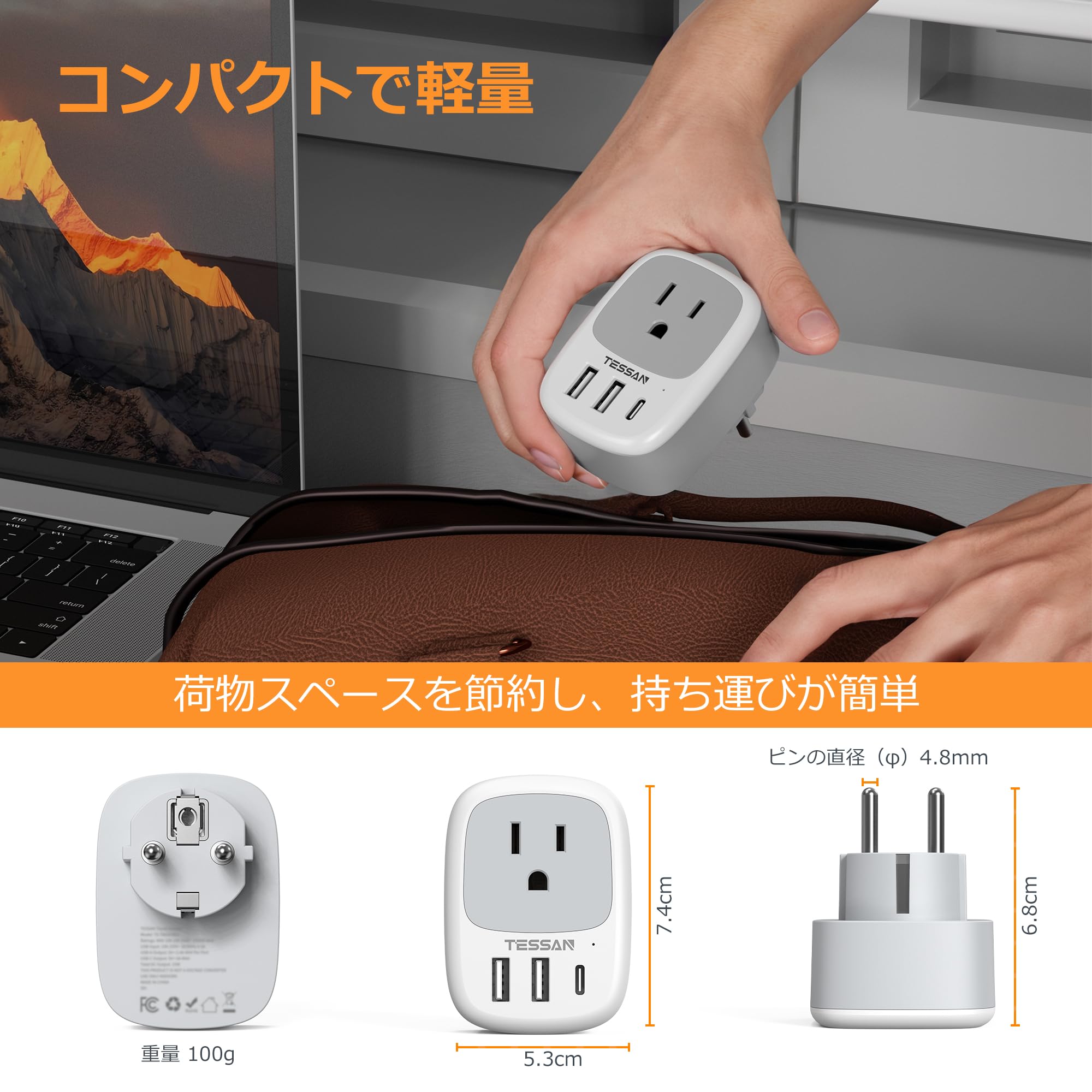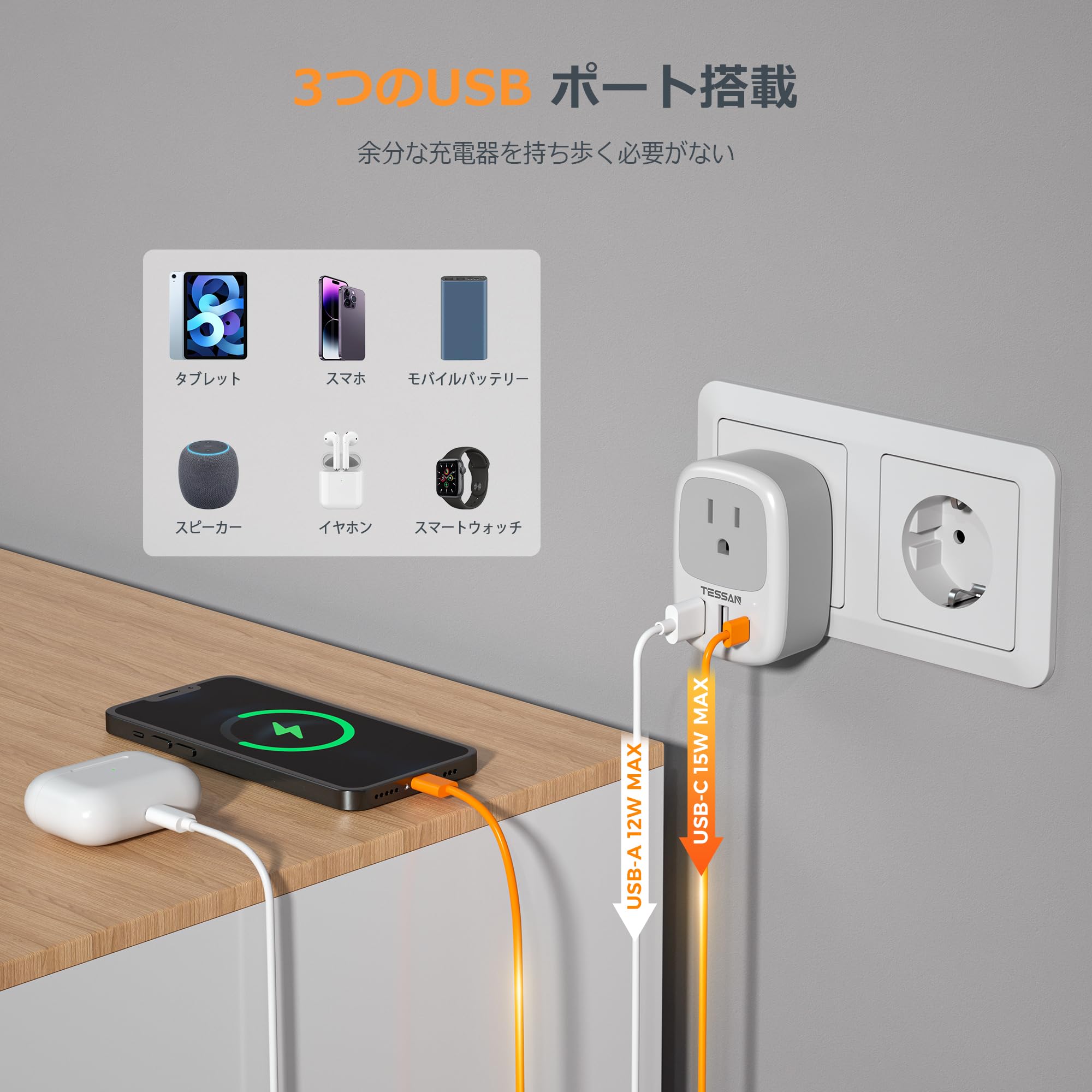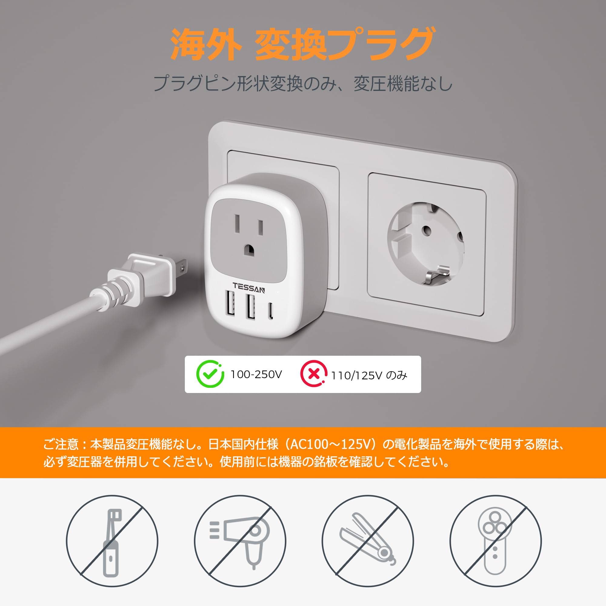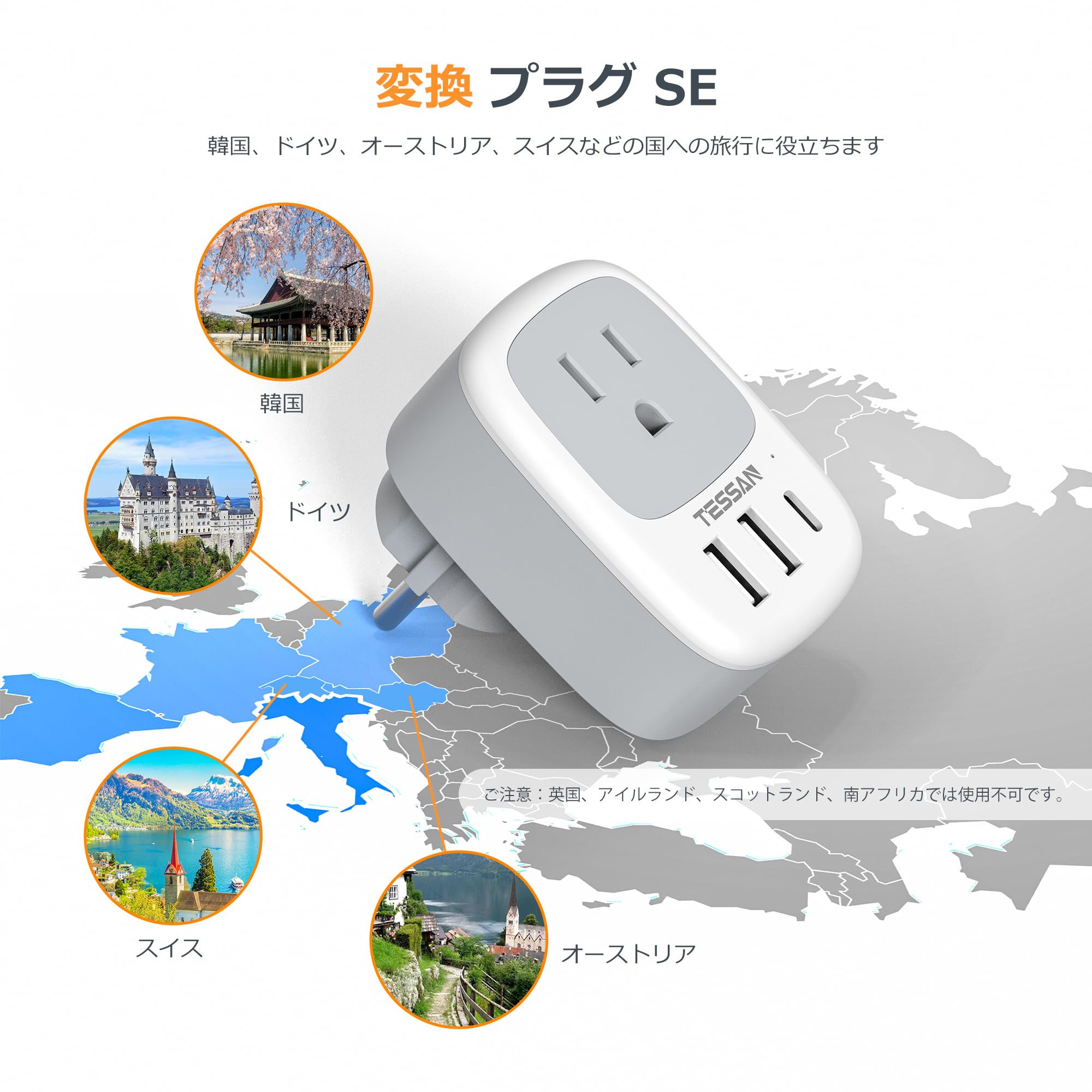 韓国 変換プラグ seタイプ TESSAN 海外 変換プラグ se コンセント 1個AC口 2USB-Aと1USB-Cポート 韓国 ドイツ フランス オランダ ハンガリー スペイン ヨーロッパなどへ海外旅行用便利グッズ