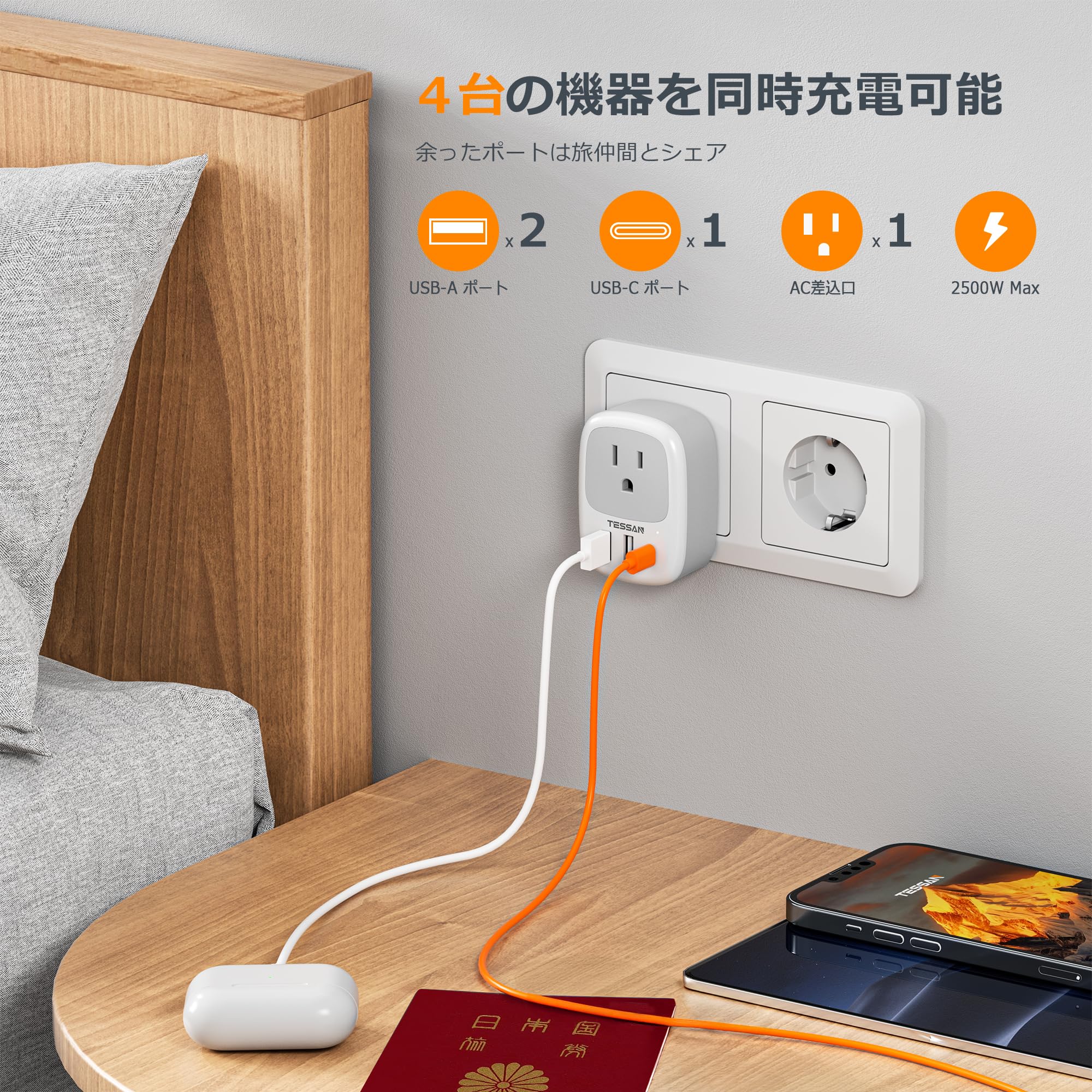 変換プラグ Cタイプ 海外旅行用 韓国 変換プラグ TESSAN USB-C付き 4個AC差込口 2個Type-A 2個Type-C イタリア スペイン ドイツ ベトナム オーストリア ヨーロッパなどの国に対応 変換器