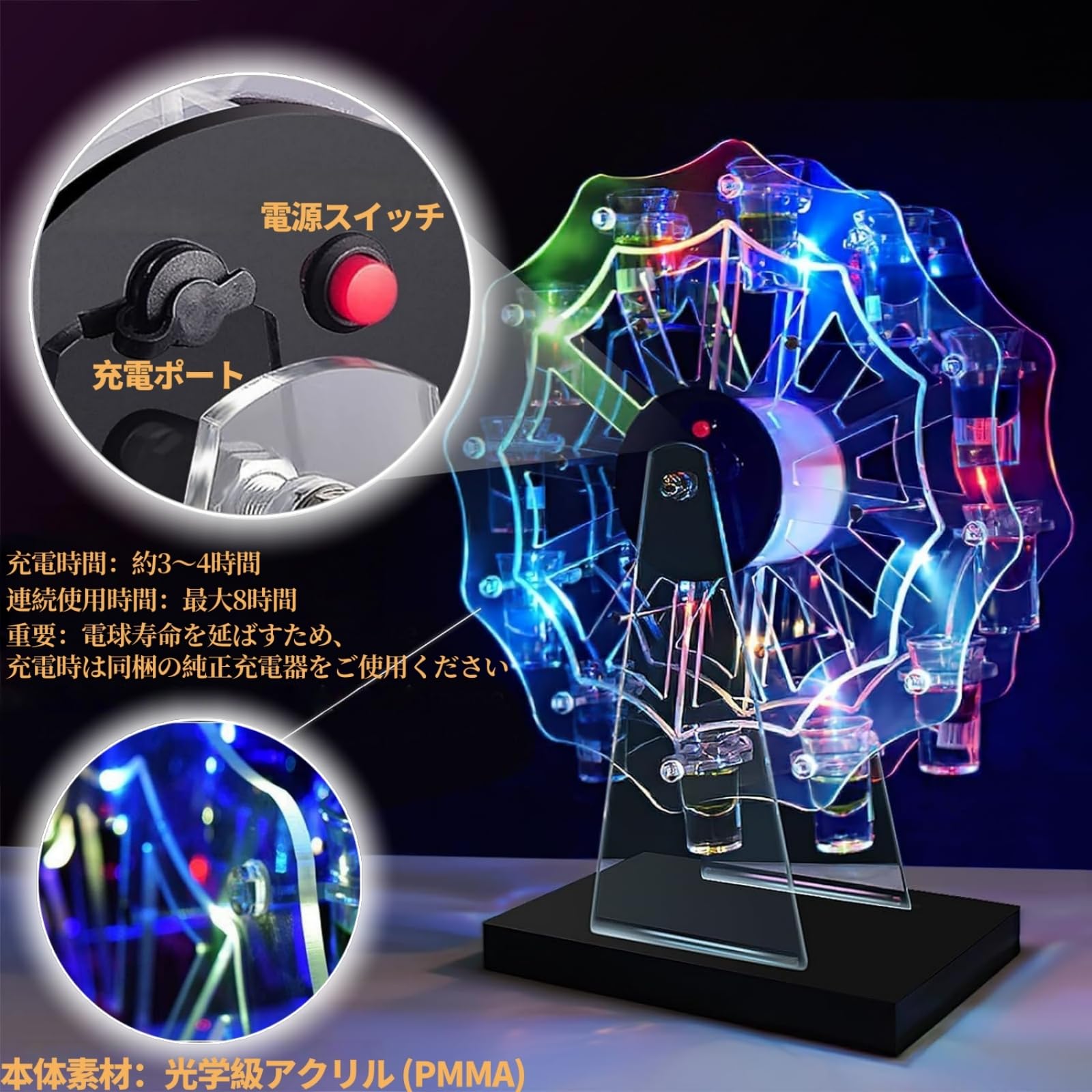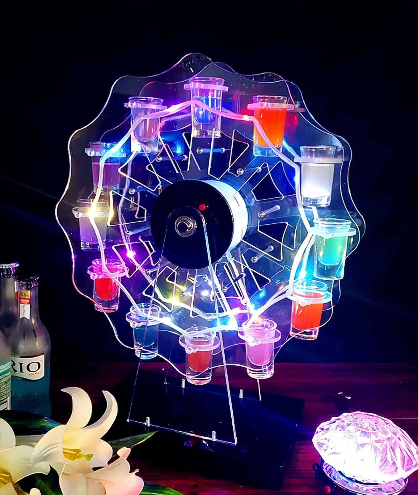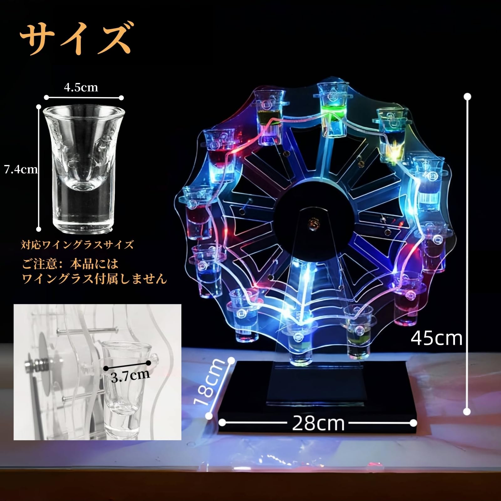 WoRefCra テキーラ観覧車 LED酒ボトルの表示棚 酒グラススタンド 25mlグラス12個付き 充電式 自動カラーチェンジ バー パーティー 忘年会 誕生日 クリスマス 贈り物 卓上自立型 USBコードレス KTV/ナイトクラブ/居酒屋対応 (ワイングラスは付属しません)