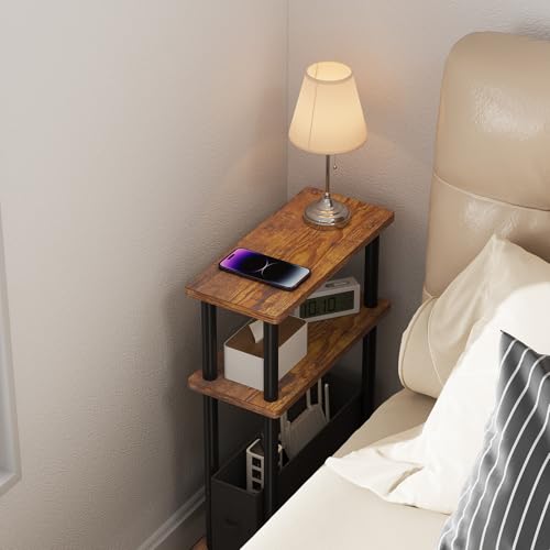 APICIZON サイドテーブル スリム ナイトテーブル 布製引き出し付き ミニテーブル 木目調 収納棚付き ベッドサイド ソファサイド ラック おしゃれ 小さい ベッド横 カフェテーブル (40cm*18cm*62cm、ブラウン)