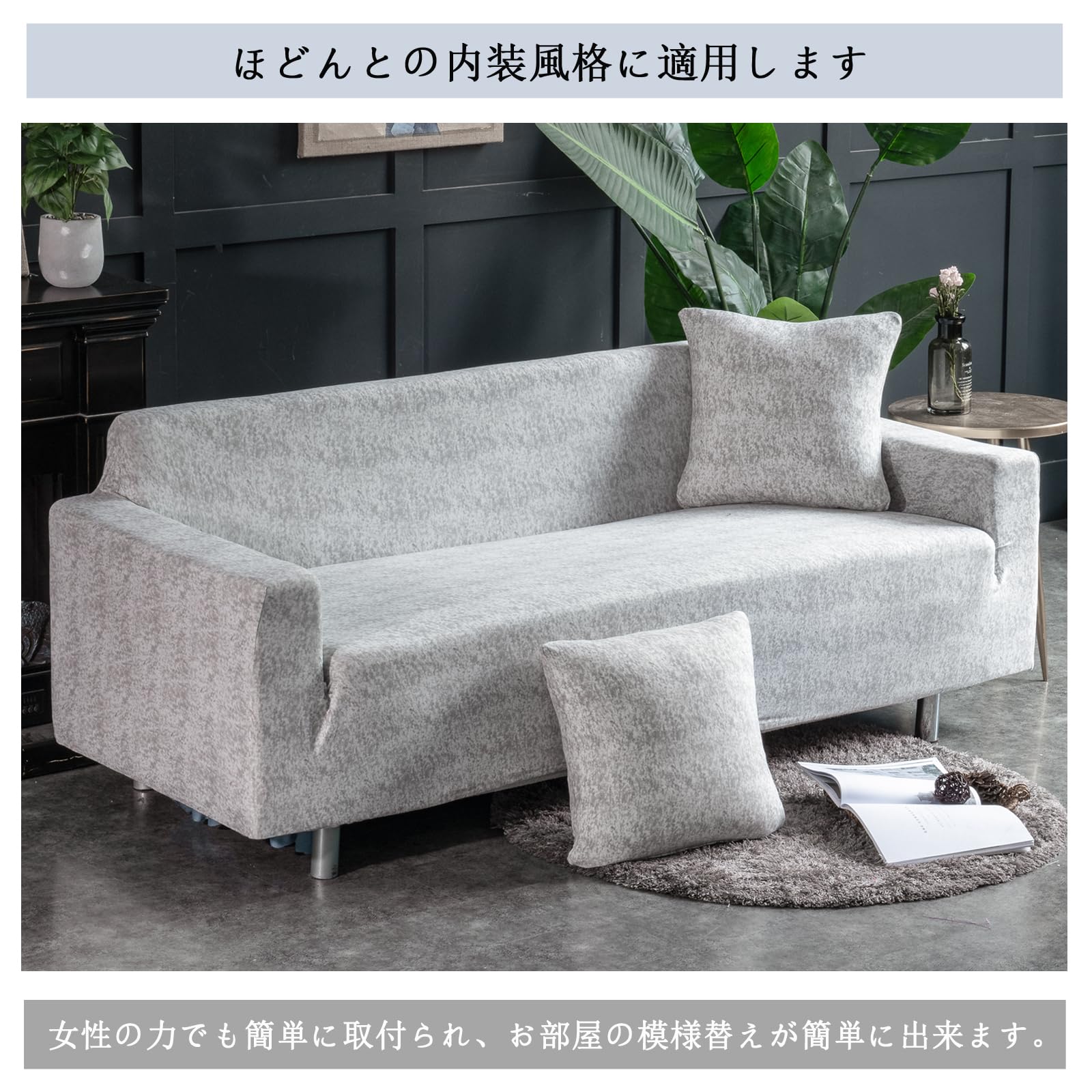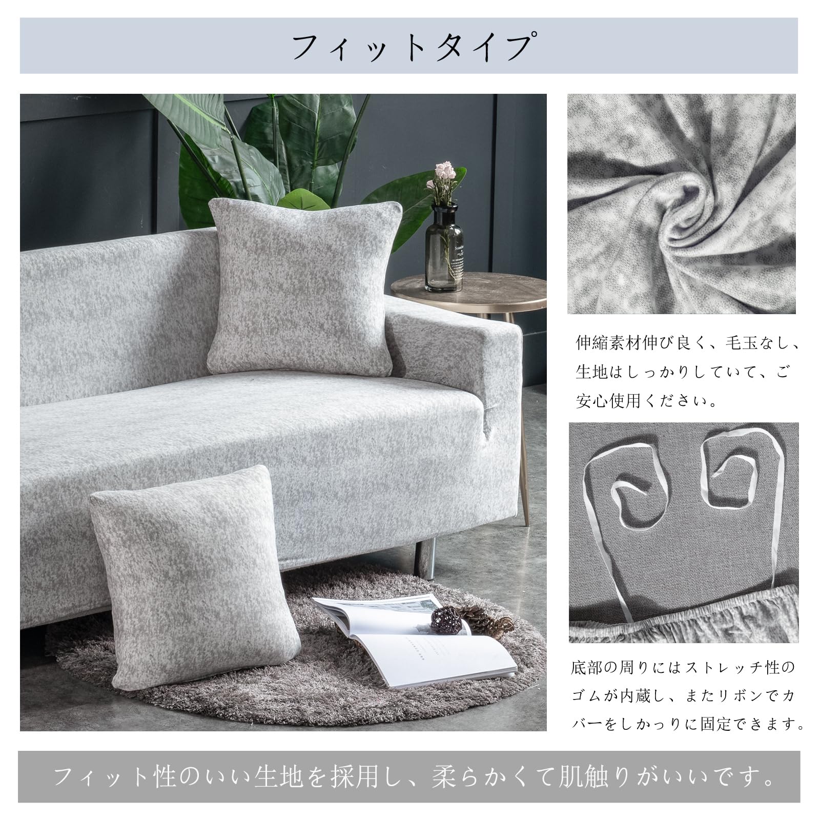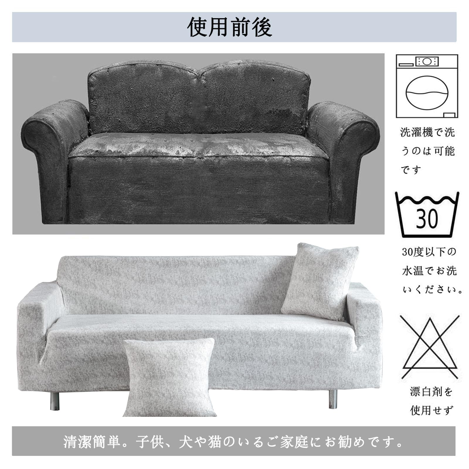 HomeFirst ソファーカバー 3人掛け 肘付き 無地 クッションカバー2枚付 北欧風 ストレッチ フィットタイプ 伸縮素材 柔らかい 滑り止め キズ防止 犬 猫 傷 防止 四季適用 超便利 (ホワイト・ グレー)
