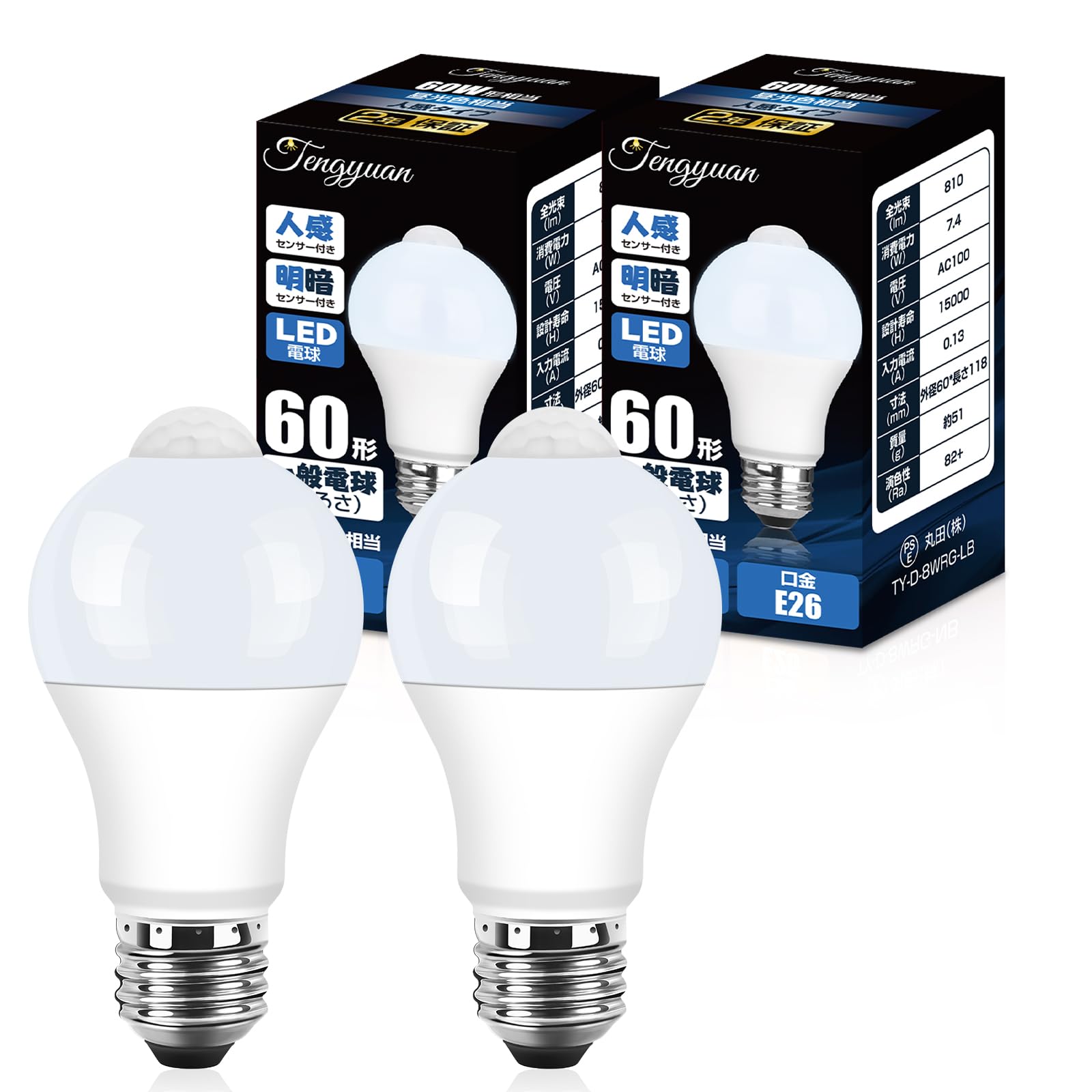 Tengyuan LED電球 E26口金 人感センサー電球 60W形 7.4W 810lm 昼光色 自動点灯 消灯忘れ防止 明暗センサー付き 調光不可 省エネ 玄関 廊下 階段 2個入