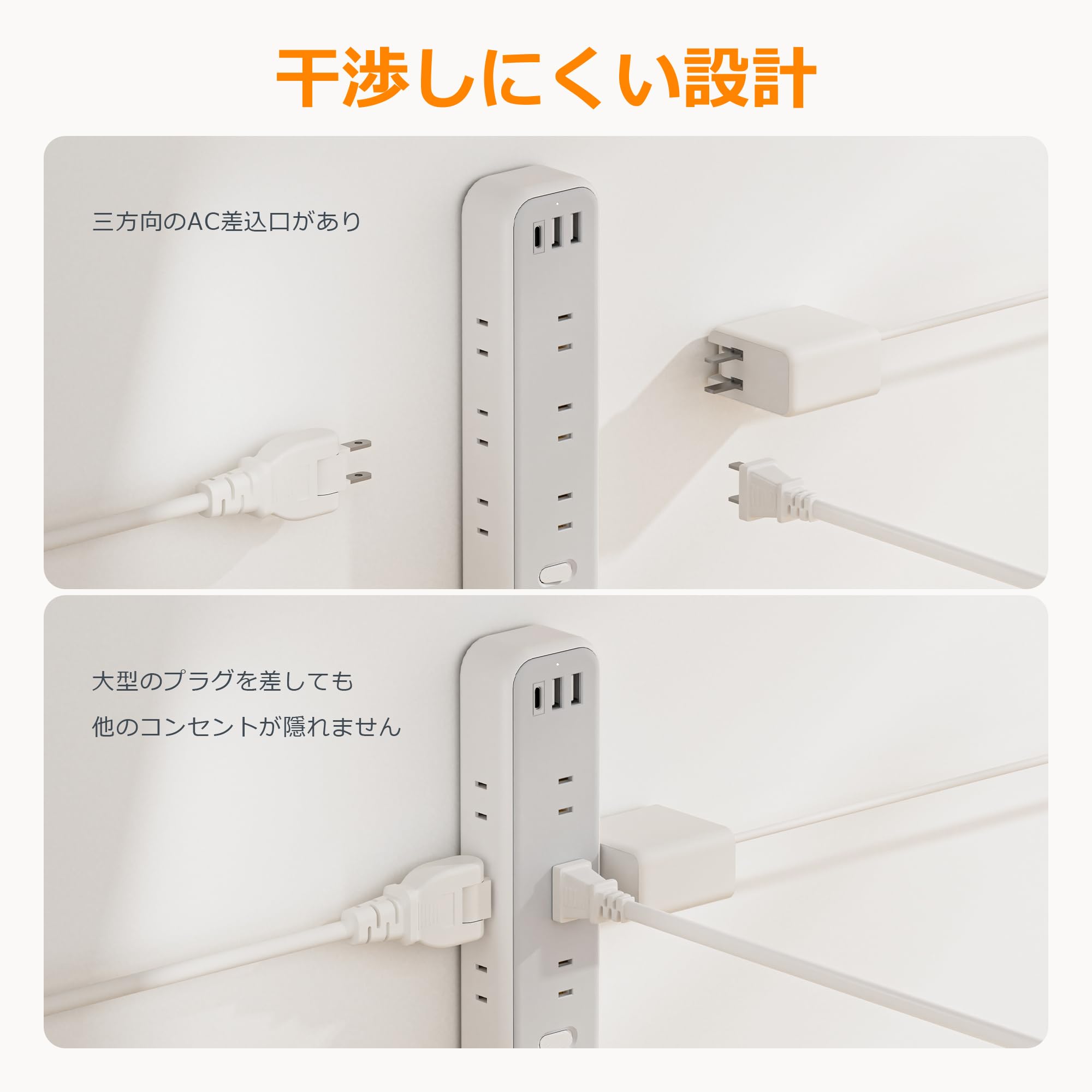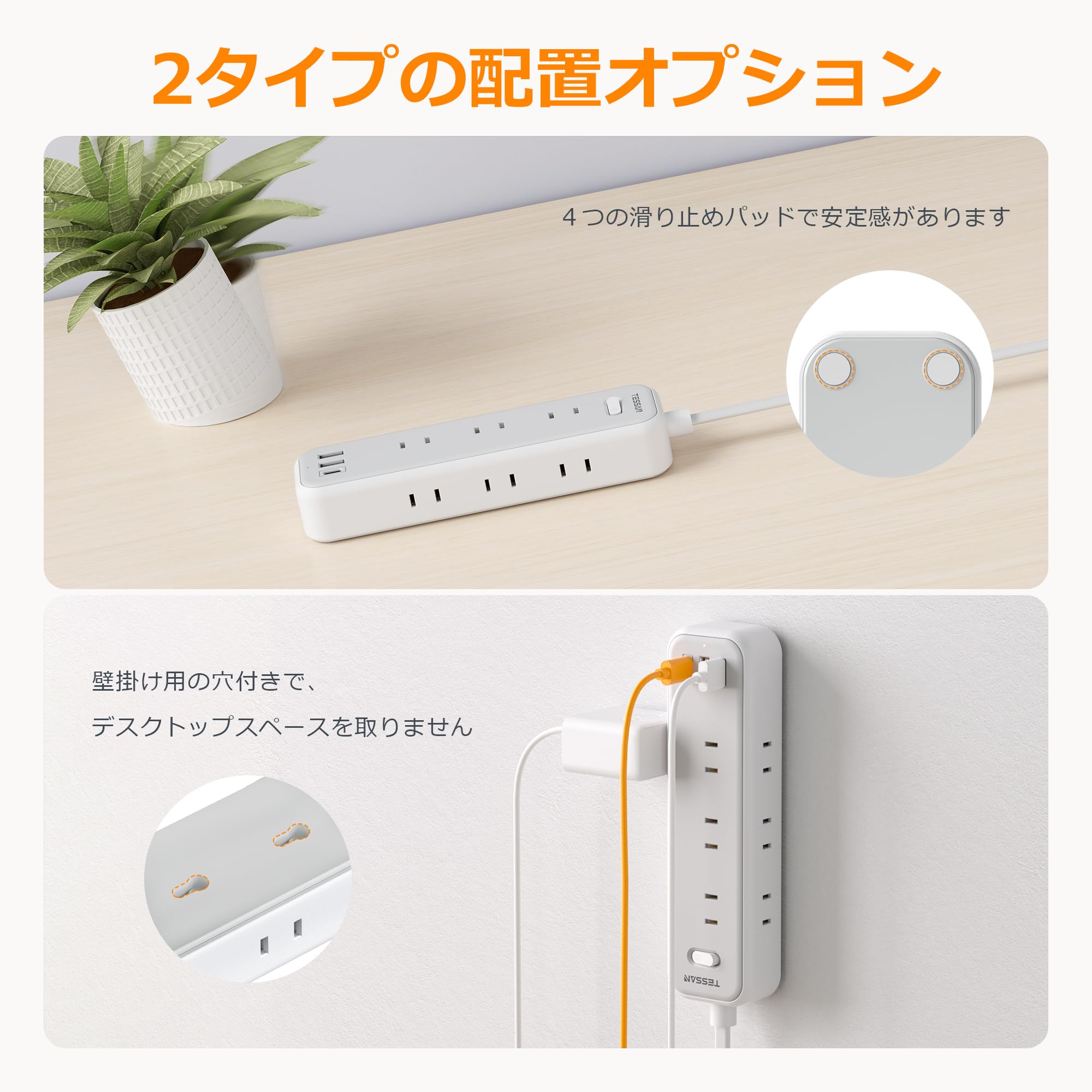 TESSAN 延長コード 2m 電源タップ usb付き type-c コンセントタップ 4個AC口 1USB-Cポート 2USB-Aポート テーブルタップ 蛸足コンセント oaタップ コンセント スイングプラグ 壁掛け式/卓上に 小型軽量 出張/旅行