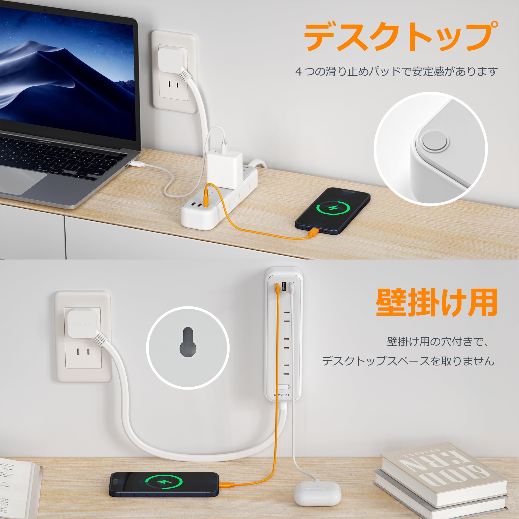 延長コード 2m 超薄型 (8-in-1, 20W PD) usb コンセントタップ TESSAN 電源タップ usb付き 隙間 AC差込口 4個口 Type-C 2ポート USB-A 2ポート薄型プラグ タコ足配線 たこあしコンセント 分岐 電源コード 出張 旅行 テーブル 卓上 ホワイト