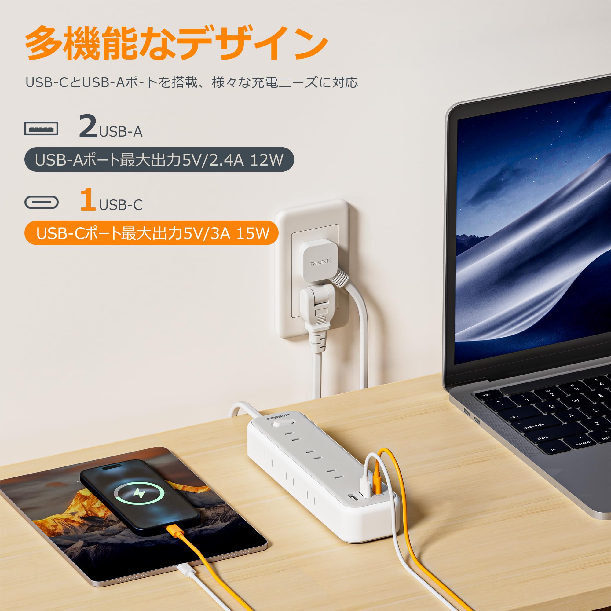 電源タップ usb付き 個別スイッチ付き 延長コード 2m usb コンセント TESSAN 8個AC口 3個USB-Aポート 1個USB-Cポート テーブルタップ 壁掛け マルチタップ oaタップ 蛸足コンセント タコ足配線 節電 タップ 省エネ 雷ガード